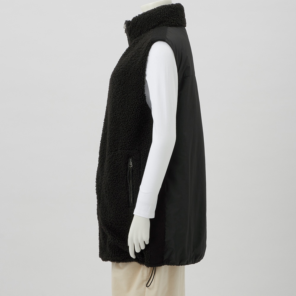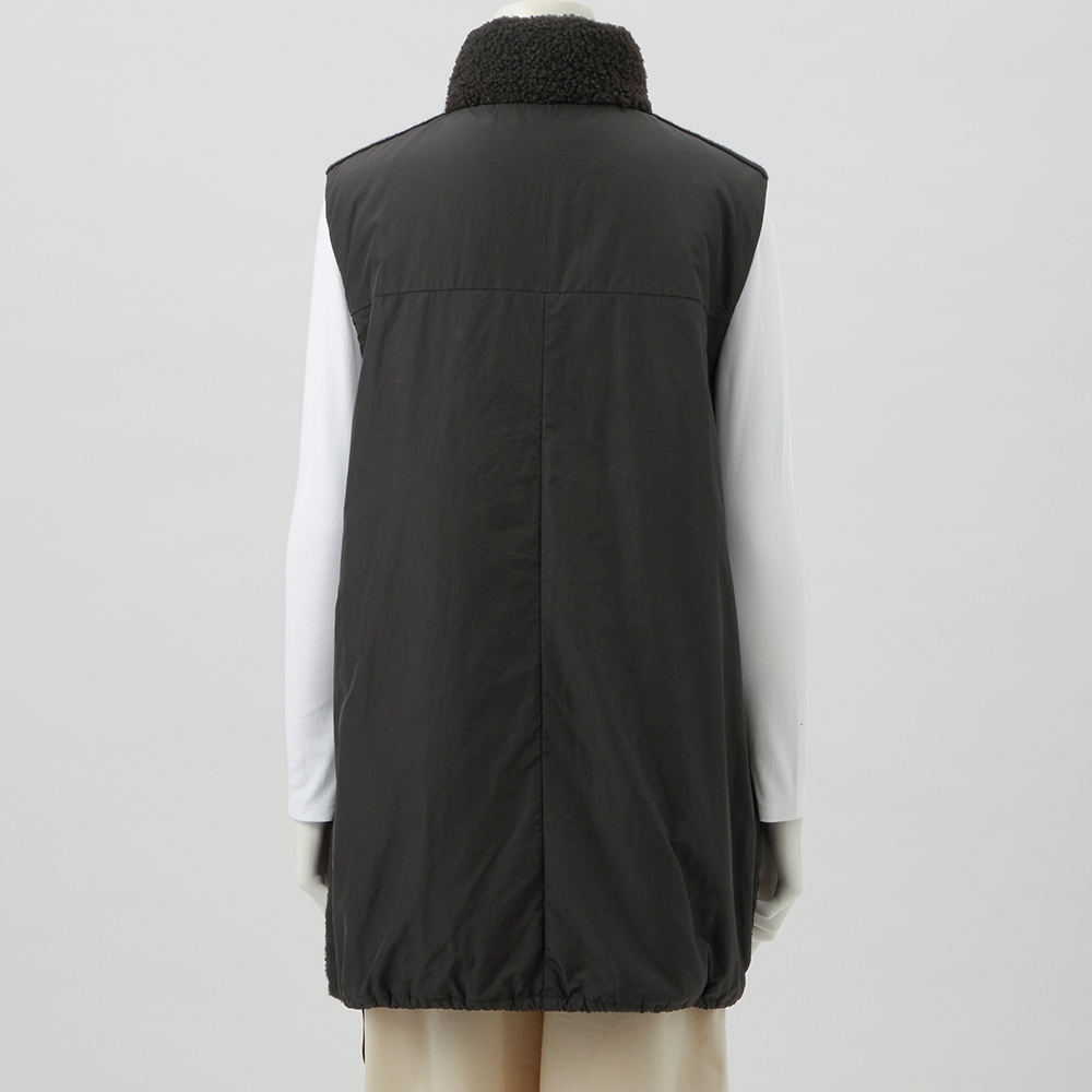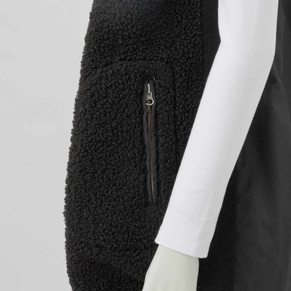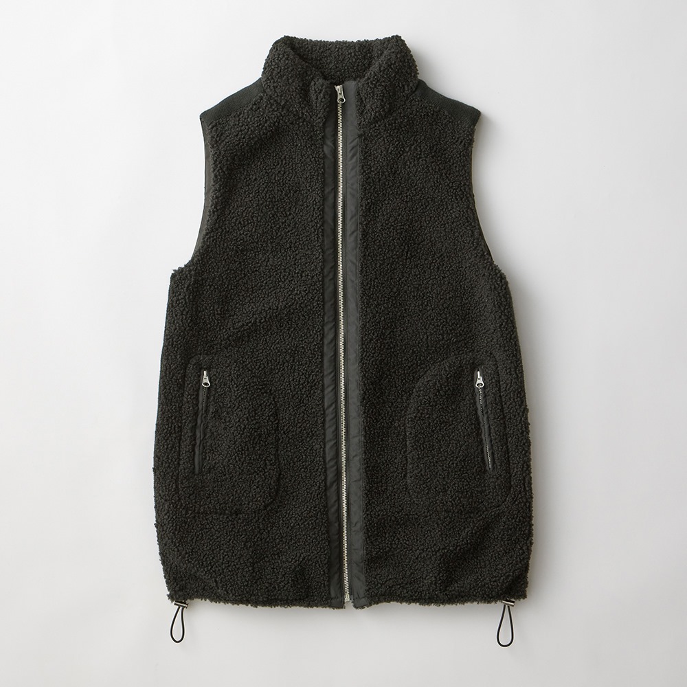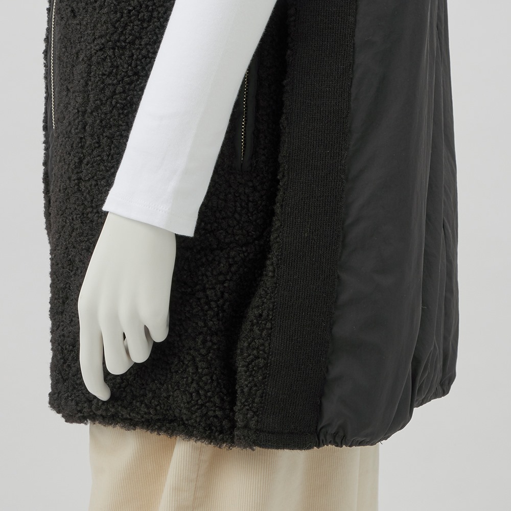中綿入りの布帛とボアを組み合わせて、スポーティーでキレの良い印象に仕上げたロングジレ。前中心は布帛でくるみ、シルバーのムシ見せファスナー仕様にしました。両脇と肩にあしらったニットテープがボアの誇張感を無くし、異素材コンビの良さが光る一品です。すっぽり腰を覆う丈が温もりプラス。裾に施した丸ゴムでコクーンシルエットに調整も可能です。首を包み込むよう襟は高めに設定しているので、マフラー要らずの暖かさ。ポケットは異素材を使った両玉縁ポケットでアクセントにしています。