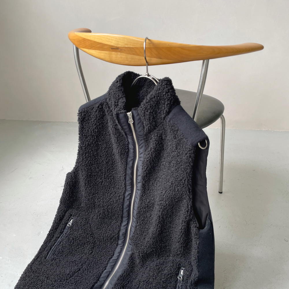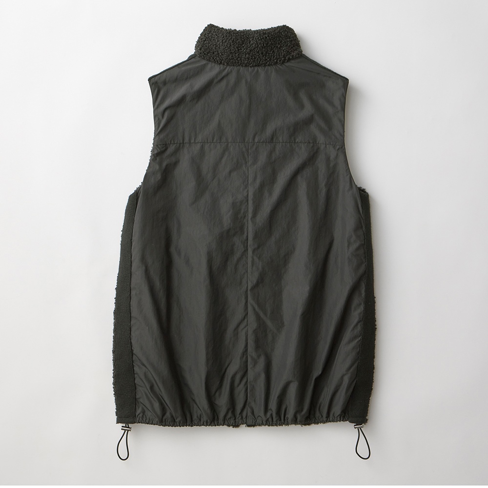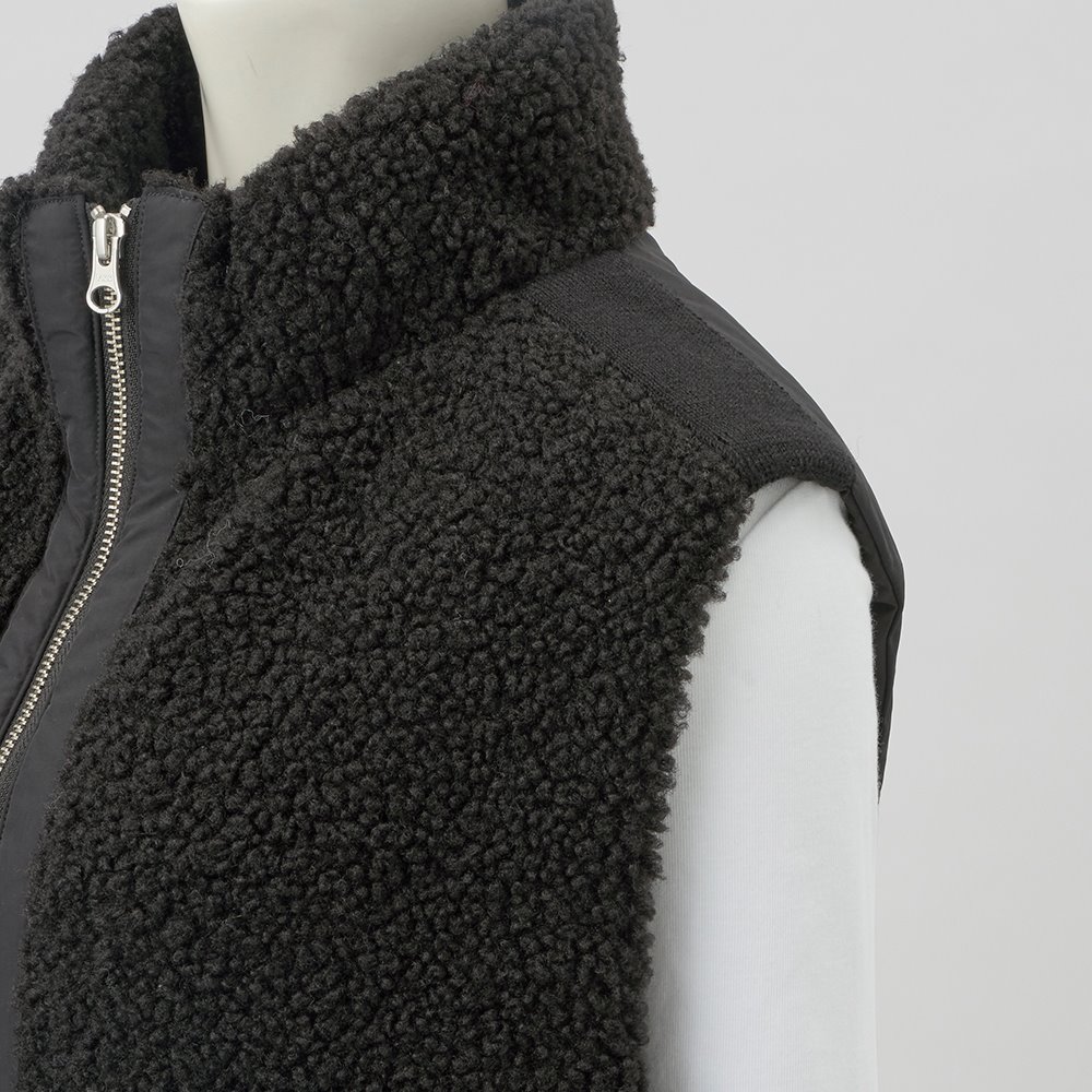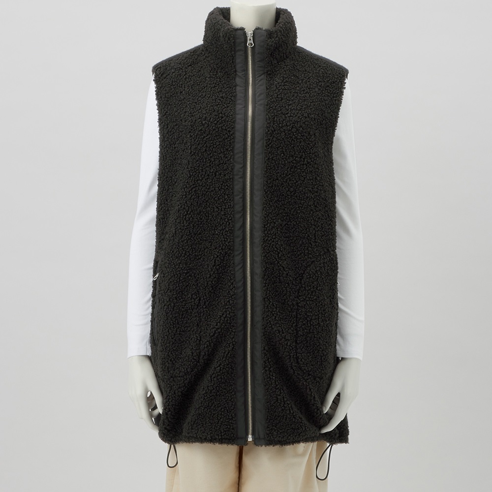 中綿入りの布帛とボアを組み合わせて、スポーティーでキレの良い印象に仕上げたロングジレ。前中心は布帛でくるみ、シルバーのムシ見せファスナー仕様にしました。両脇と肩にあしらったニットテープがボアの誇張感を無くし、異素材コンビの良さが光る一品です。すっぽり腰を覆う丈が温もりプラス。裾に施した丸ゴムでコクーンシルエットに調整も可能です。首を包み込むよう襟は高めに設定しているので、マフラー要らずの暖かさ。ポケットは異素材を使った両玉縁ポケットでアクセントにしています。