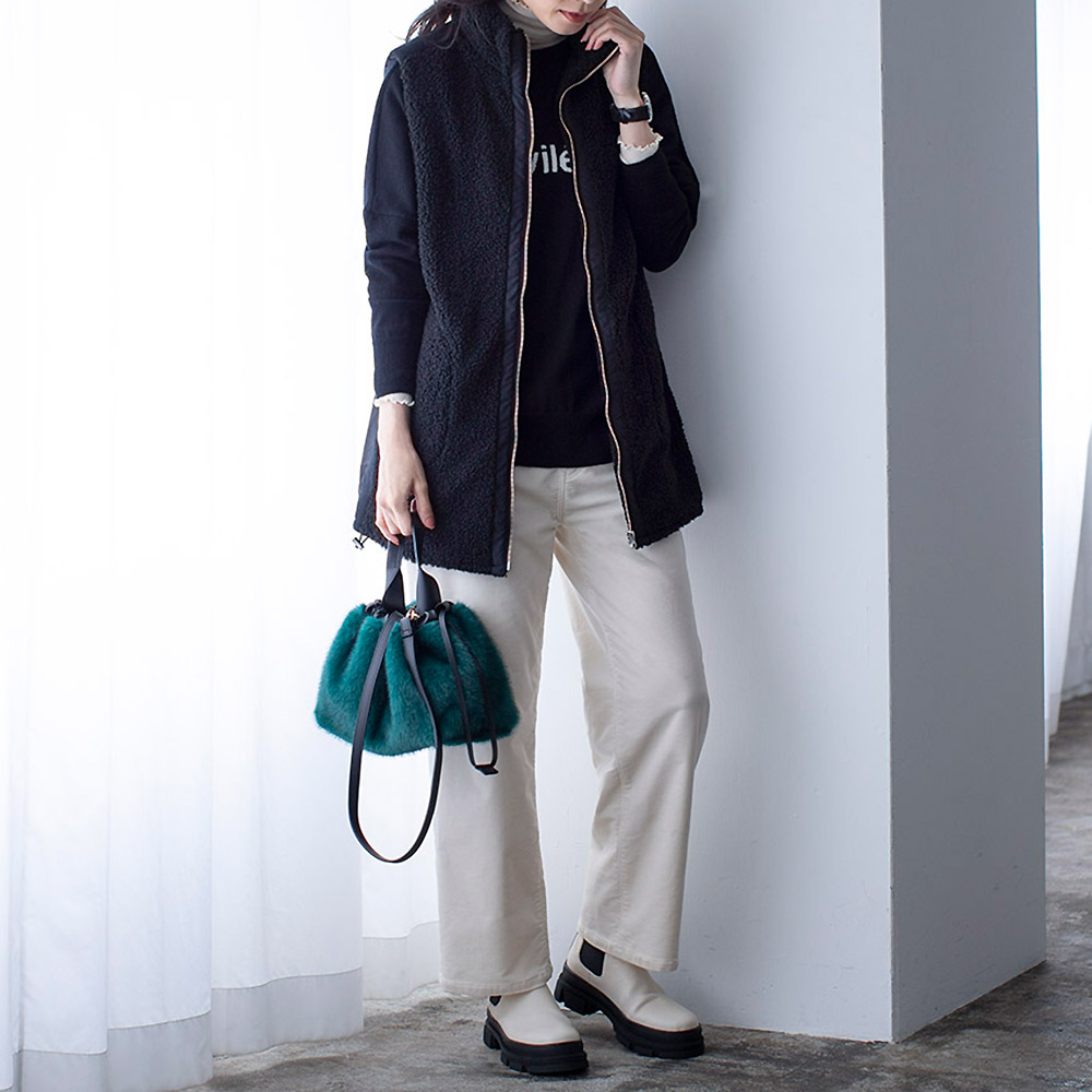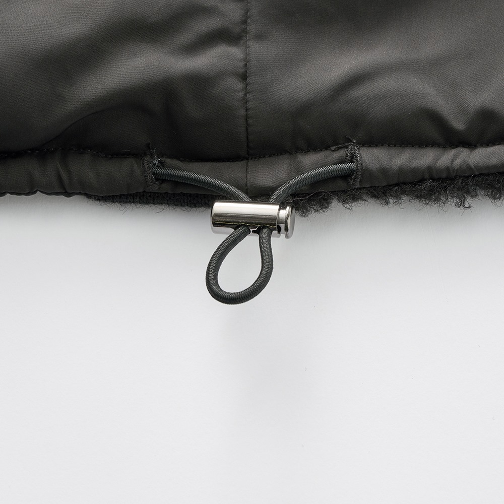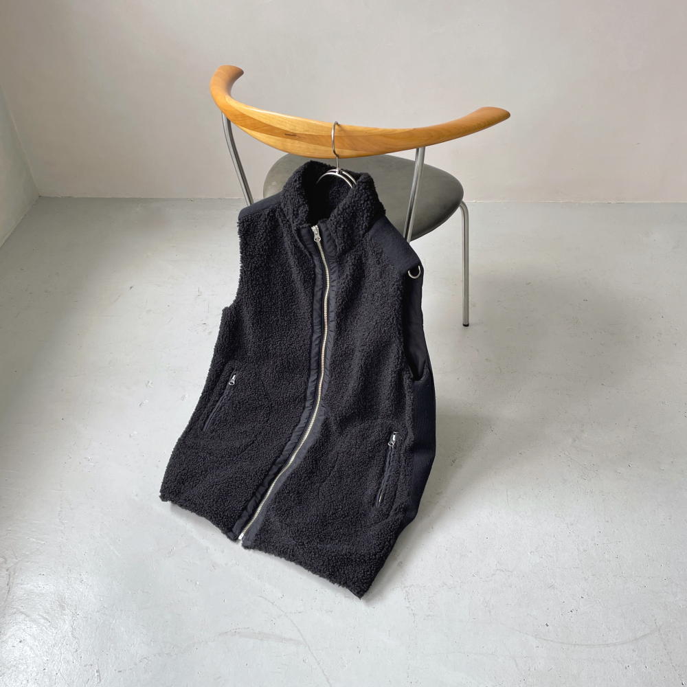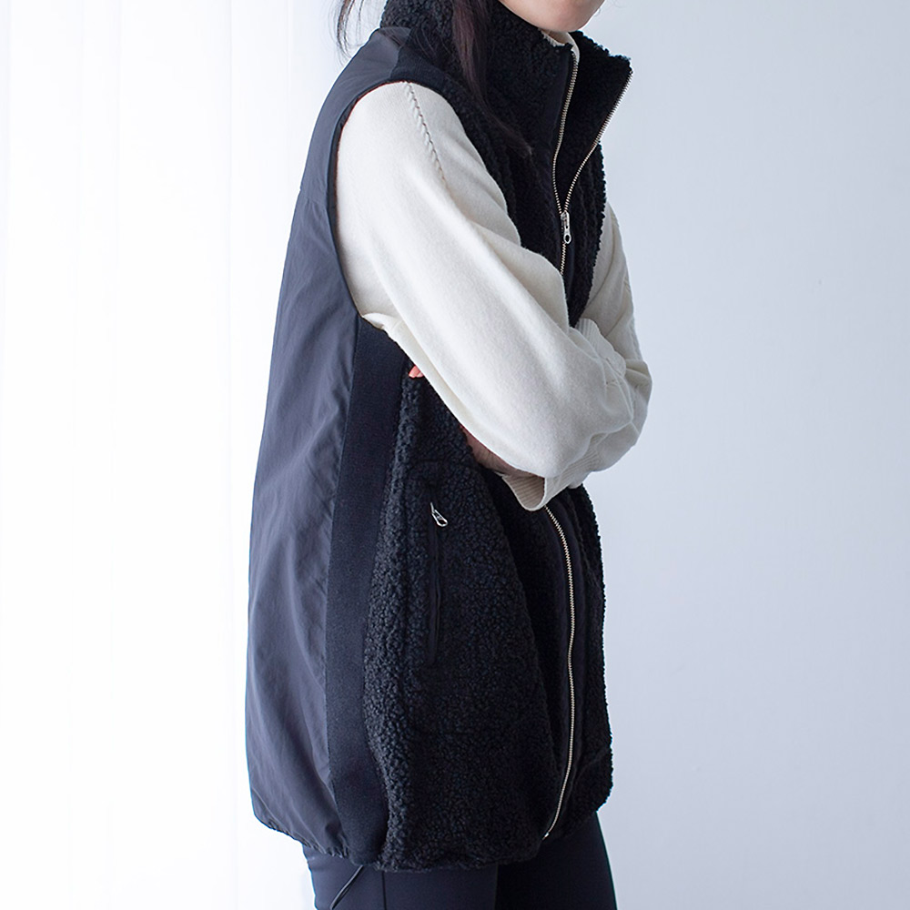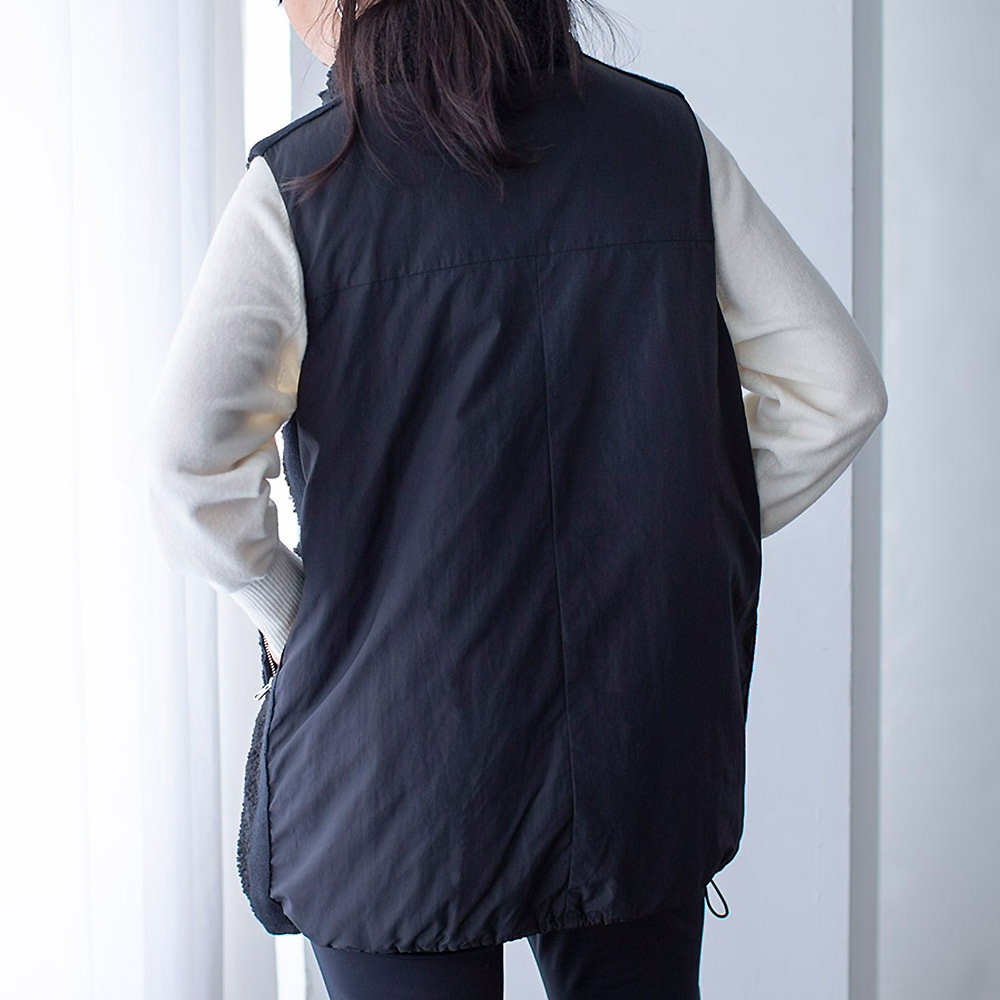 中綿入りの布帛とボアを組み合わせて、スポーティーでキレの良い印象に仕上げたロングジレ。前中心は布帛でくるみ、シルバーのムシ見せファスナー仕様にしました。両脇と肩にあしらったニットテープがボアの誇張感を無くし、異素材コンビの良さが光る一品です。すっぽり腰を覆う丈が温もりプラス。裾に施した丸ゴムでコクーンシルエットに調整も可能です。首を包み込むよう襟は高めに設定しているので、マフラー要らずの暖かさ。ポケットは異素材を使った両玉縁ポケットでアクセントにしています。