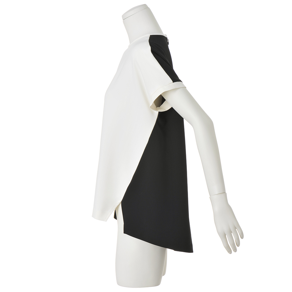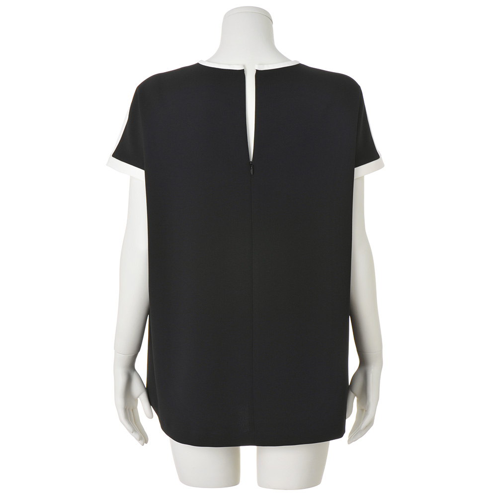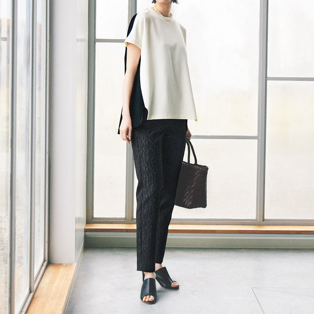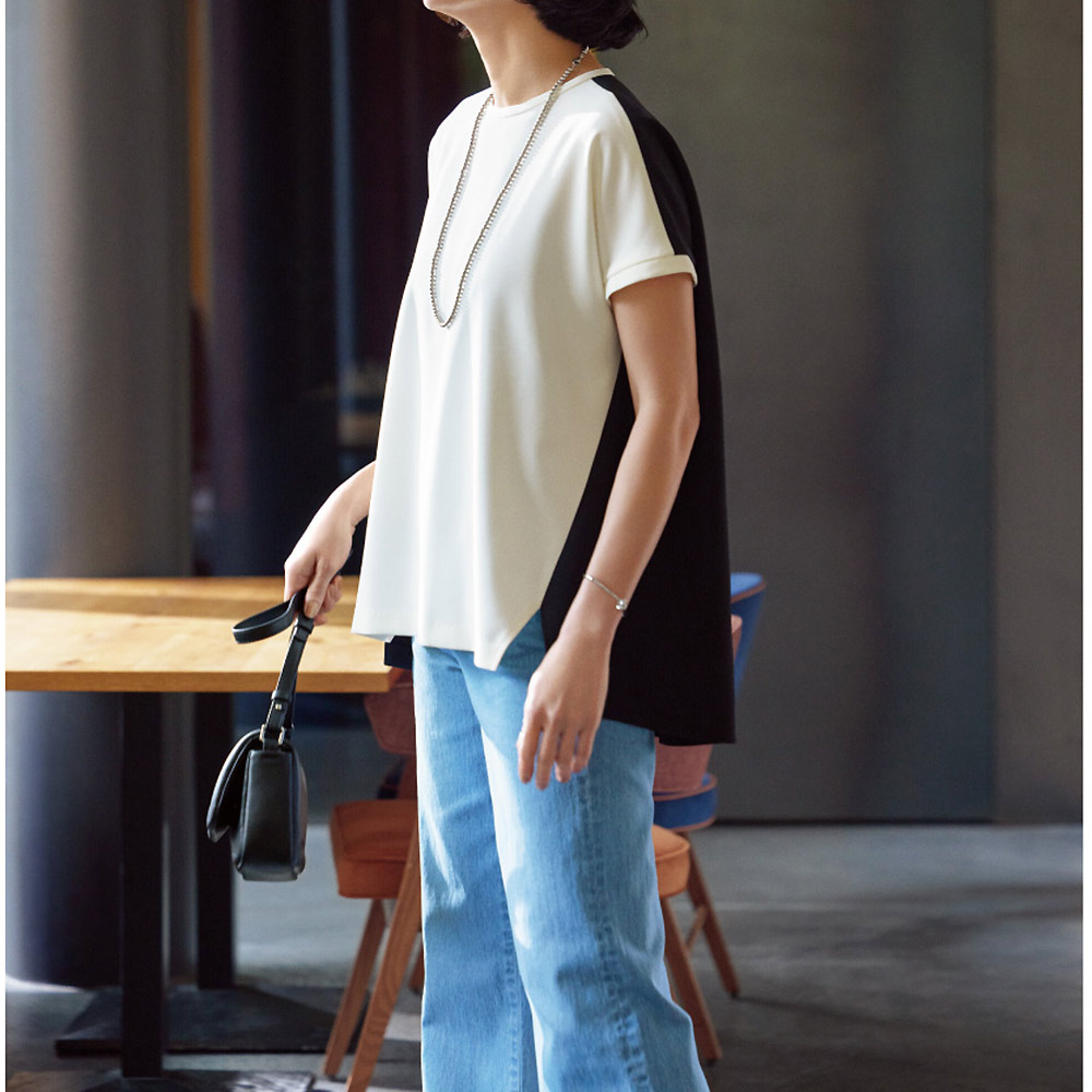 デニムスタイルでもあくまで「キレイめ」が大人流オフの日の着こなしを格上げするのは、前後で逆配色にしたホワイト×ブラックの洗練トップス。脇線を前に振ることで、両サイドのブラックが輪郭を引き締め、細見えに導きます。ぷるんとしたダブルクロスは、着心地も上々。小ぶりなクルーネックと袖口はホワイトで切り替えて、クリーンな印象に。≫ POINT前後で印象が変わる大胆なコントラスト配色。後ろ身頃はブラックでシャープに仕上げました。