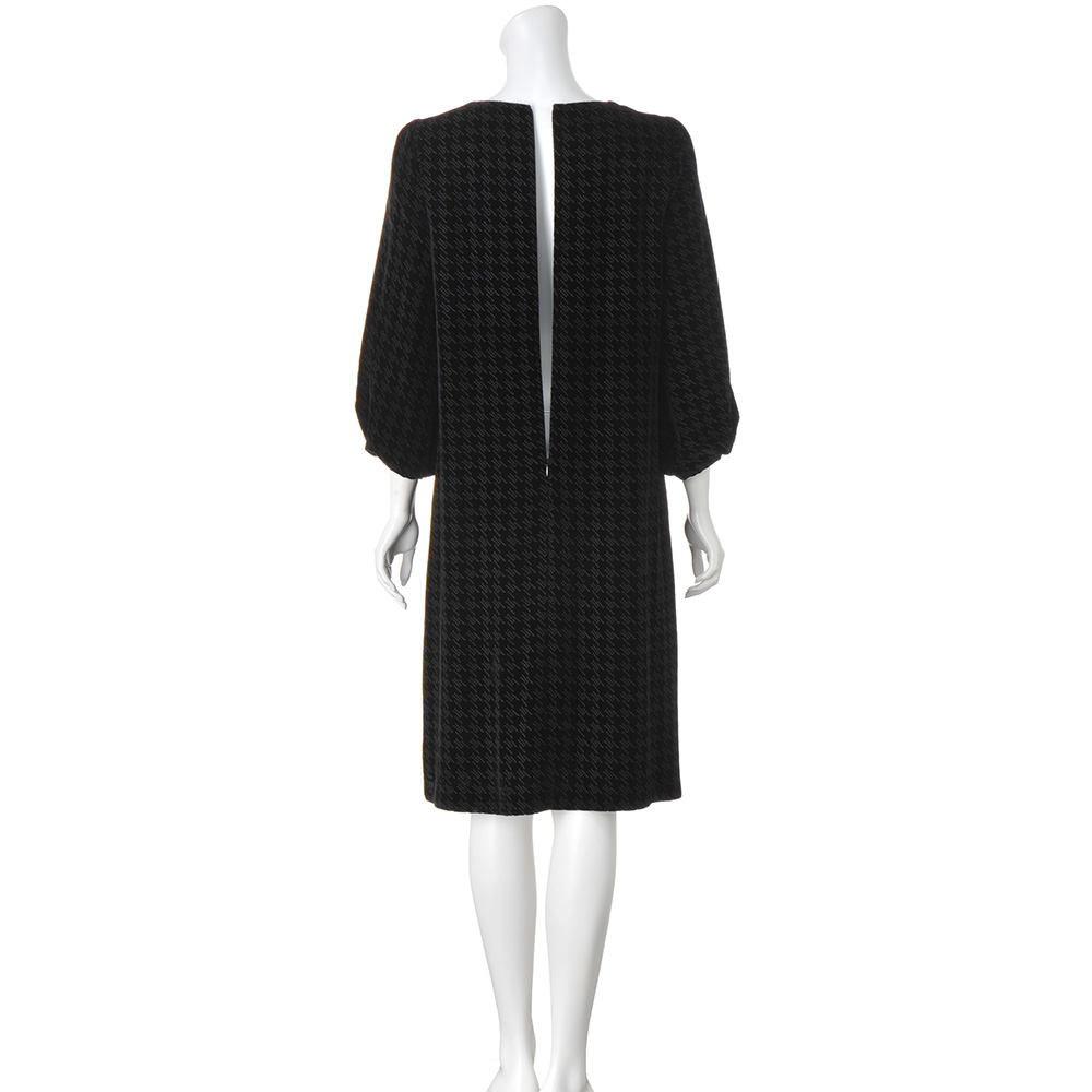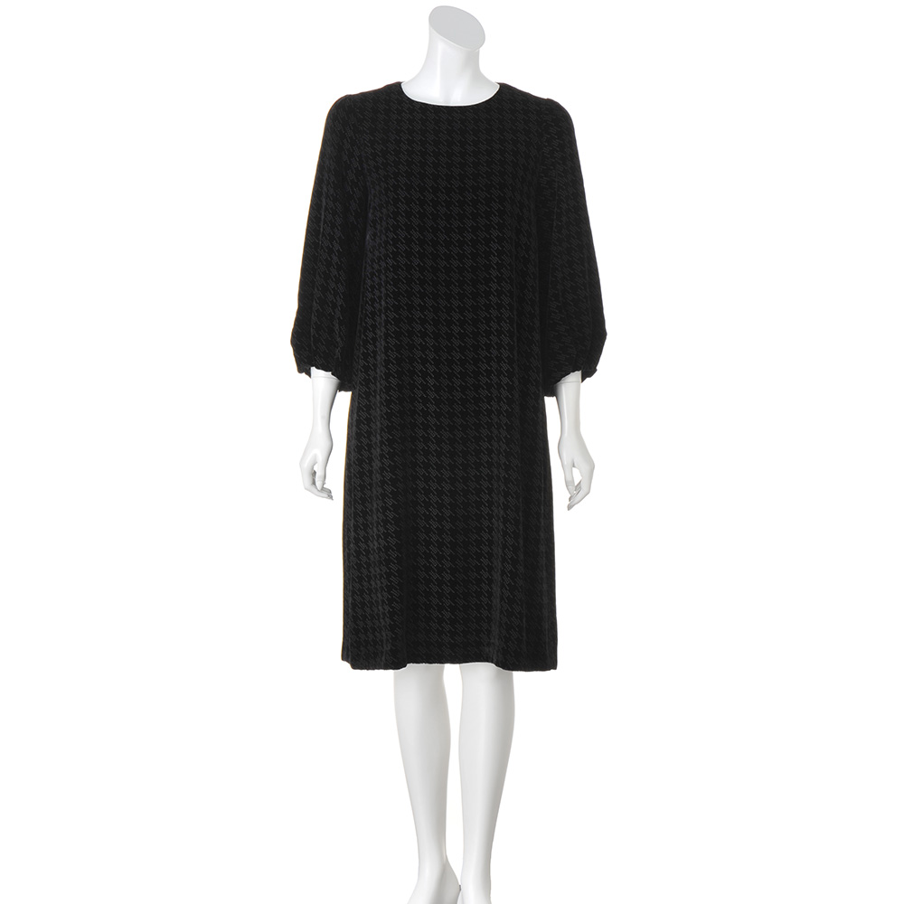 ネオ・クラシックな千鳥プリントのベルベット。深い艶を湛えた漆黒のシルク混ベルベットのなめらかな表面に、千鳥柄を顔料プリントで載せたイタリア素材のテクニカルな生地が、女性を優雅に輝かせるワンピース。豊かな陰影と共に浮かび上がる千鳥柄が主役だから、デザインはミニマルに徹しています。程良いゆとりでストンと落ちるスタイルカバー力のあるサックラインに、コンパクトな首元と肩、ふんわりとしたパフスリーブを合わせた甘辛バランスも秀逸!フォーマルからデイリーまで着用シーンの広い一着です。