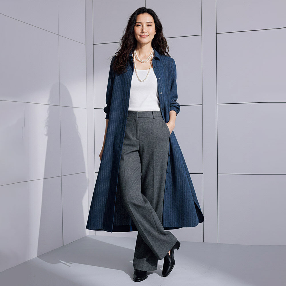 ブルー×白ストライプのマニッシュさに魅せられて。イタリア製のナチュラルなストレッチ感が心地良いウール混素材で仕立てた人気のシャツワンピースは、前をラフに留めたり全て開けて羽織りものにもなる着こなしの幅が広いデザイン。一見シンプルながら、背ヨーク下のタックでゆとりを持たせたテントラインシルエットに、前振りにした脇線でストライプ柄に変化をつけたり、裾のベントで抜け感を添えて。台襟付きのシャツカラー、比翼前立て、ワイドカフスで、素材の上質感に相応しい端正さもちりばめられています。≫ POINTホワイトストライプが映える深みとニュアンスのあるブルーは、わたの段階で染めたトップ糸を使っているから。カフスはボタンを上側に付け、折り返せる仕様に。