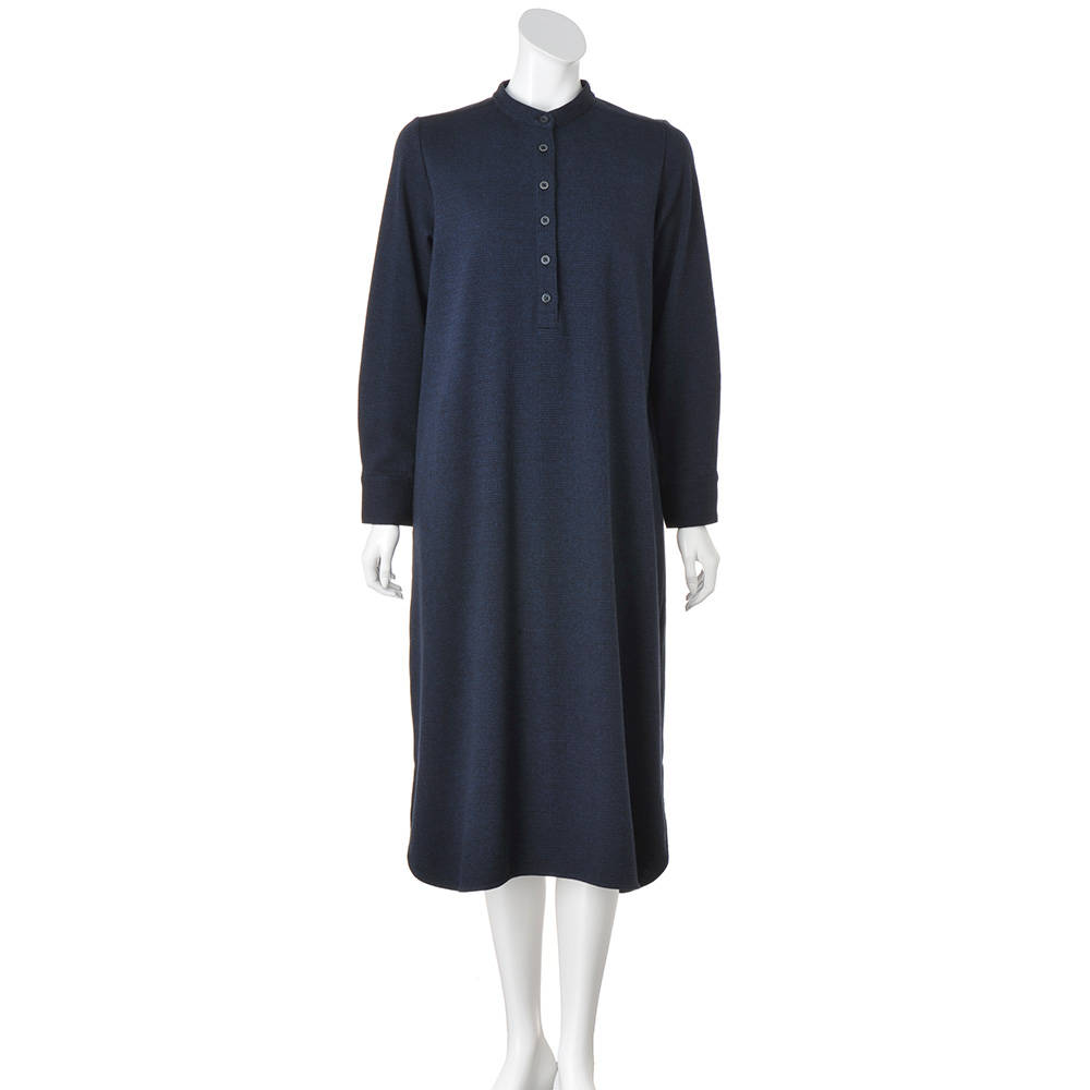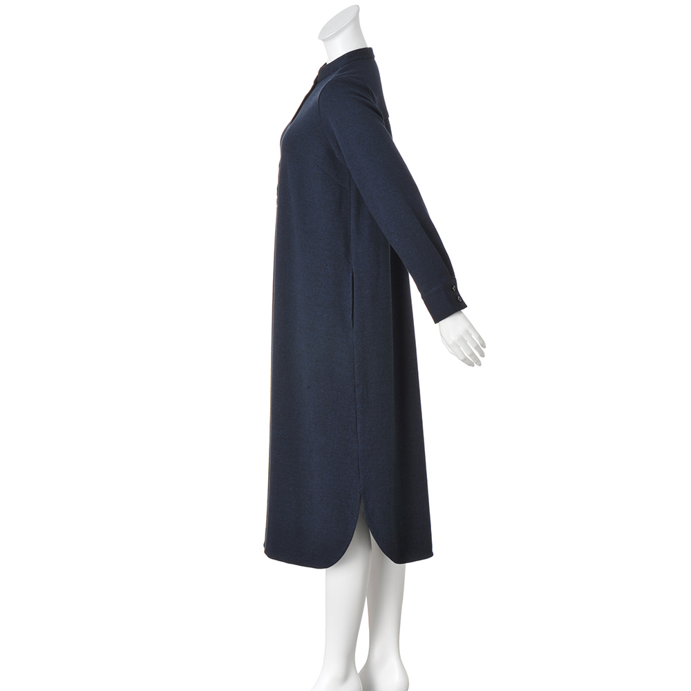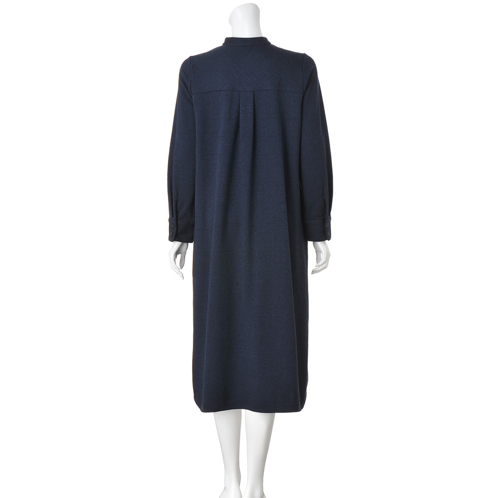 装いに迷う日も、スタイリッシュなデイリーピースがあれば。さっと楽ちんに着られてサマになるワンピースを手に入れたら、ひとまず安心。ダークネイビーが知的な印象のグレンチェック柄シャツワンピースにその役割を託しましょう。素材はしっかりとしてぬくもり感のあるウール混のダブルジャージー。着丈長めのゆったりとしたセミフレアーシルエットは、体型カバーも重ね着もお手のものです。フロントのデザインは前立てのボタンとバンドカラーでミニマムに、さらにカフス仕様の袖口が洗練度をぐっと高めます。後ろヨークは生地をバイアスに切り替えて、さらに中心にタックを入れることで柄に動きがついてリズムのある佇まいに。