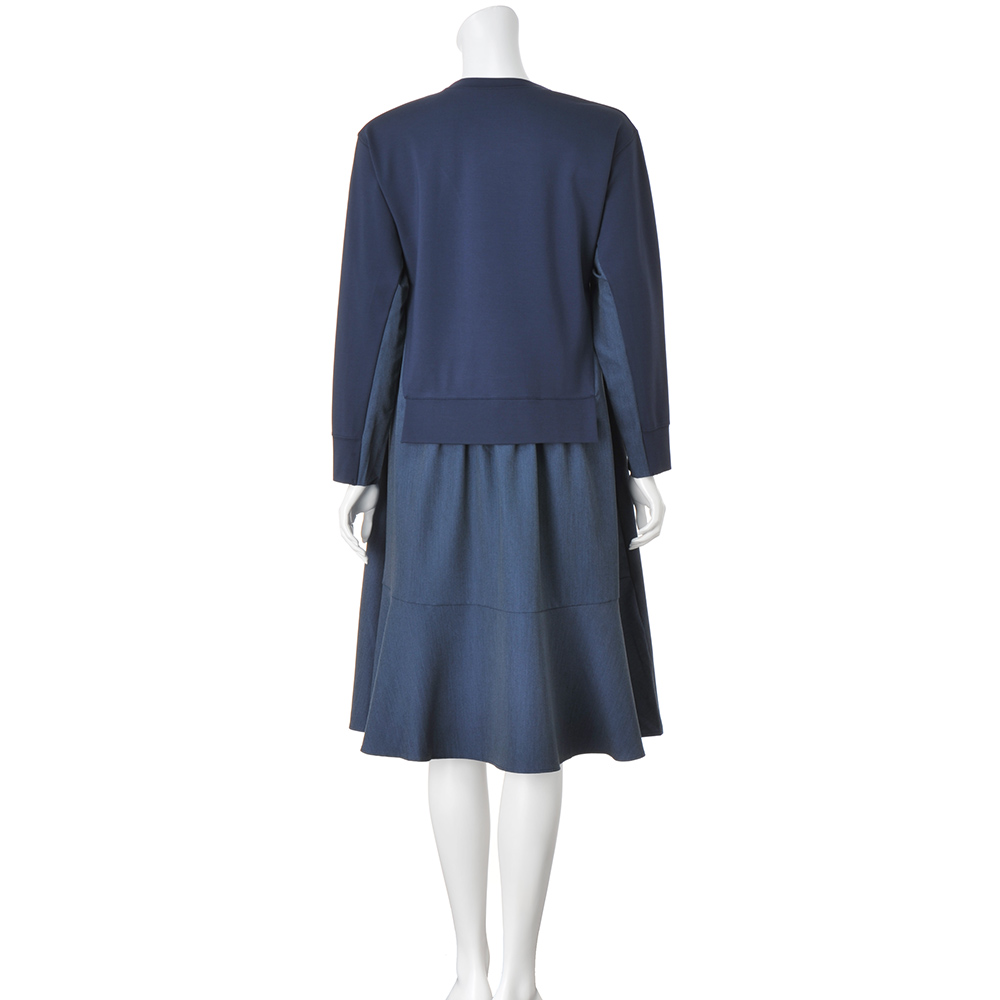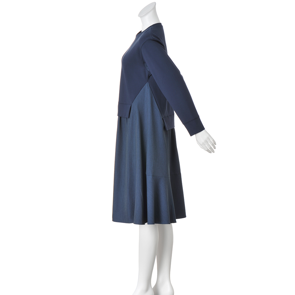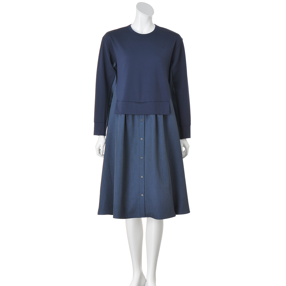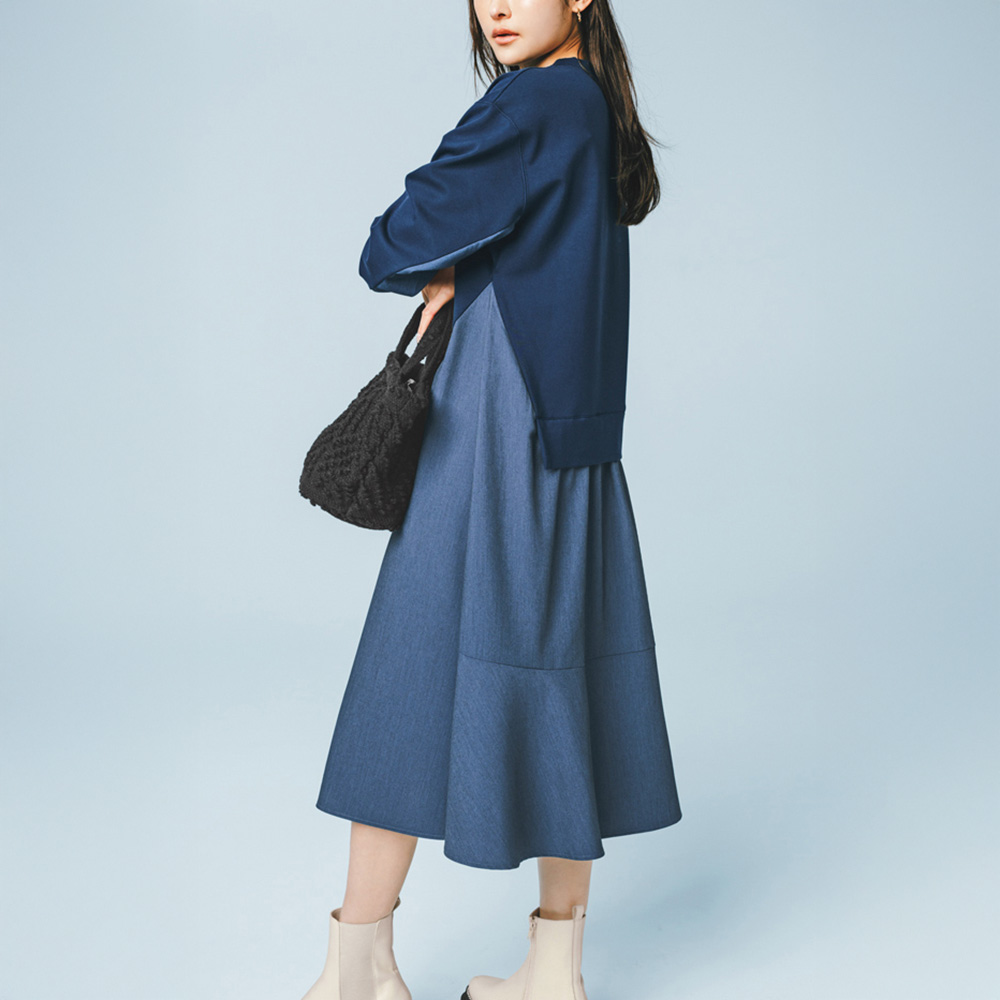 MANNISH LADYマニッシュさをプラスして洗練スタイルに。異素材の組み合わせで、切り替えデザインが映えるドッキングワンピース。上身頃の脇はスリット風のデザインでリアルなレイヤード感を演出します。袖下の切り替えや、スカート部分フロントの飾りボタンがアクセントに、後ろ裾の切り替えが美しいフレアシルエットを表現し、360度着映える一着です。