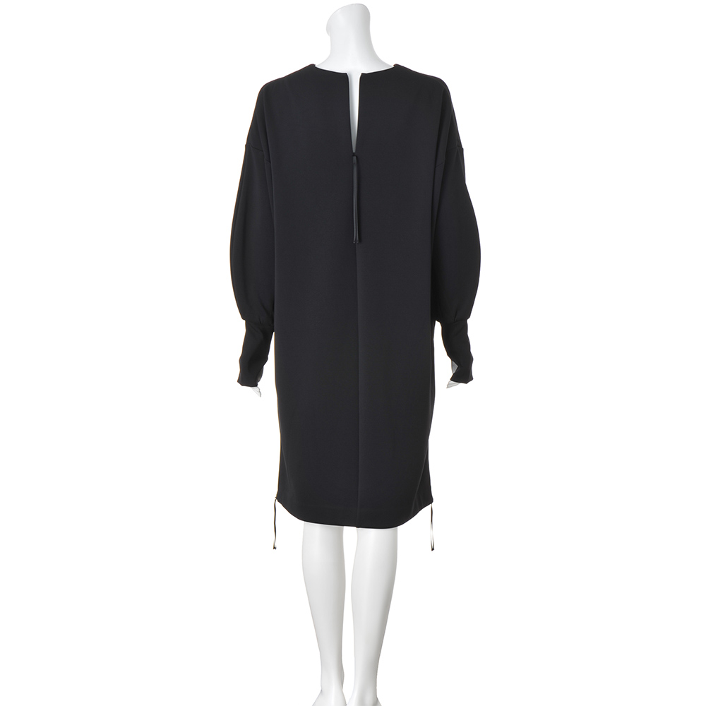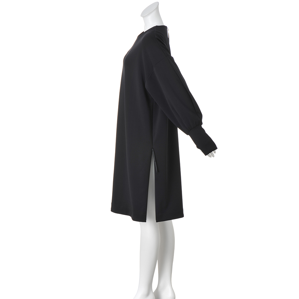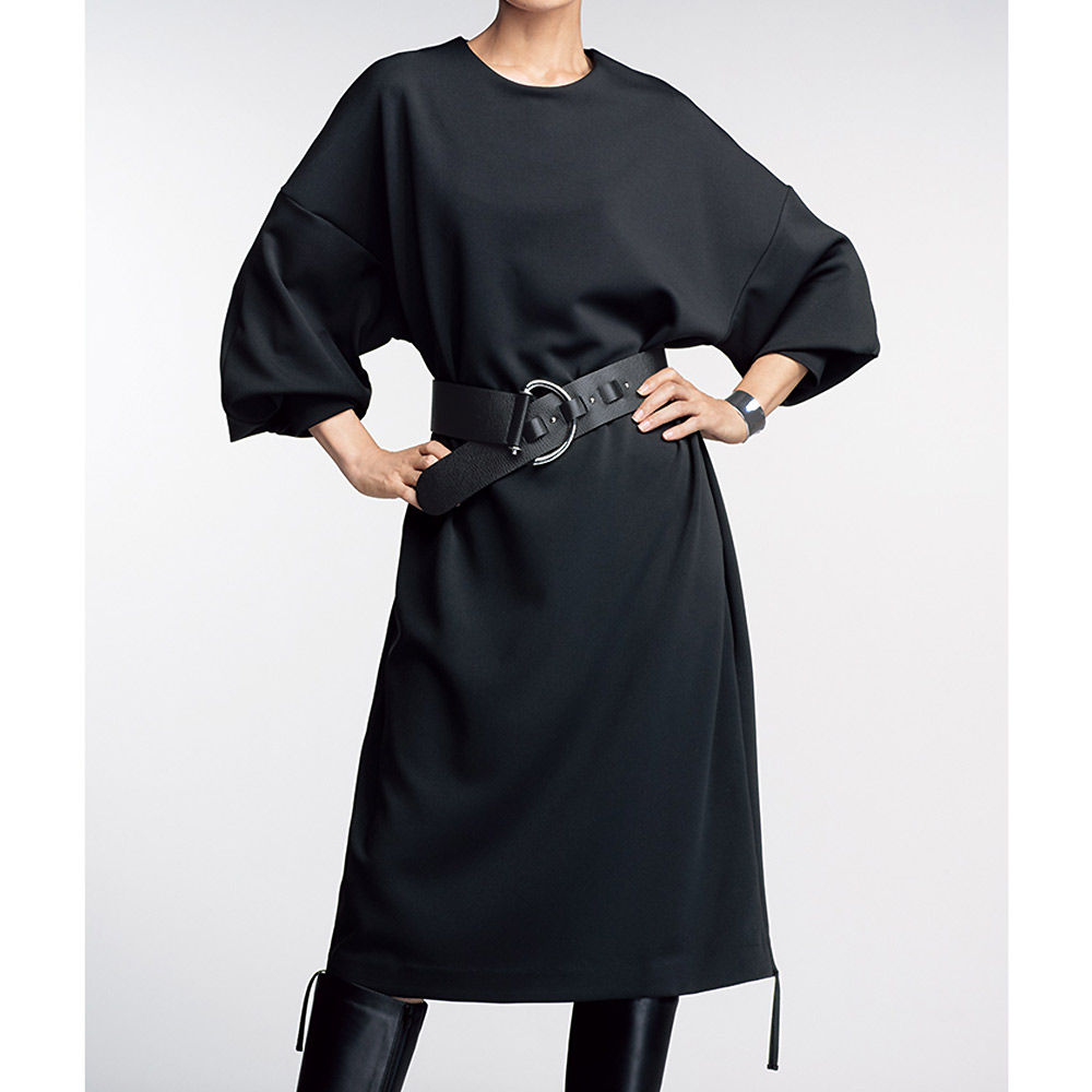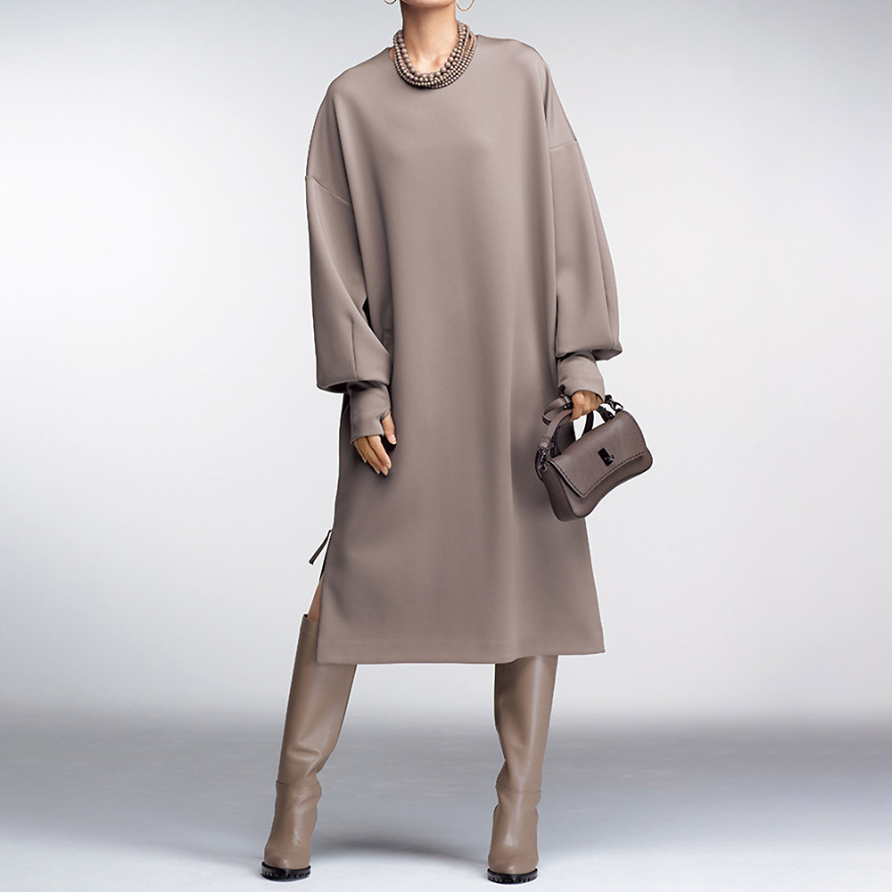 着心地が良くて、さりげなく印象的一日の中でも様々なライフシーンをもつ大人のためのワンピース襟開きや袖のカフス幅、裾のスリットなど細部まで納得の出来栄え!長時間着てもシワになりにくく、カジュアルにもエレガントにも着られるワンピース。軽やかなダンボールジャージー素材をセレクトし、少し鎖骨がのぞく拘りの襟開きとドロップショルダーのコクーンシルエットが上品なモード感を醸すデザインに仕上げました。開け方で好みのニュアンスを演出できる飾りテープ付きファスナースリット、たくし上げればパフスリーブ風、フィンガーホールに親指を通せばアームウォーマー風にアレンジできる幅広のカフス…と遊び心が光るディテールも必見!一枚で着るだけでなく、アクティブに過ごす日は、チュニック風にパンツを合わせる着こなしもおすすめです。