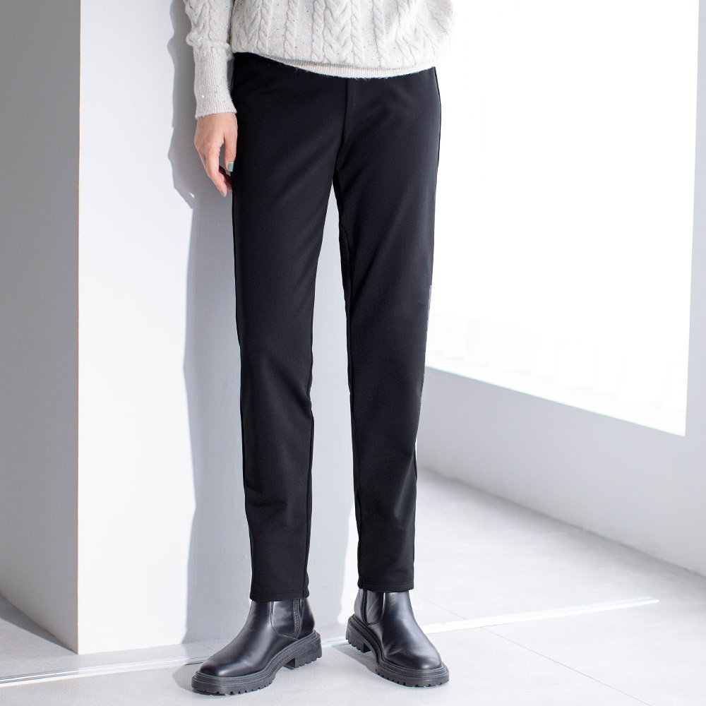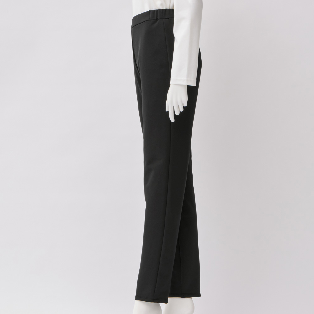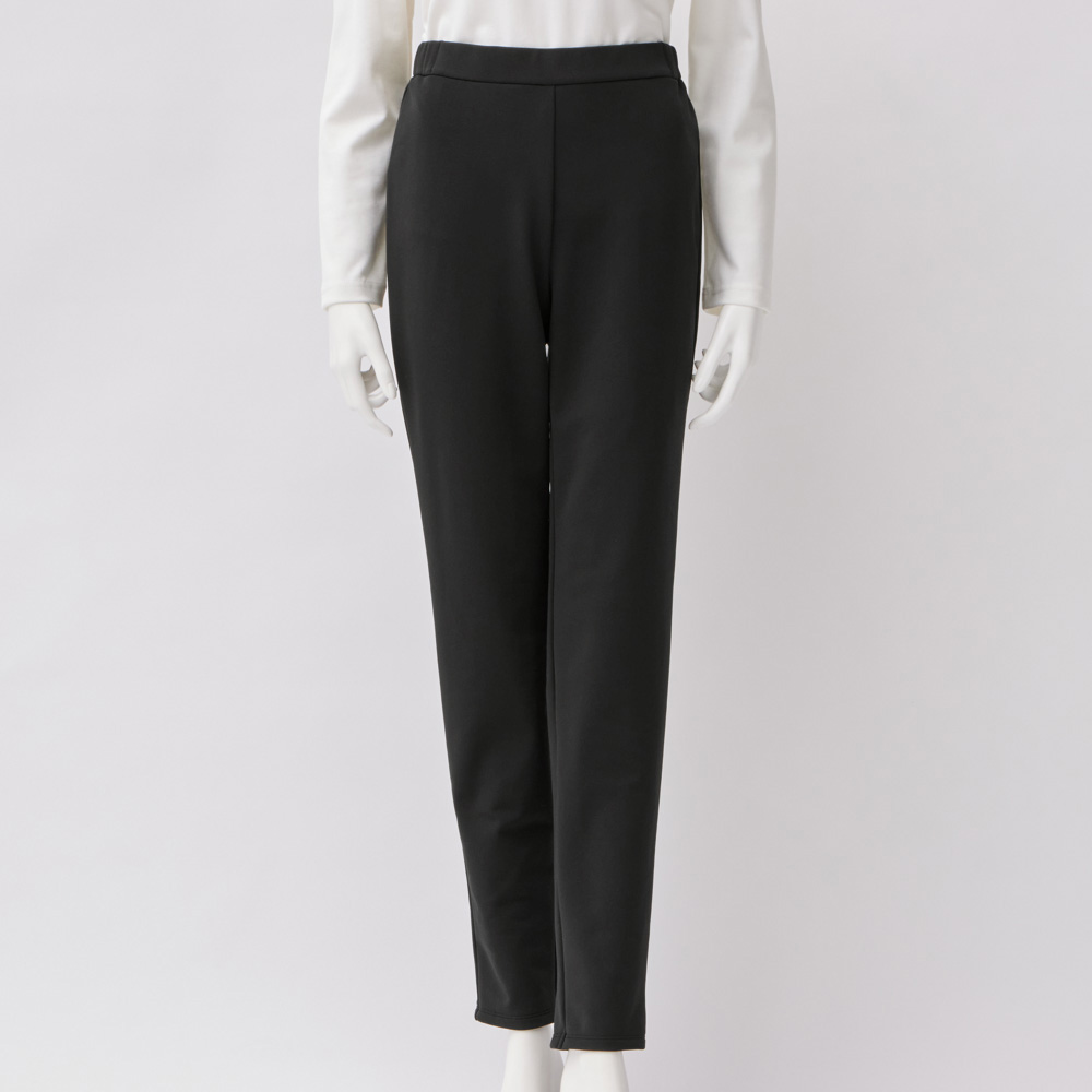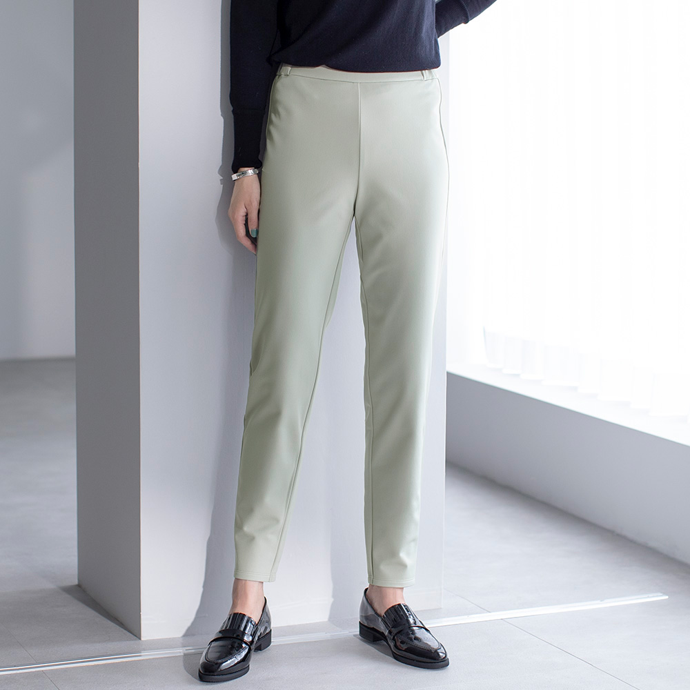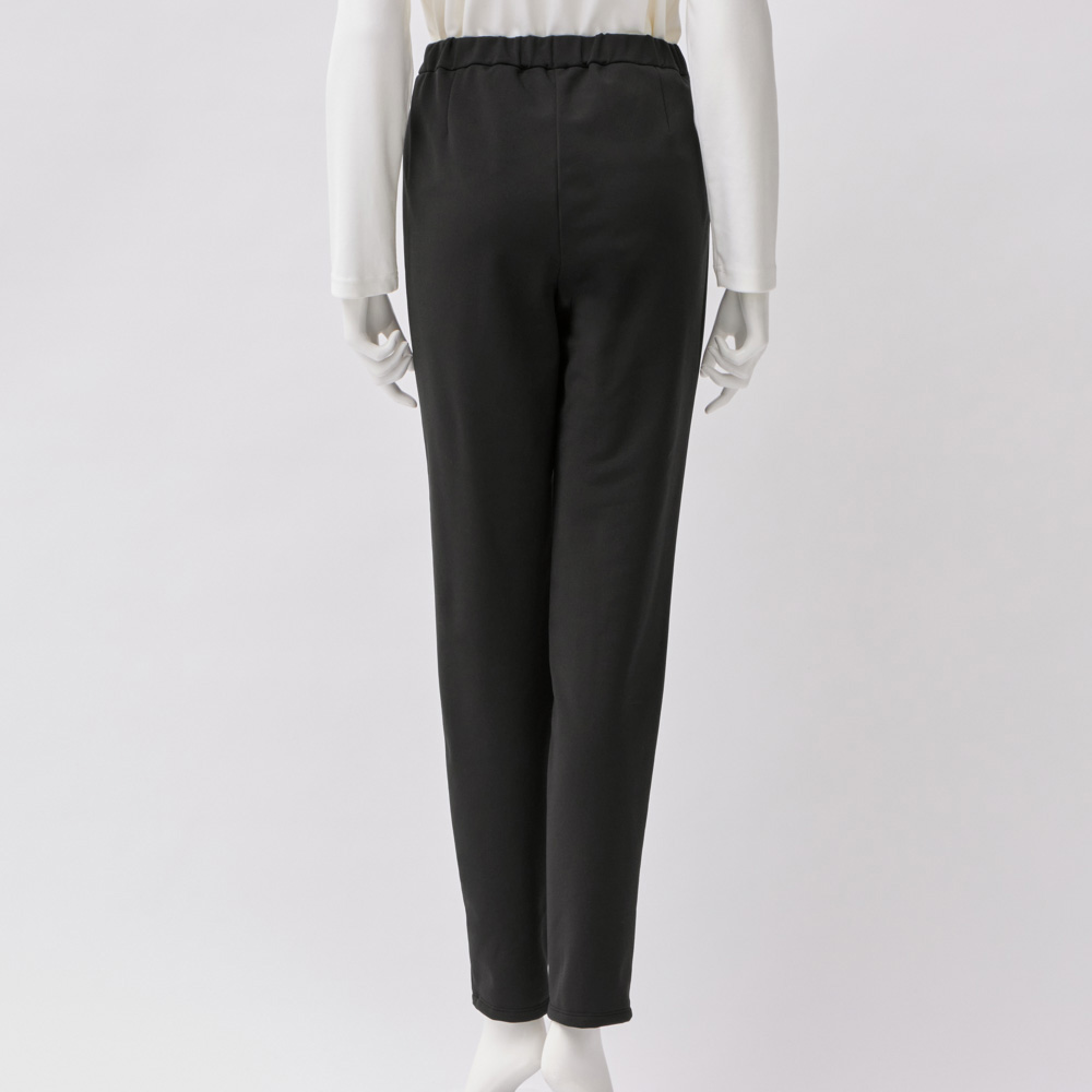あたたかみのある裏起毛トリコット素材を使用したスリムパンツは、ジャージ特有の膨らみを抑えつつシャープな印象を持ち合わせています。タウンユースにもぴったりな色味と風合いが特徴で、マットな表情が上品な印象。ウエストは総ゴム入りで、ストレスフリーな履き心地です。ウエスト前中心は、すっきり見せるためにゴムを寄せず、両脇から後ろにかけてのみギャザーを施しました。後ろ身頃はダーツを取ることによって、程よく身体にフィットする立体的なテーパ―ドシルエットに仕上げています。