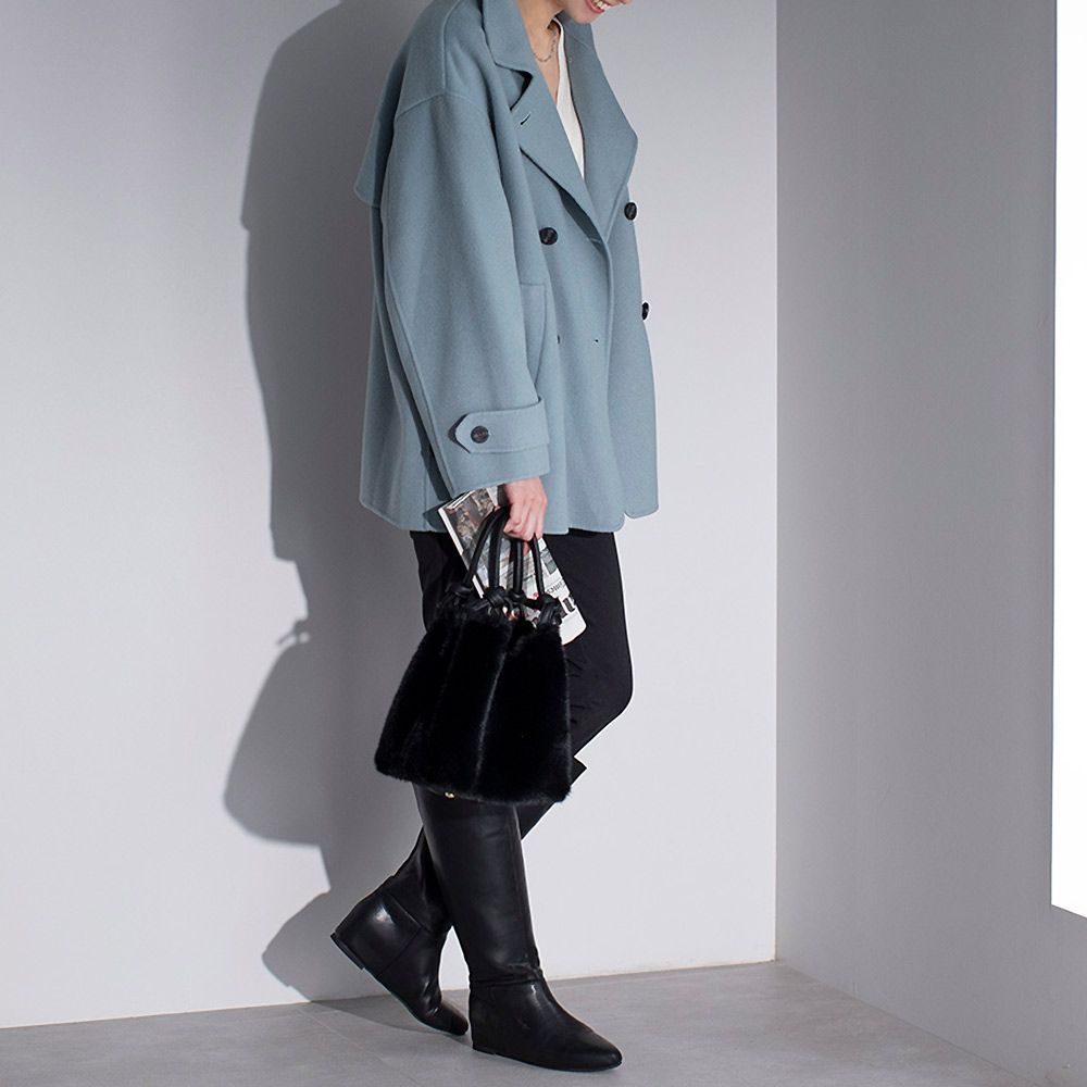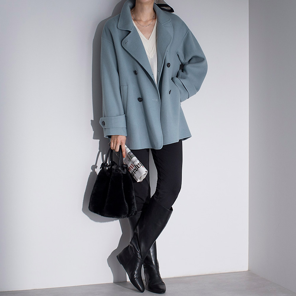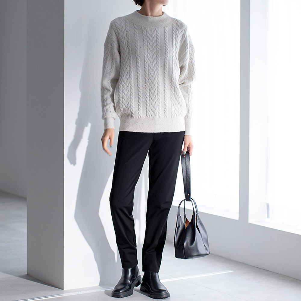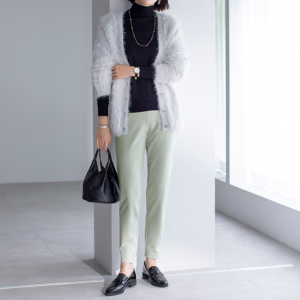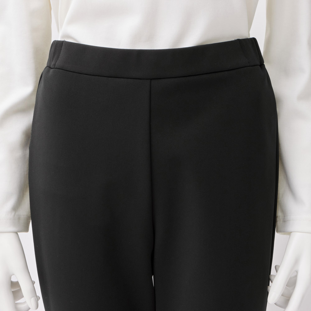 あたたかみのある裏起毛トリコット素材を使用したスリムパンツは、ジャージ特有の膨らみを抑えつつシャープな印象を持ち合わせています。タウンユースにもぴったりな色味と風合いが特徴で、マットな表情が上品な印象。ウエストは総ゴム入りで、ストレスフリーな履き心地です。ウエスト前中心は、すっきり見せるためにゴムを寄せず、両脇から後ろにかけてのみギャザーを施しました。後ろ身頃はダーツを取ることによって、程よく身体にフィットする立体的なテーパ―ドシルエットに仕上げています。