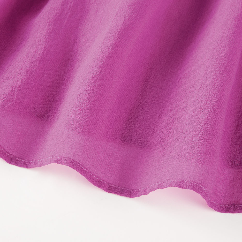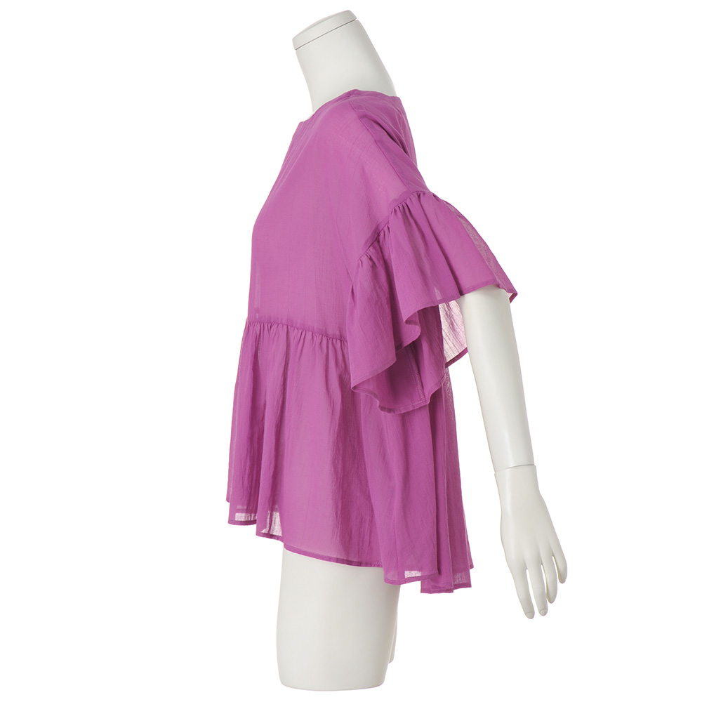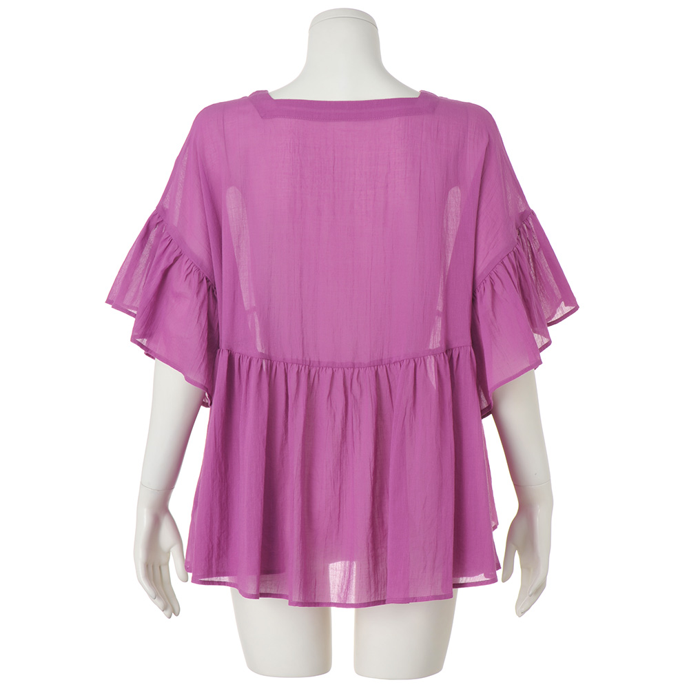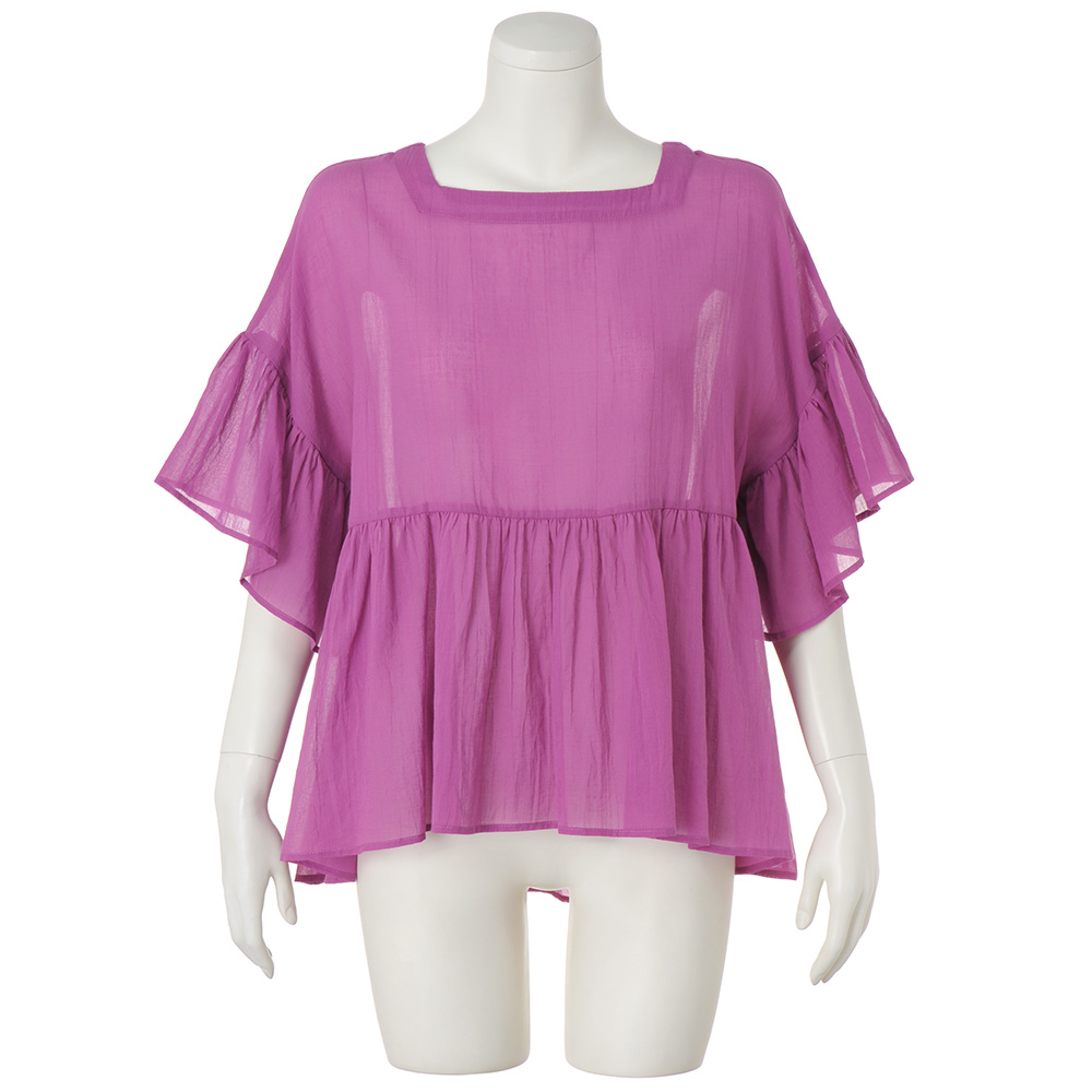 ふわりと香る花のようなピンクに魅せられて軽くて柔らかなコットンシフォンのブラウスは、風をはらみ涼しく快適。表面の細かなシボ感のおかげで、鮮やかなオーキッドピンクが深みを増し、大人が着こなしやすい色味になりました。デザインはゆったりした身幅に切り替えとギャザーをあしらい、スクエアネックで甘さを引き締めました。肩を落としたリラックス感のあるフレアスリーブや、後ろがやや長くヒップをカバーできる着丈もポイントです。