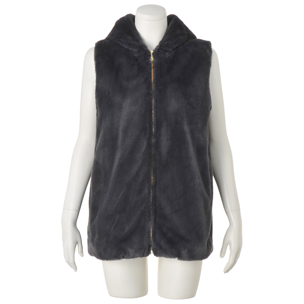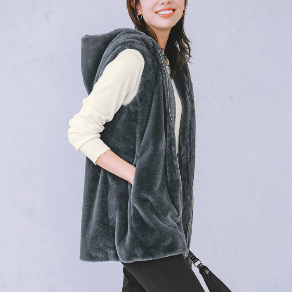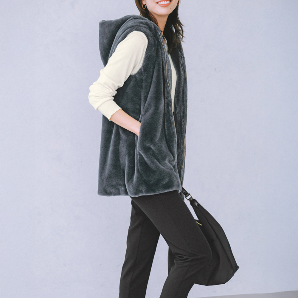 きれいめもカジュアルも大人のおしゃれはMONOTONEで。どこか洗練されたムードが漂うモノトーンの装い。活躍必至のアイテムに注目。スタイリングに羽織るだけでぐっと雰囲気がアップ自然な艶感のファー調素材は合わせを選ばないチャコールグレーに。また、着丈はヒップにかかる丈感で軽快に仕上げました。包み込まれるような大きめのフードも魅力。ロングシーズン活躍する一着です。