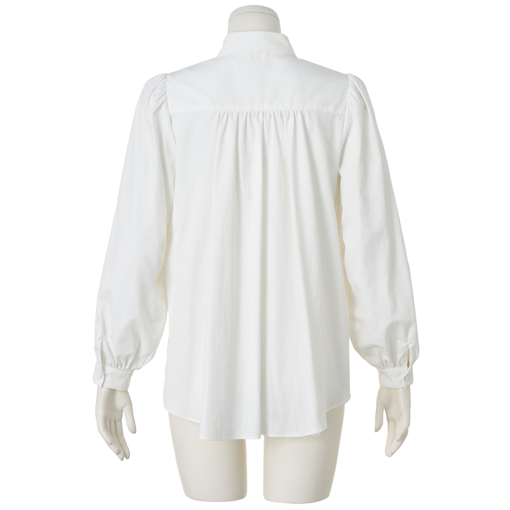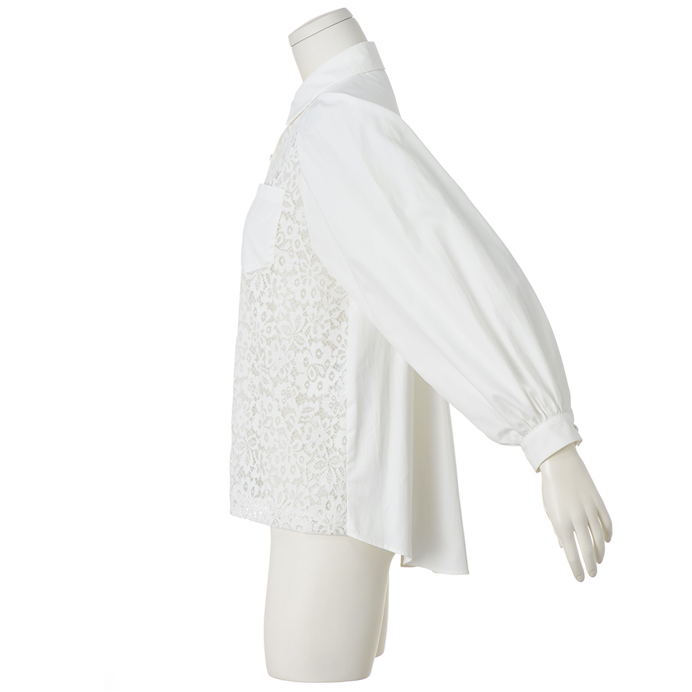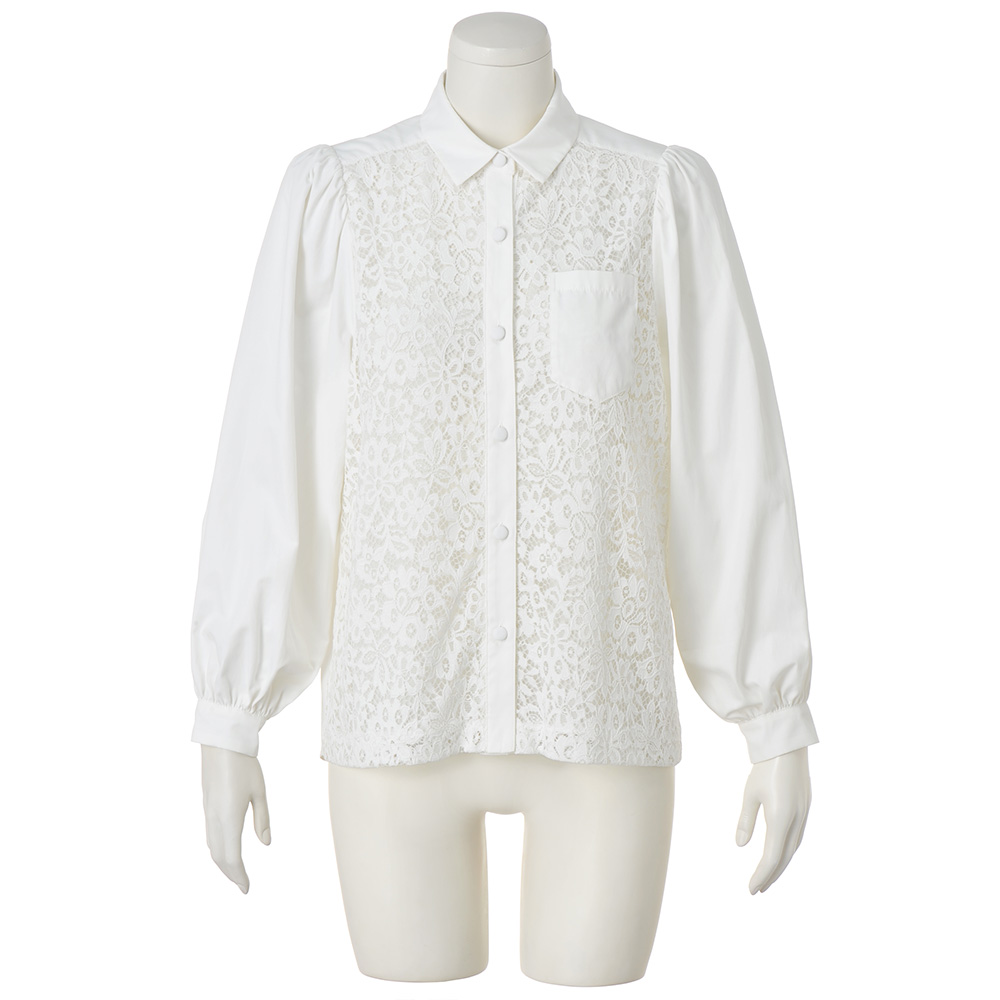 “ラッセルレース”フラワー柄のレースを大胆に使い奥行きと抜けのあるムードに前身頃の繊細なレースが印象的なシャツは、女性らしいシルエットも特徴。袖はたっぷり分量をとったパフスリーブ、後ろヨーク下はギャザーを入れてフレアに。台襟つきのシャツカラーできちんと感も兼備。前立てと袖のくるみボタンで可愛らしさもプラスしました。