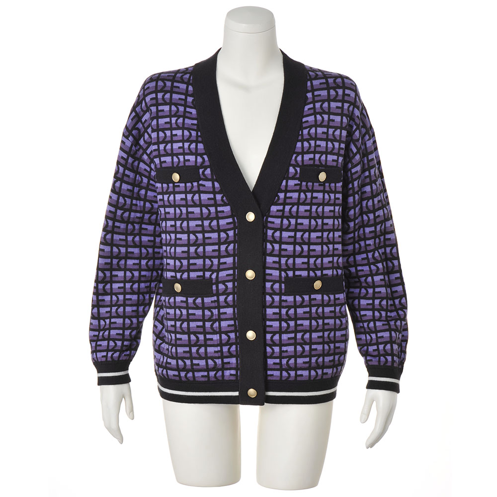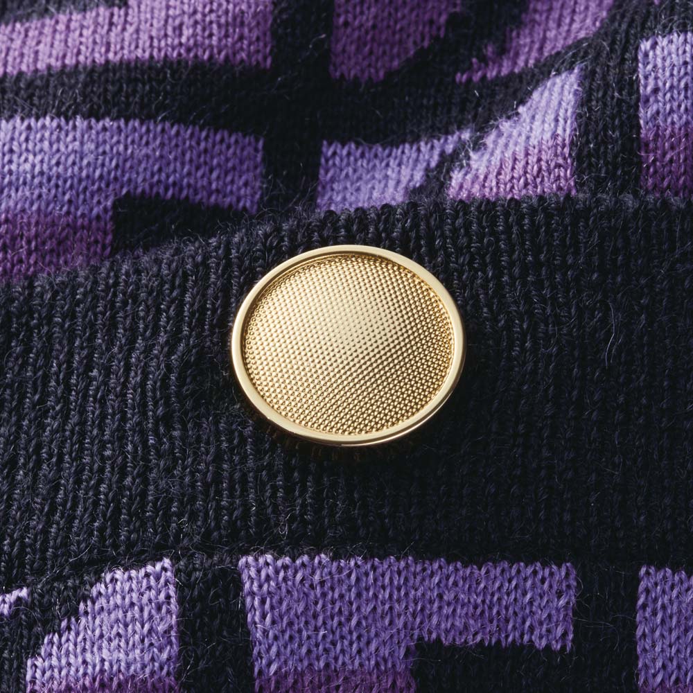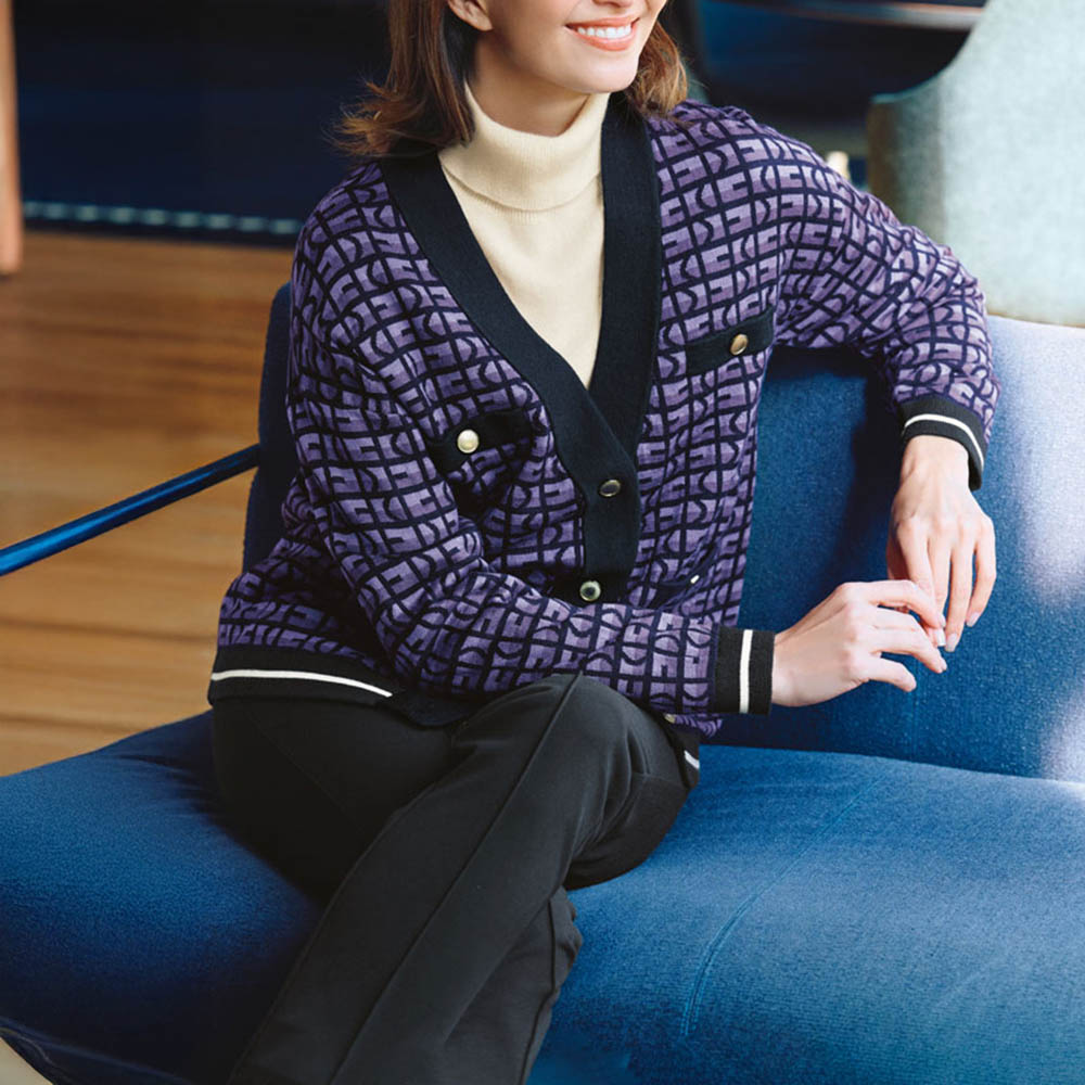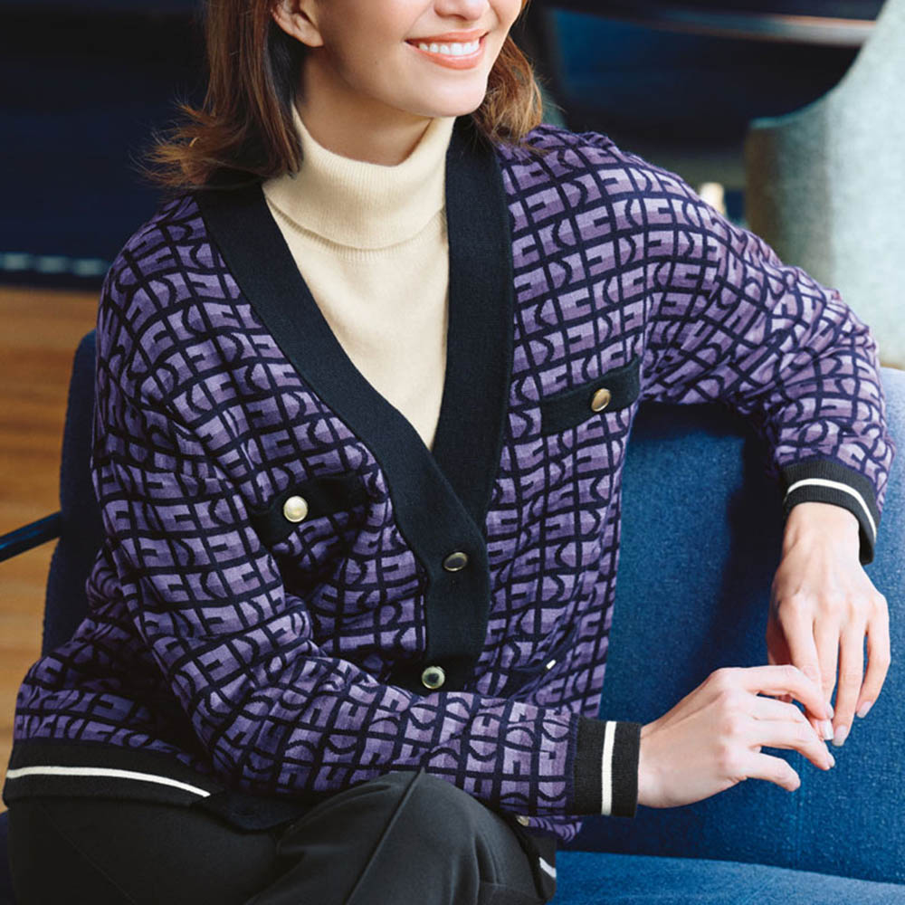 アイコニックなディテールが、エレガンスをアップデート「DAMA And」のDをモチーフにしたオリジナル柄のカーディガン。濃淡パープル×ネイビーのコンテンポラリーな配色に、裾と袖口には清潔感のあるホワイトライン、4つのポケットにも金ボタンをあしらった拘りのディテールが新鮮です。適度なゆとりを感じるボクシーシルエットをすっきりと見せるのは、深く開いたVネック。ジャカード編みのしっかりとした編み地の美しさも相まって、ニットの柔軟な着心地を保ちながら、きちんと見えるクラシカルなジャケットのようにスタイリングを格上げします。