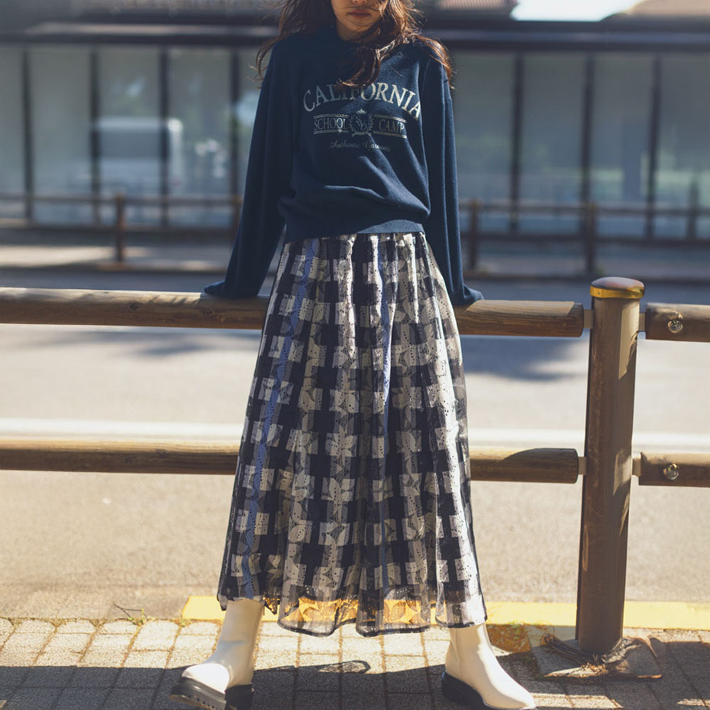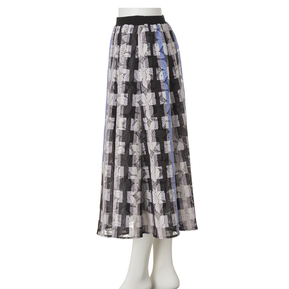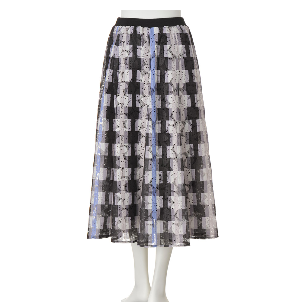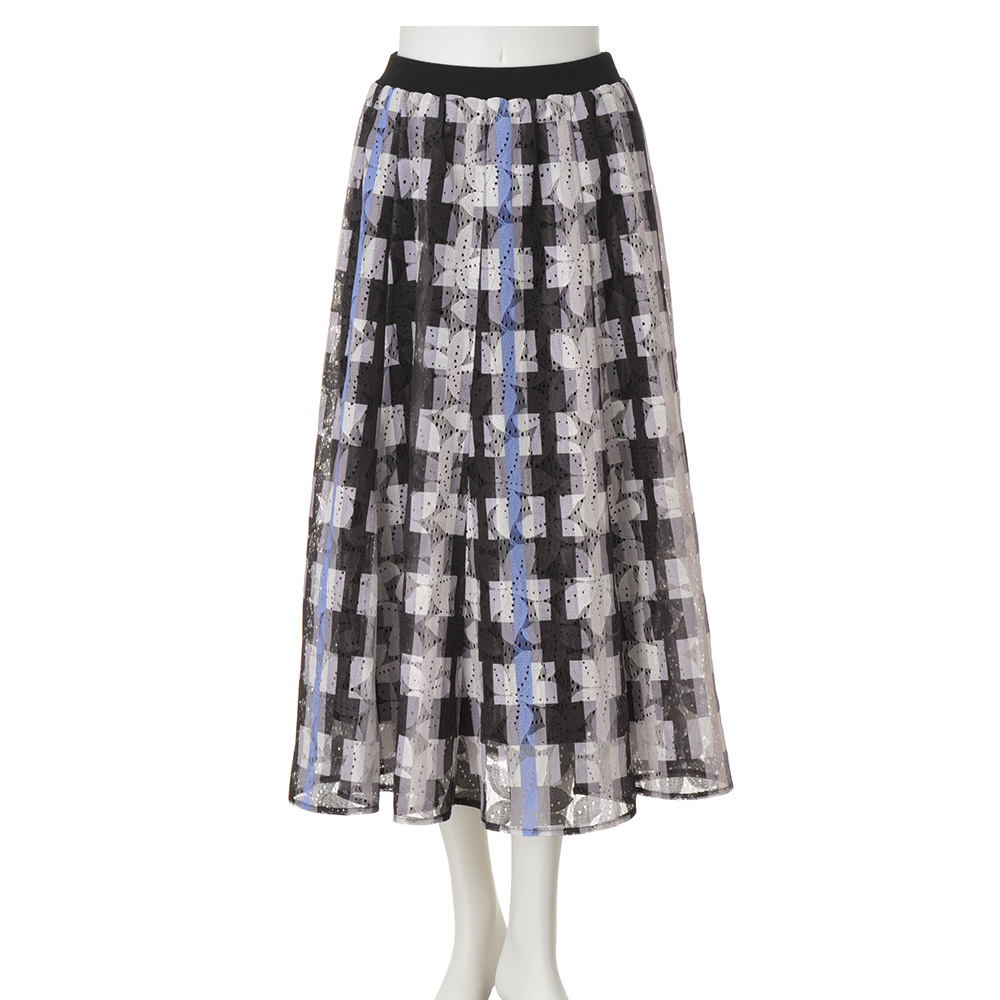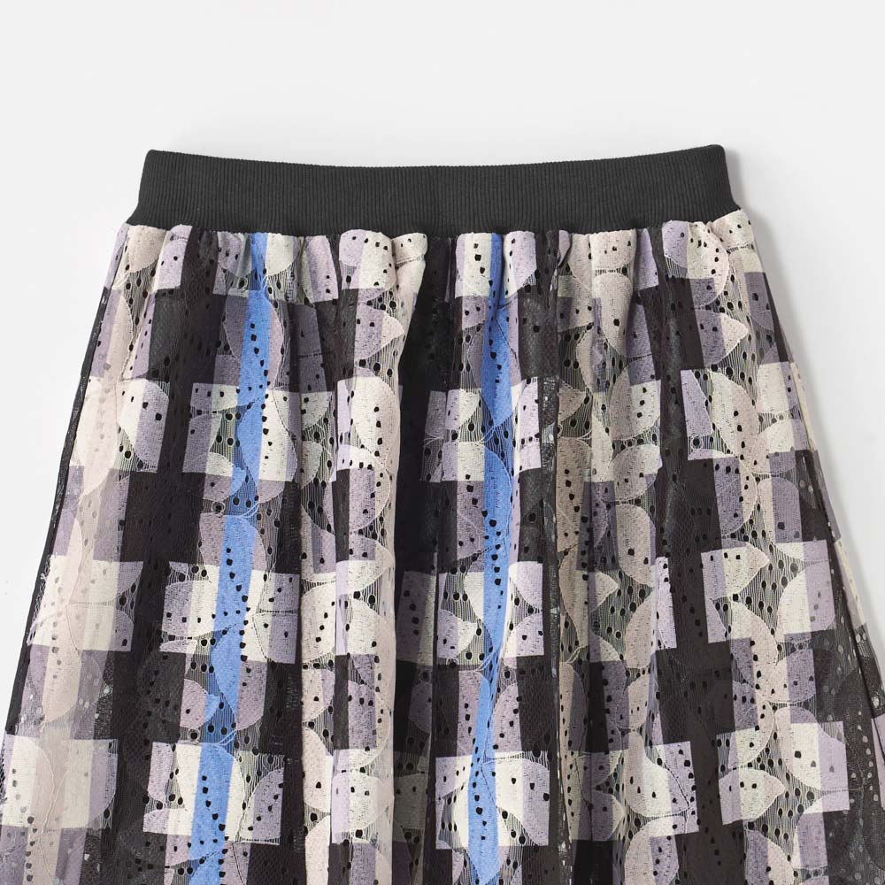 大きめの花柄のレース生地に、同じく大きめのチェック柄をプリントすることで、奥行きと立体感を演出した手の込んだスカート。シルエットは贅沢な8枚接ぎで分量感がありつつ、レースの抜け感で軽やかな印象に。