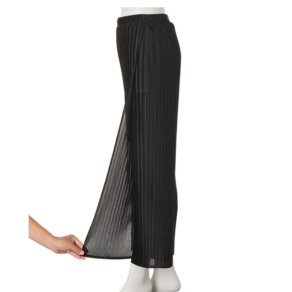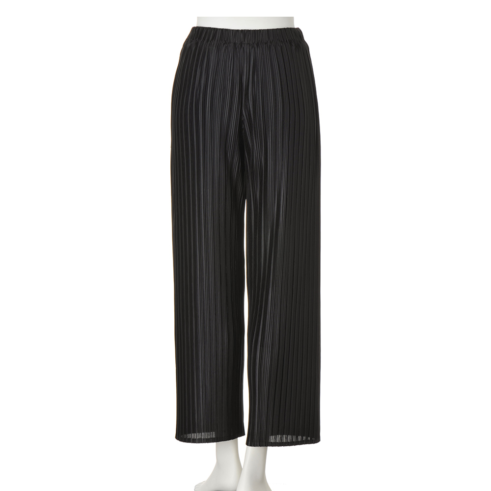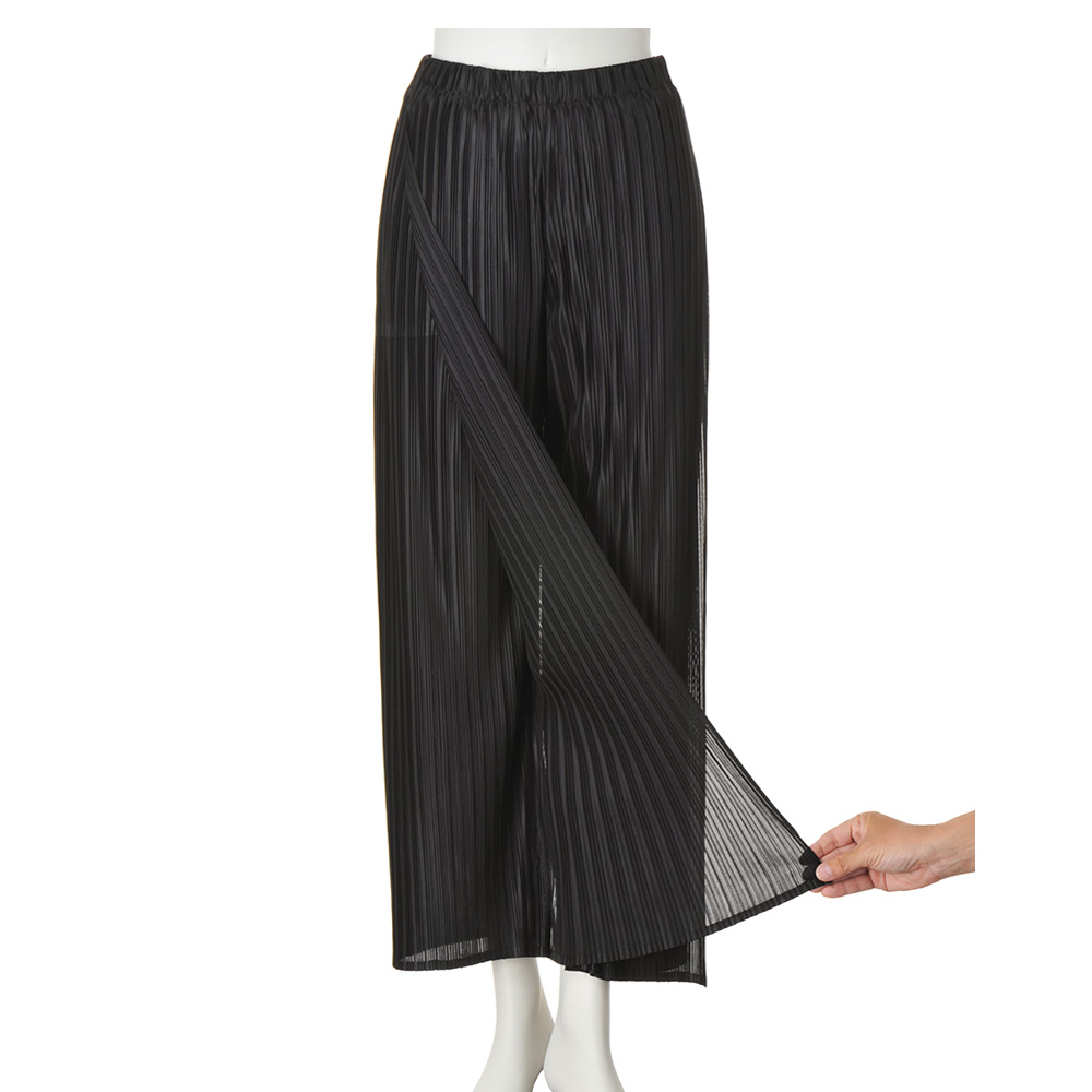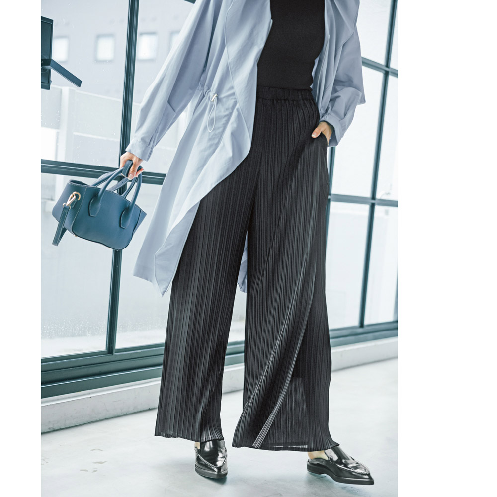 心地よく纏えて気分が上がる “多幸感”ワードローブピッチの違うプリーツがニュアンスのある表情を生むほんのりと透け感のある生地を前脚パーツには2枚使用し、歩いたときにひらりと揺れて動きを演出します。プリーツ生地が脚のラインを拾いにくく、縦ラインを強調して脚長効果もあり自然にスタイルアップできる一着。オールシーズン、合わせを選ばず着られます。