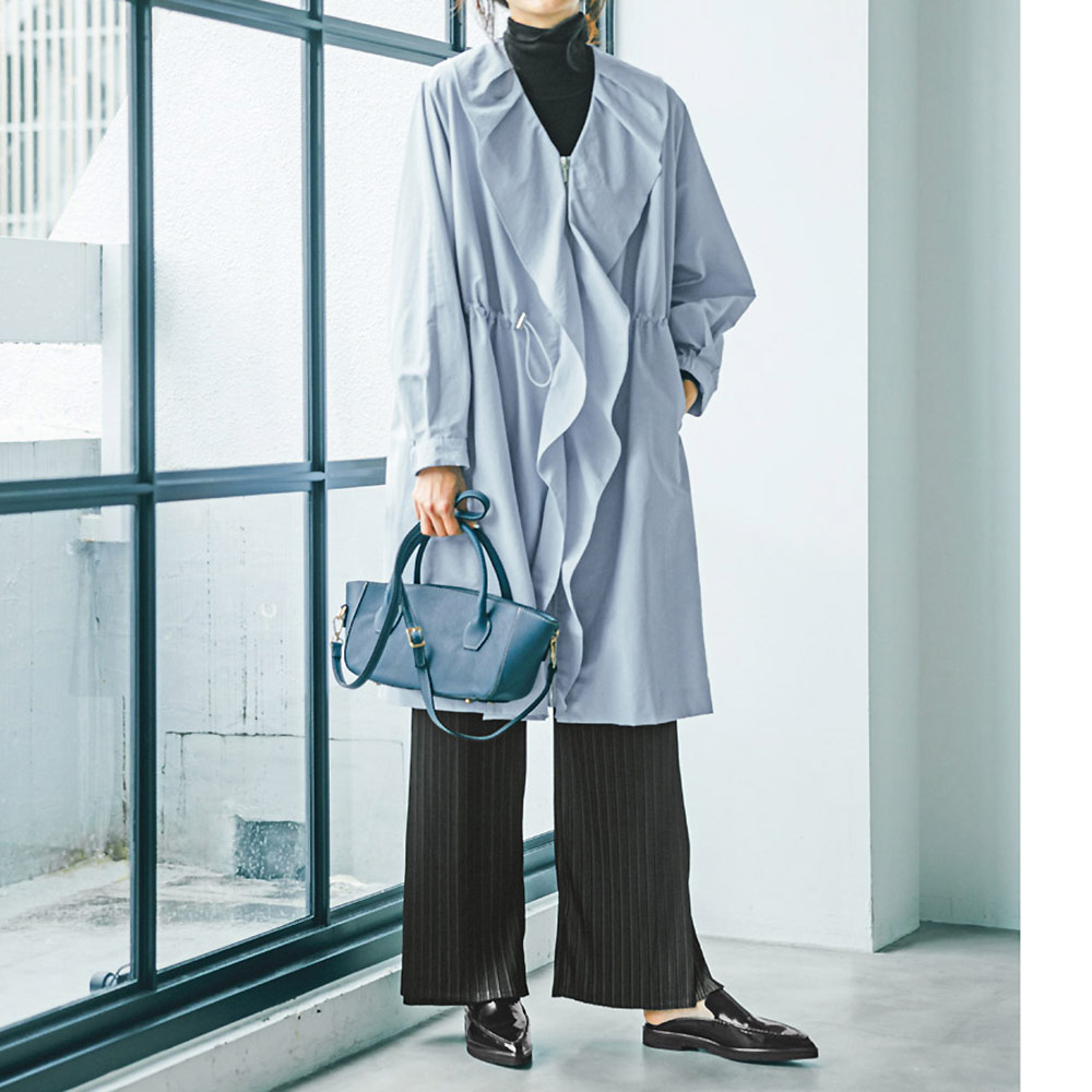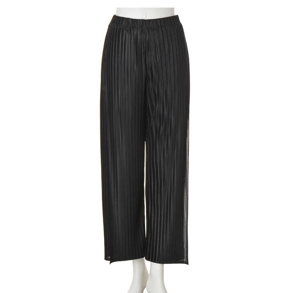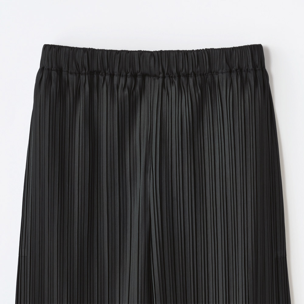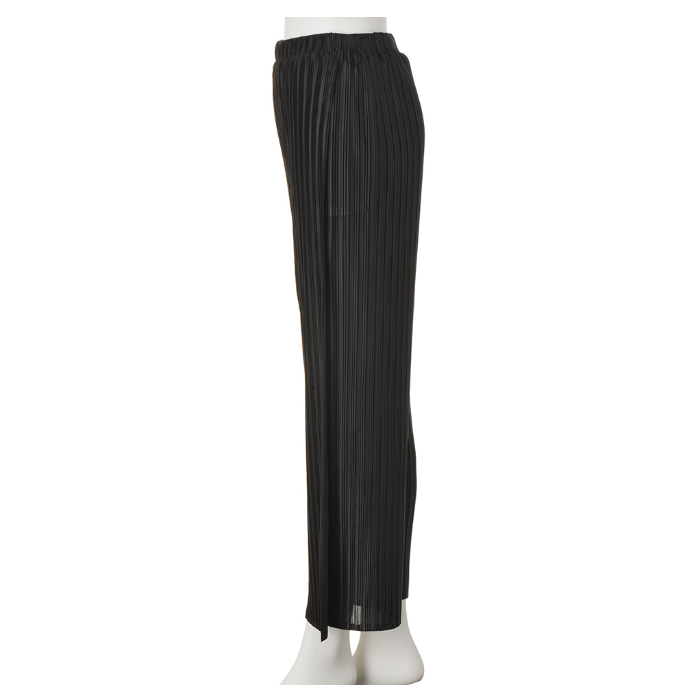心地よく纏えて気分が上がる “多幸感”ワードローブピッチの違うプリーツがニュアンスのある表情を生むほんのりと透け感のある生地を前脚パーツには2枚使用し、歩いたときにひらりと揺れて動きを演出します。プリーツ生地が脚のラインを拾いにくく、縦ラインを強調して脚長効果もあり自然にスタイルアップできる一着。オールシーズン、合わせを選ばず着られます。