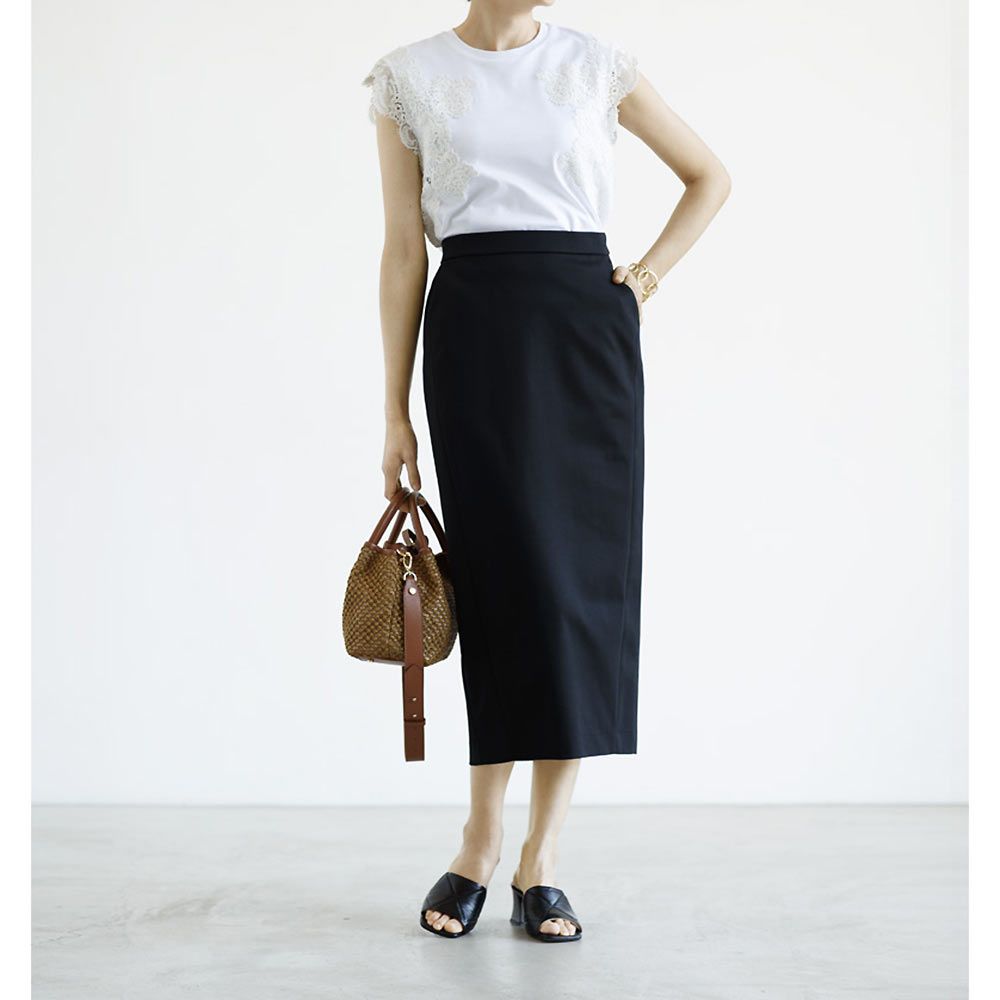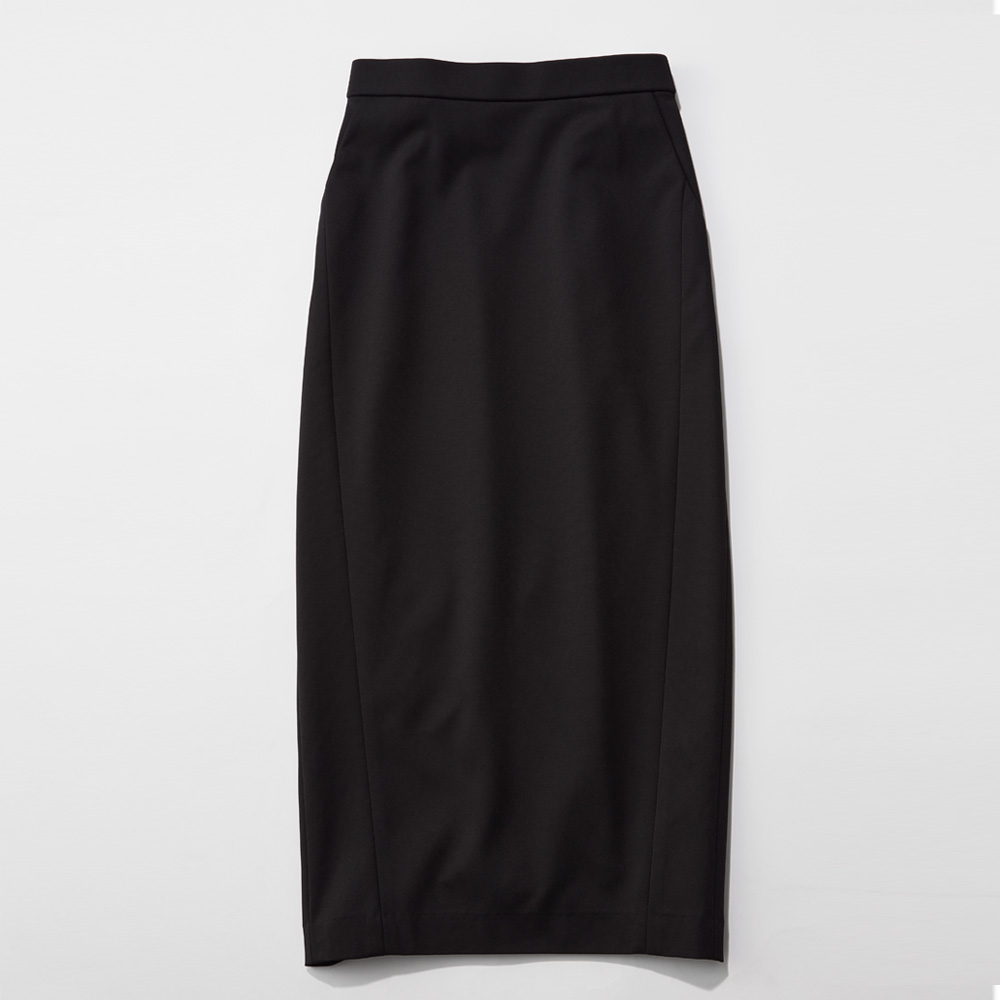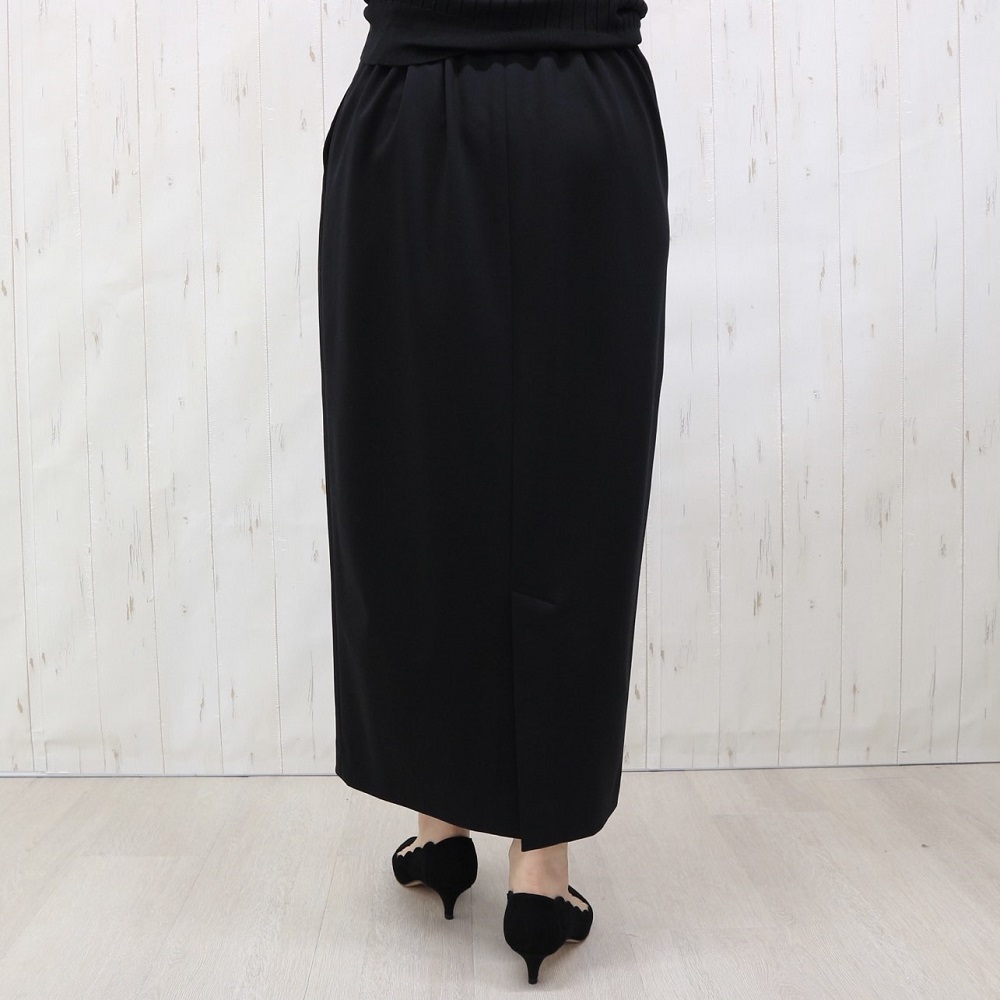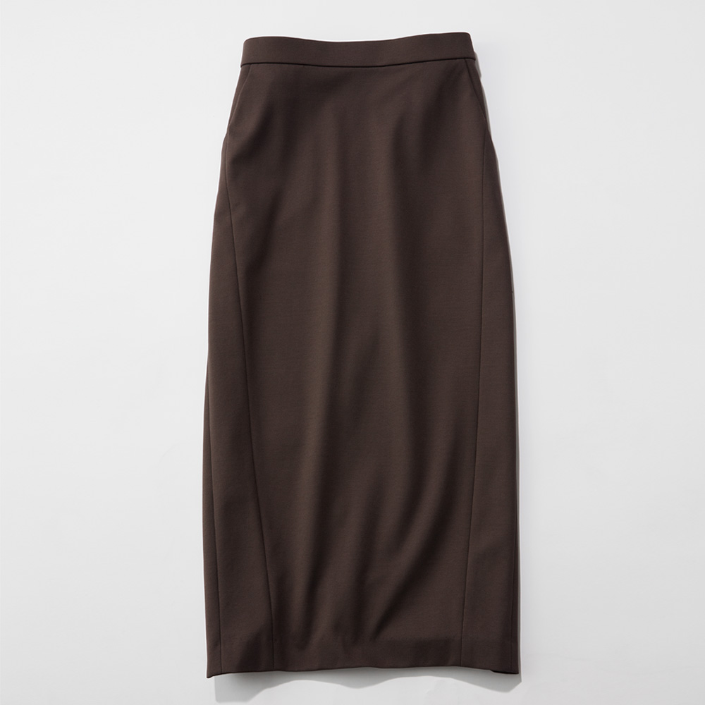 『DAMA collection』の定番人気素材、「NIKKE(日本毛織(株))」のハイゲージポンチジャージー。超細番手のスーピマコットンにナイロンを特殊な方法で撚糸することで、通常よりもハイゲージに編み立てることが可能になりました。シルクのような奥深い光沢や、しなやかな風合いが自慢の生地です。「dama basic」のために、ウエストゴムのらくちんロングタイトスカートを仕立てました。ウエストは、フロントはすっきり仕上げ、バックのみギャザーを寄せたゴム仕様。ヒップラインが露わになるタイトとは異なる、優しい着用感に拘りました。