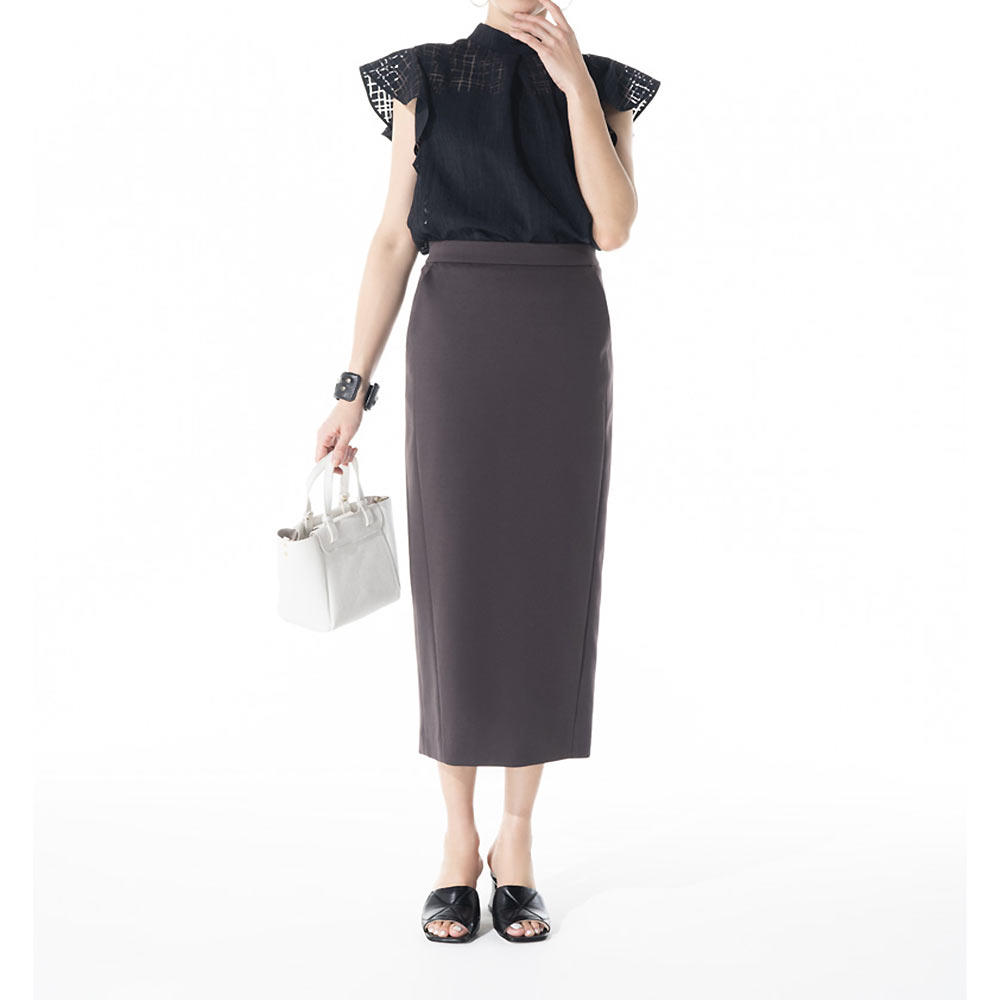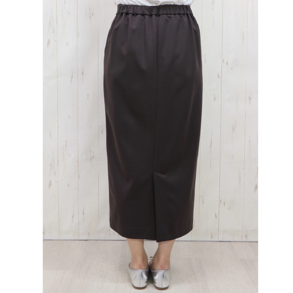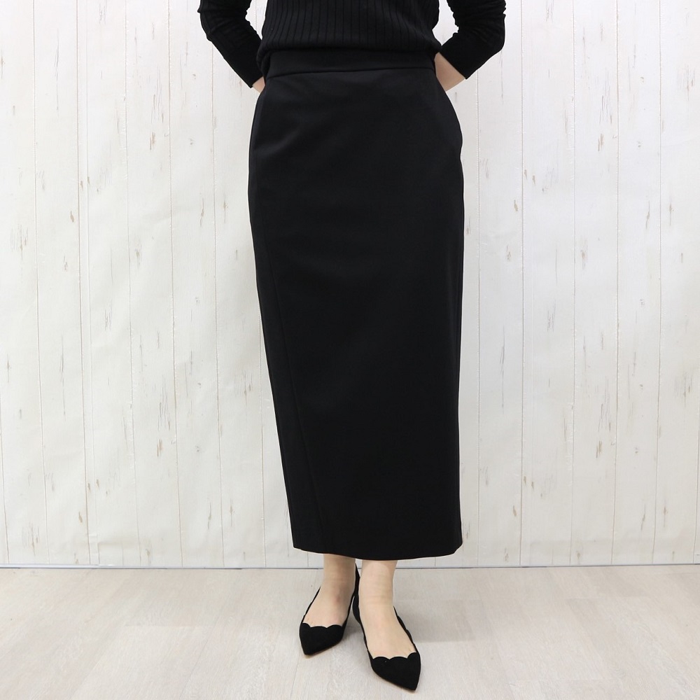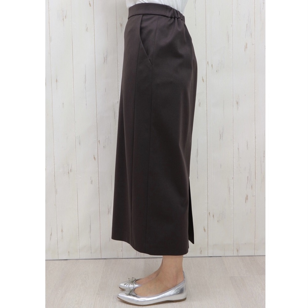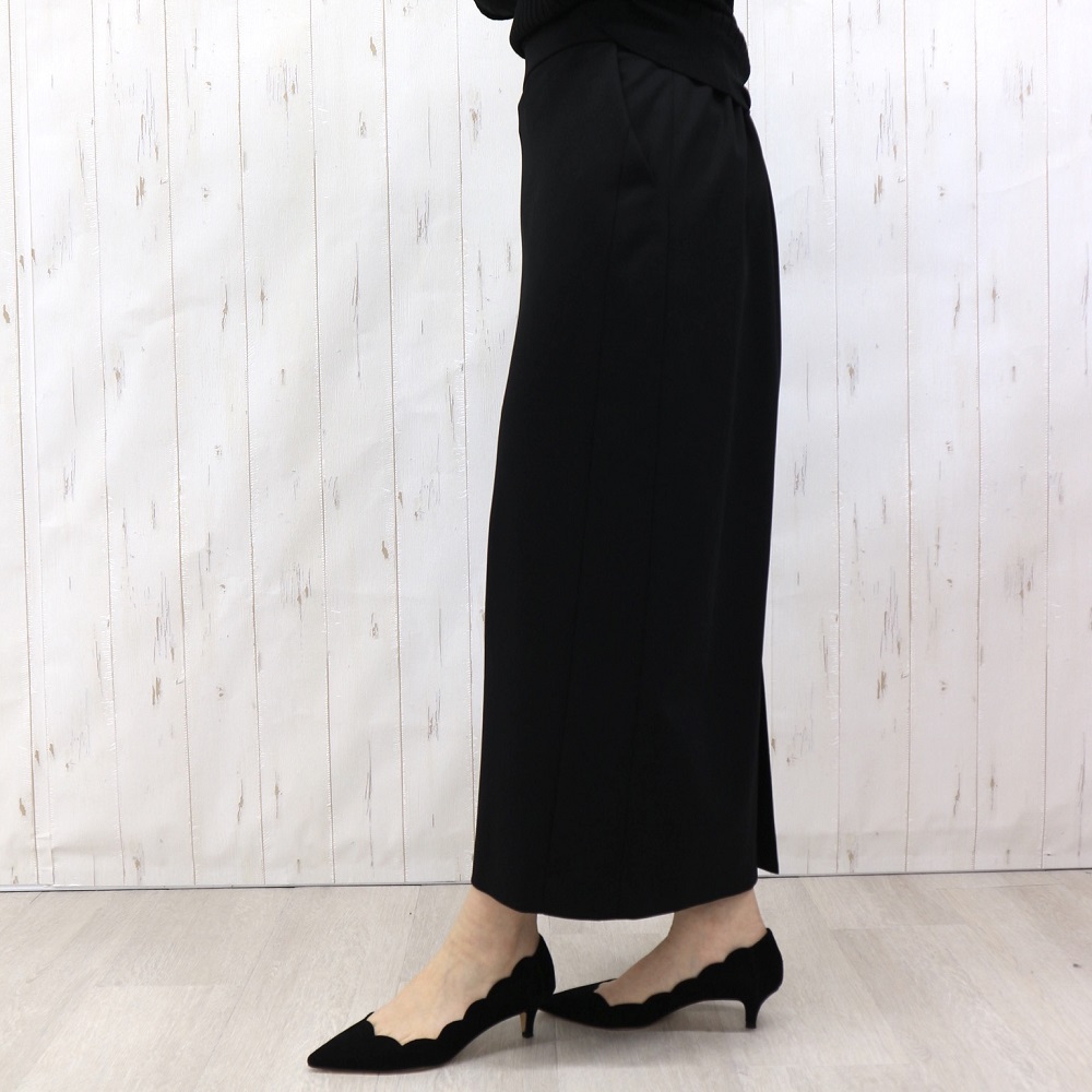 『DAMA collection』の定番人気素材、「NIKKE(日本毛織(株))」のハイゲージポンチジャージー。超細番手のスーピマコットンにナイロンを特殊な方法で撚糸することで、通常よりもハイゲージに編み立てることが可能になりました。シルクのような奥深い光沢や、しなやかな風合いが自慢の生地です。「dama basic」のために、ウエストゴムのらくちんロングタイトスカートを仕立てました。ウエストは、フロントはすっきり仕上げ、バックのみギャザーを寄せたゴム仕様。ヒップラインが露わになるタイトとは異なる、優しい着用感に拘りました。