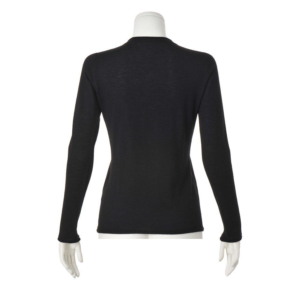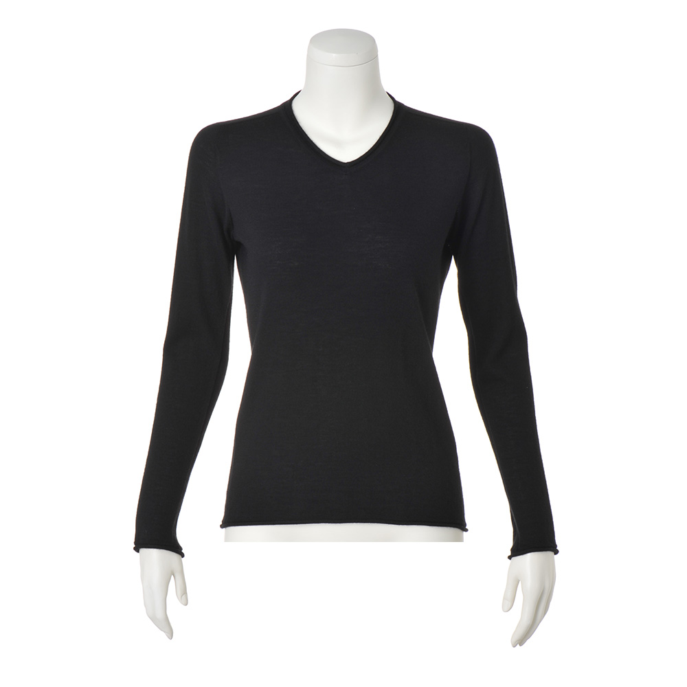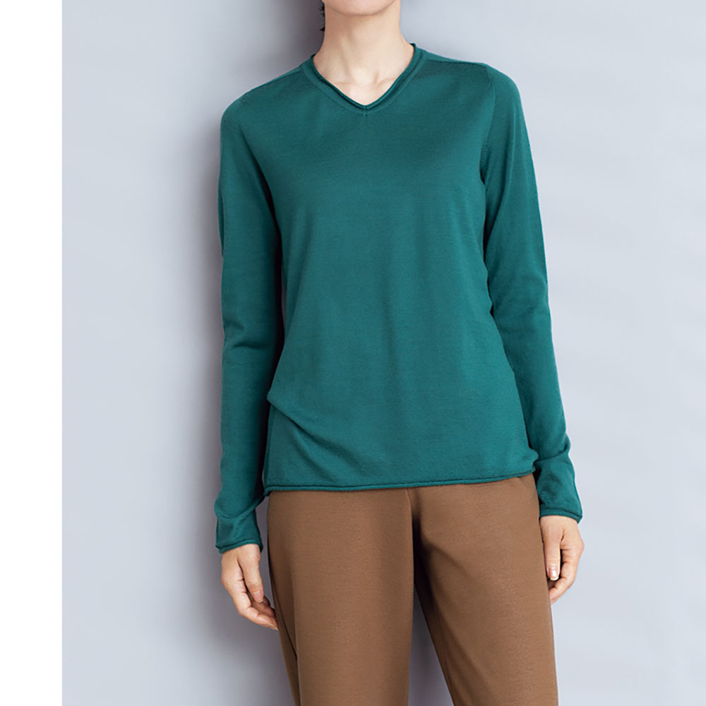 このぬくもりがあれば、どんなときも笑顔でいられる。“カシミヤの中のカシミヤ”と称される、繊細でしなやかなアラシャンカシミヤ。呼吸するような優しい暖かさ、うっとりする滑らかな着心地です。毎日着たくなるしなやかな肌触りと優しいぬくもりは、カシミヤの中でもとびきり繊細なアラシャンカシミヤの梳毛糸を3本撚り合わせた80番手三子糸を使用し、ホールガーメント(R)で編み立てているから。立体的に編んでいくため縫い接ぎやリンキングによるテンションの違いがなく、ストレスのない着心地は格別です。Vネックは浅めのネックラインが知的な女性らしさを演出。ネック端、袖口、裾は天竺編み特有のカーリングを活かし、大人可愛いアクセントに。≫ POINTベースは繊細な18ゲージの天竺編み、身頃の両脇と袖下にはライン状のリブ編みをあしらい細見え効果をプラス。襟ぐりは、表情のあるカーリング+袋編みのリンキングでフィット感を高めています。