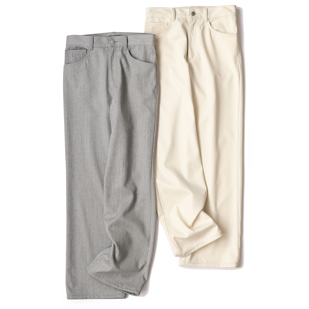 MAFスーパー120s原料の紡毛1/24と梳毛2/72を交撚(太さの異なる糸など、異種の糸を撚り合わせた糸のこと)して織り上げミルド感あるふっくらW100%デニムに仕上がりました。リッチなウールデニムはふっくらとしており、通常のデニムに比べて軽めで風合いも柔らかく着心地のよい素材です。シルエットにこだわったセミワイドパンツを作りました。やや深めの股上、ウエスト〜ヒップ周りはスッキリさせ、わたり〜ひざ、ひざ〜裾とバランス良く繋げたシルエットは脚のラインをきれいに見せてくれます。巻縫いやチェーンステッチなど本格デニム仕様を取り入れ、ステッチは生地同色系でキレイ目に仕上げています。ミルキーなホワイトと杢グレーの2色展開です。