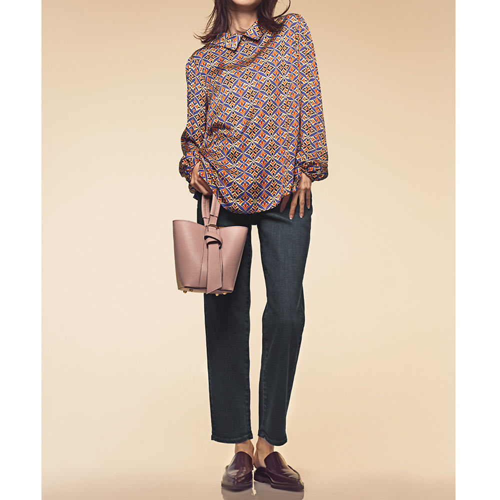 ウエストのマットシルバーのボタンにはブランドロゴを刻印しクラス感を。
