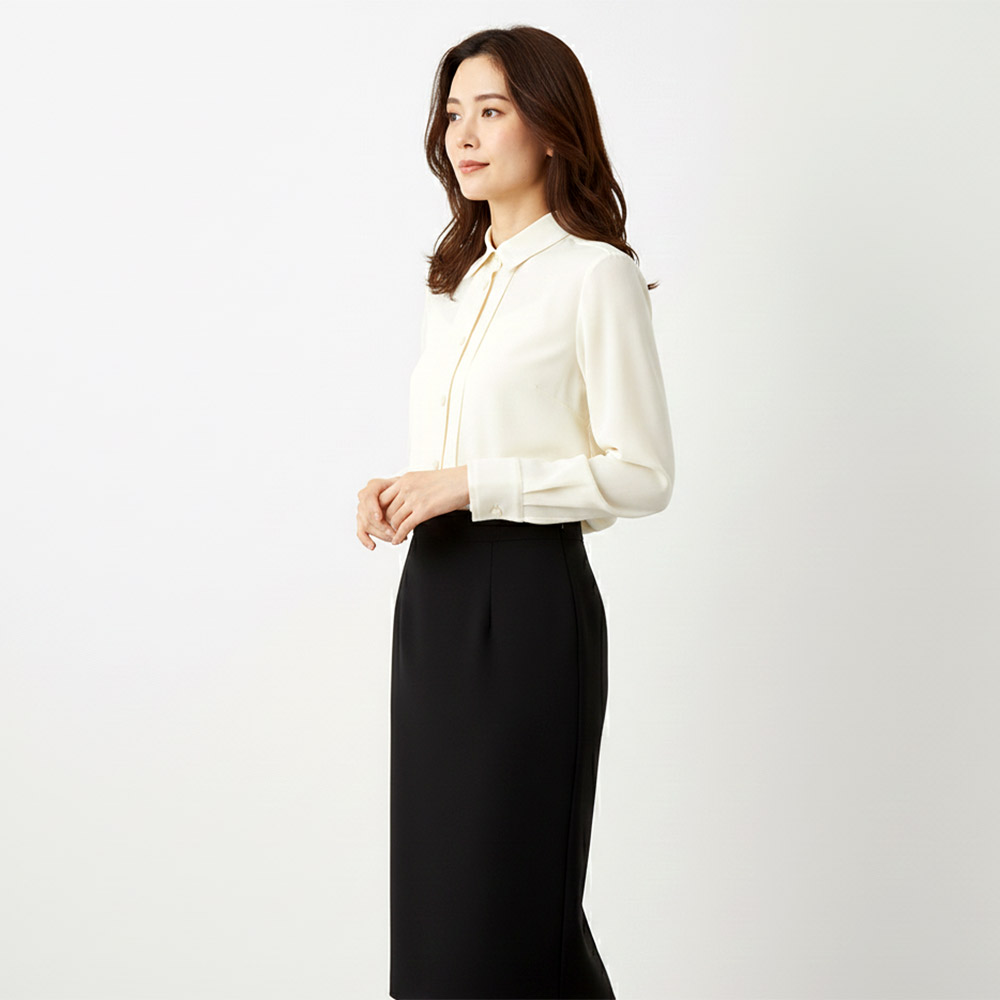 その人になじむさりげなさがお洒落の可能性を広げてくれる。シャツは、「NIKKE(日本毛織(株))」のMAFの中でもより高品質を追求して超細番手の糸で織り上げたシフォンジョーゼット。肌に語り掛けるような柔らかさと膨らみ、ドレープ性を備えたエアリーな生地感を、気負わず楽しんでいただきたくて…。たどり着いたのが、シャツカラー+セットインシルエットのクリーンなデザインです。前中心とカフスにタックを入れて透け感にメリハリをつけたり、共布くるみボタンで品よく遊んだり…細部まで繊細に仕立てました。POINT通常のMAFよりもさらに細いSuper160’s以上の原料を厳選したMAFのシフォン素材。得もいわれぬ軽さと柔らかさ、流麗なドレープ性が魅力です。幅広のタックが視線を集める前立てには、フラットな共布くるみボタンをトッピング。異素材を合わせない潔さが、より一層上質な雰囲気を醸します。
