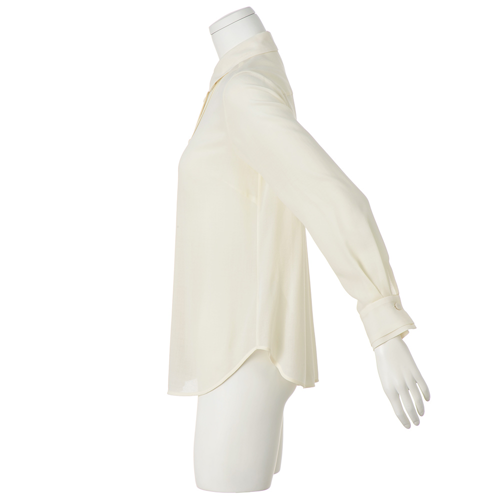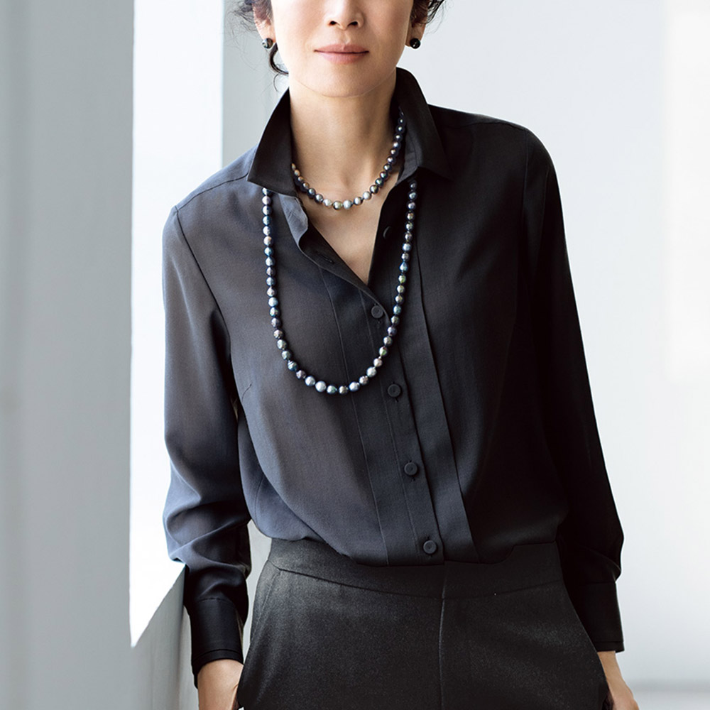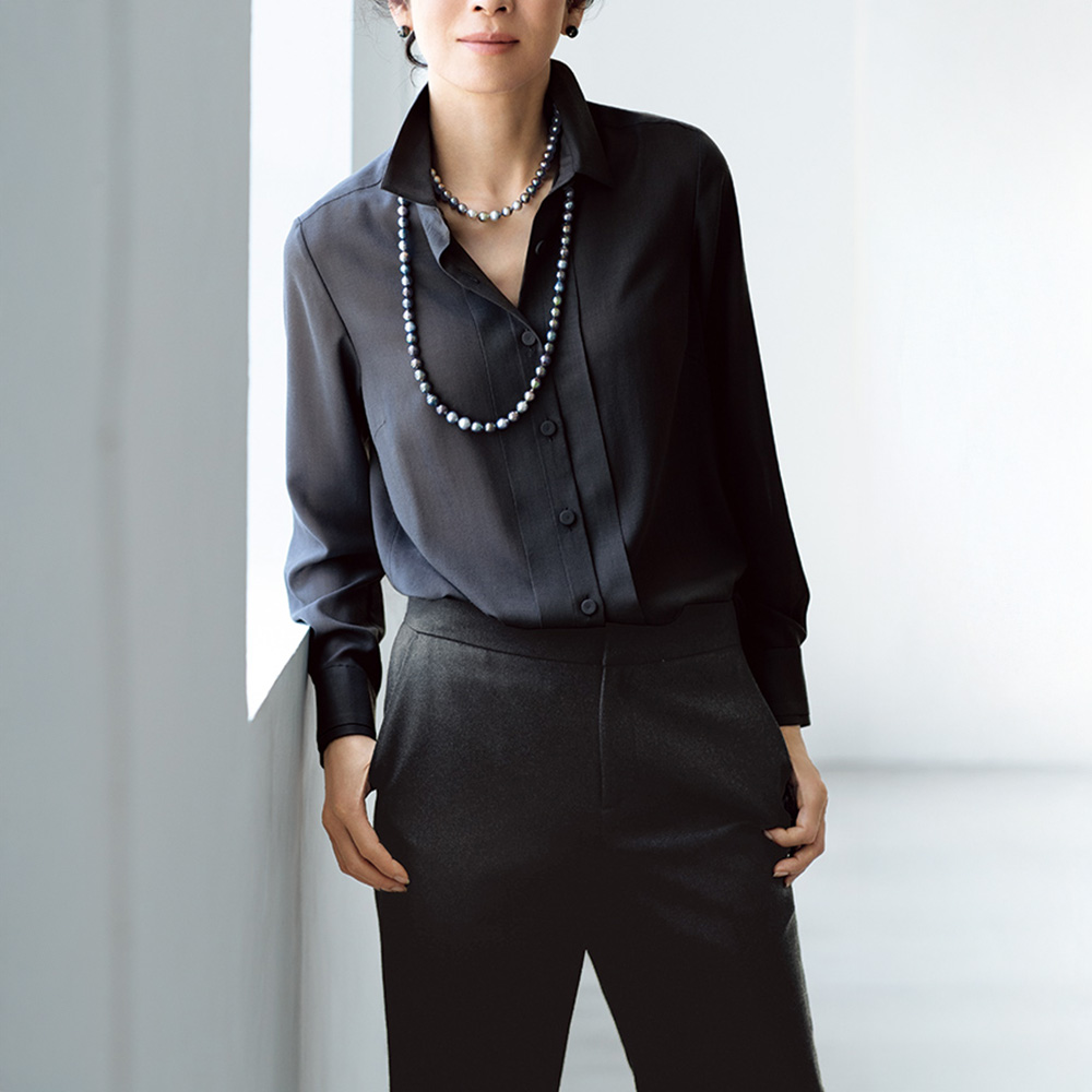 その人になじむさりげなさがお洒落の可能性を広げてくれる。シャツは、「NIKKE(日本毛織(株))」のMAFの中でもより高品質を追求して超細番手の糸で織り上げたシフォンジョーゼット。肌に語り掛けるような柔らかさと膨らみ、ドレープ性を備えたエアリーな生地感を、気負わず楽しんでいただきたくて…。たどり着いたのが、シャツカラー+セットインシルエットのクリーンなデザインです。前中心とカフスにタックを入れて透け感にメリハリをつけたり、共布くるみボタンで品よく遊んだり…細部まで繊細に仕立てました。POINT通常のMAFよりもさらに細いSuper160’s以上の原料を厳選したMAFのシフォン素材。得もいわれぬ軽さと柔らかさ、流麗なドレープ性が魅力です。幅広のタックが視線を集める前立てには、フラットな共布くるみボタンをトッピング。異素材を合わせない潔さが、より一層上質な雰囲気を醸します。