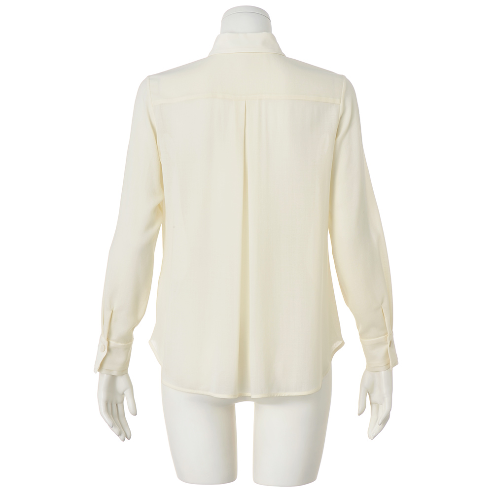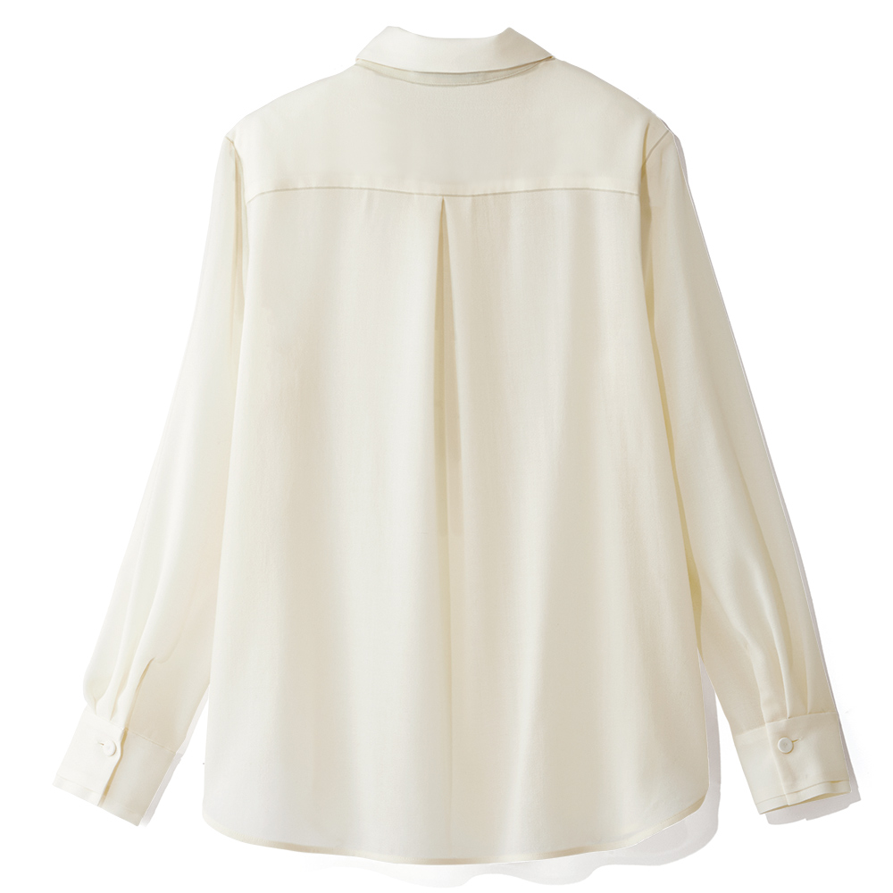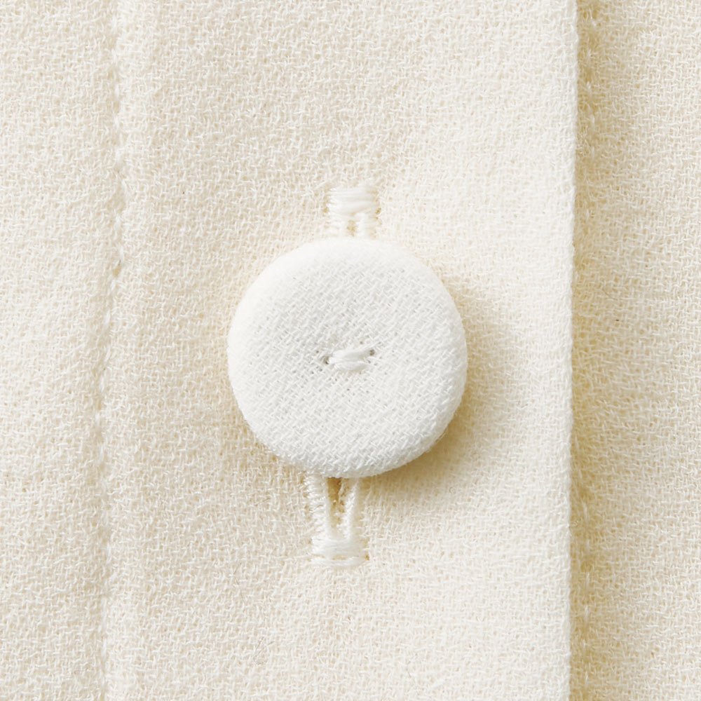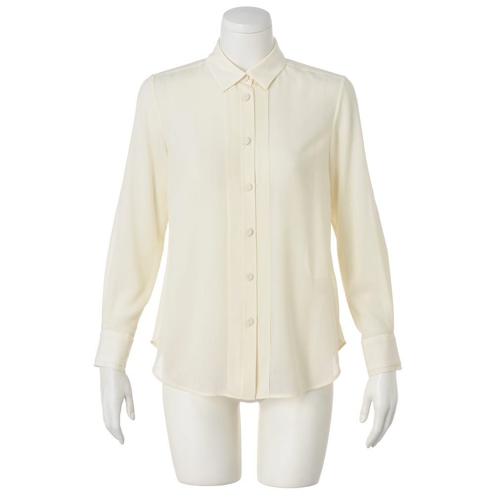 その人になじむさりげなさがお洒落の可能性を広げてくれる。シャツは、「NIKKE(日本毛織(株))」のMAFの中でもより高品質を追求して超細番手の糸で織り上げたシフォンジョーゼット。肌に語り掛けるような柔らかさと膨らみ、ドレープ性を備えたエアリーな生地感を、気負わず楽しんでいただきたくて…。たどり着いたのが、シャツカラー+セットインシルエットのクリーンなデザインです。前中心とカフスにタックを入れて透け感にメリハリをつけたり、共布くるみボタンで品よく遊んだり…細部まで繊細に仕立てました。POINT通常のMAFよりもさらに細いSuper160’s以上の原料を厳選したMAFのシフォン素材。得もいわれぬ軽さと柔らかさ、流麗なドレープ性が魅力です。幅広のタックが視線を集める前立てには、フラットな共布くるみボタンをトッピング。異素材を合わせない潔さが、より一層上質な雰囲気を醸します。