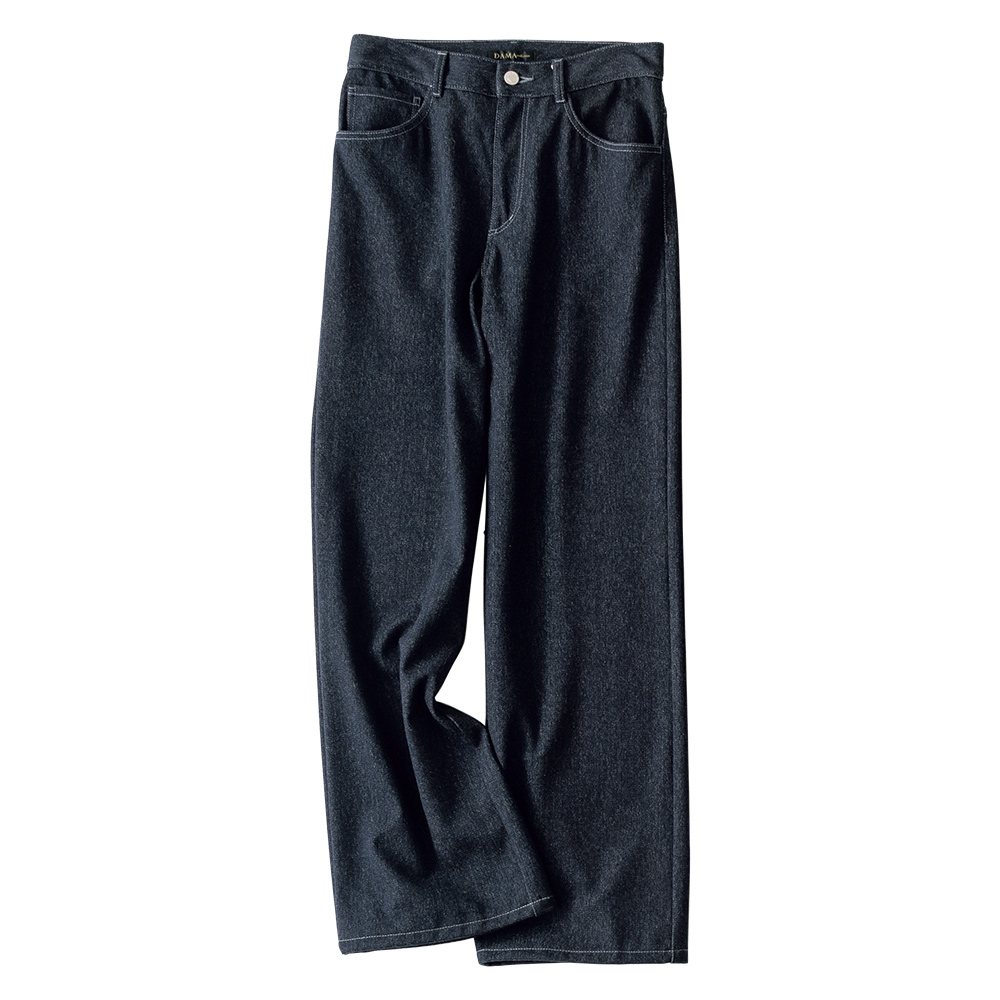 股ぐりやヨークの巻き縫い、裾裏・ベルト裏のチェーンステッチや5ポケットで本格的なデニム仕立てを踏襲しつつ大人が着こなしやすい股上深め、上品なトレンド感のあるセミワイドシルエットに。トップスをアウトすればこなれたリラックス感が香り、インすればすっきりとスタイルアップ!着こなし方で様々な佇まいを叶え、タイムレスに愛用できるベーシックアイテムとして要チェックです。≫ POINTステッチはダークインディゴカラーに映えるライトグレーの糸を使用。辛口シックなポイントに。
