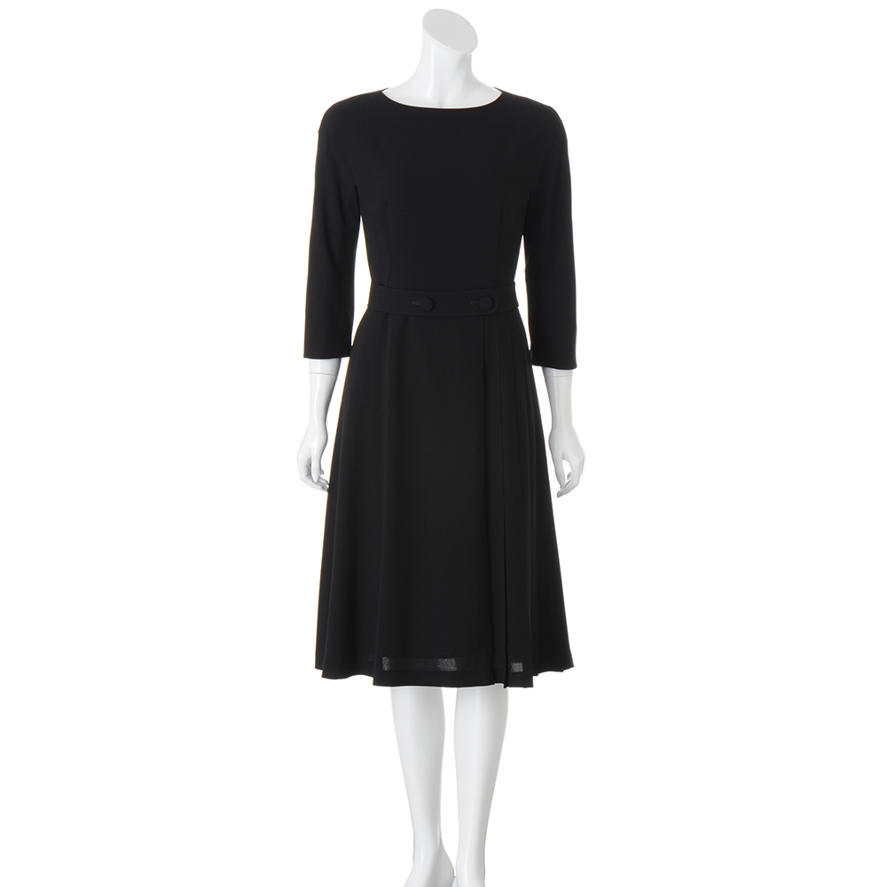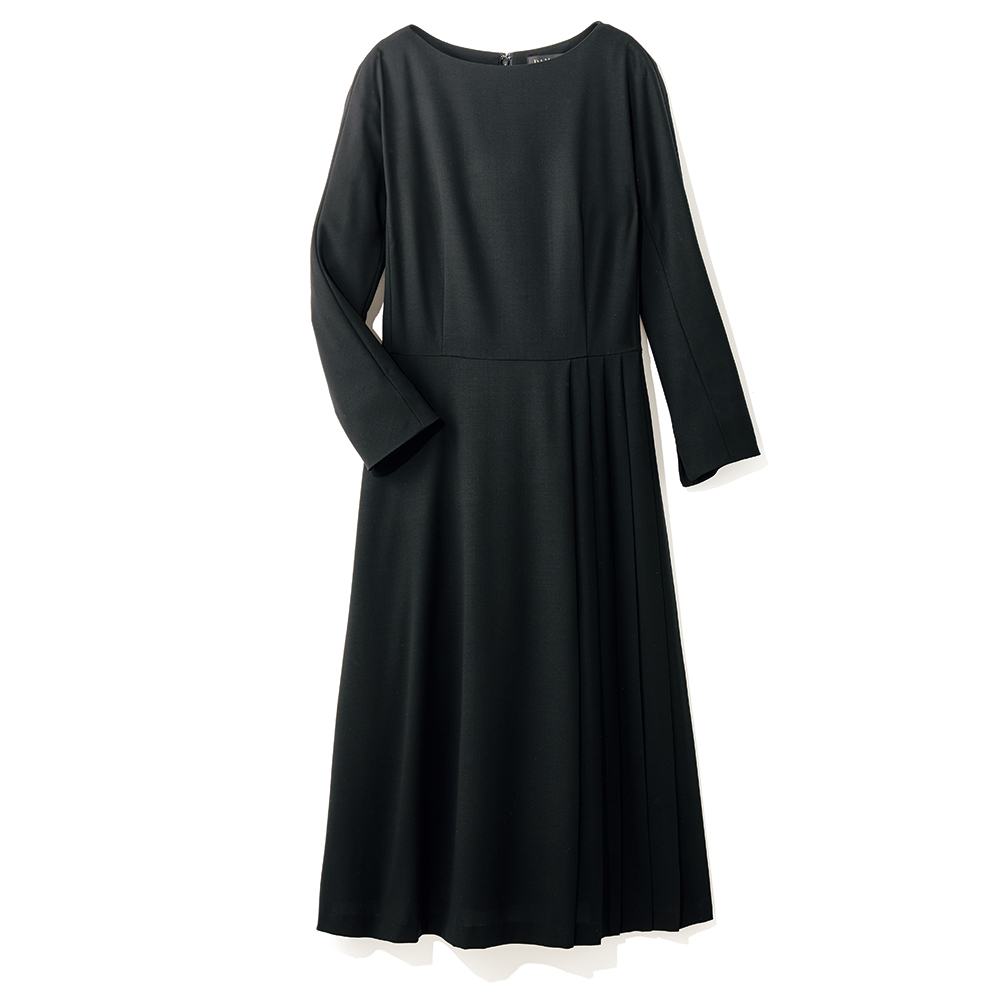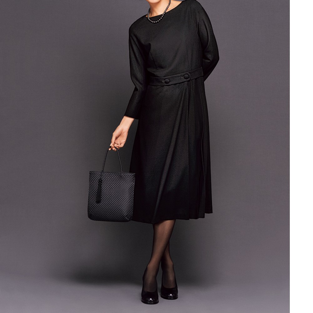 洗練と気品の気映えブラック強さと女性らしさ、気品とモード感。相反するエレメントを併せ持つブラックは、着こなす人の内面を映し出す色。おしゃれ歴を重ねた大人世代なら、魅力がいっそう際立ちます。そんな色の力を感じるためには、素材もデザインも拘り尽くしたアイテムを選ぶこと。洗練を極めるほどにセンシュアル。そんな黒の魔法を楽しんで。クラシカルな表情とモード感を併せ持つミモレ丈のワンピース。デザインポイントの一つは左前ウエストから裾にあしらったプリーツ。フィット&フレアシルエットのアクセントとして、柔らかに揺れるラインが動きを添えます。ウエストのシェイプは前後身頃の左右に各1本ずつ取ったダーツで表現しながら、着心地のよい適度なゆとりをキープ。襟ぐりはボートネック風の開きで、露出を抑えた上品な襟元を演出しつつ、袖は見返し幅を広く取ったスリット入りで、折り返して着ても美しいデザイン。付属のくるみボタンをあしらった共布ベルトの着け外しで、二つの表情が楽しめるのも魅力です。≫ POINT・シンプルであるほど、デザインの力が問われるもの。「NIKKE(日本毛織(株))」のMAF(マフ)シングルジョーゼットを多彩にデザインした厳選のアイテムなら、その妙味を堪能できます。・ニュージーランドの希少なメリノウール「マフ」の強撚糸を使ったクレープジョーゼット。柔らかくしなやかなので、身頃続きのドルマンスリーブも美しく。