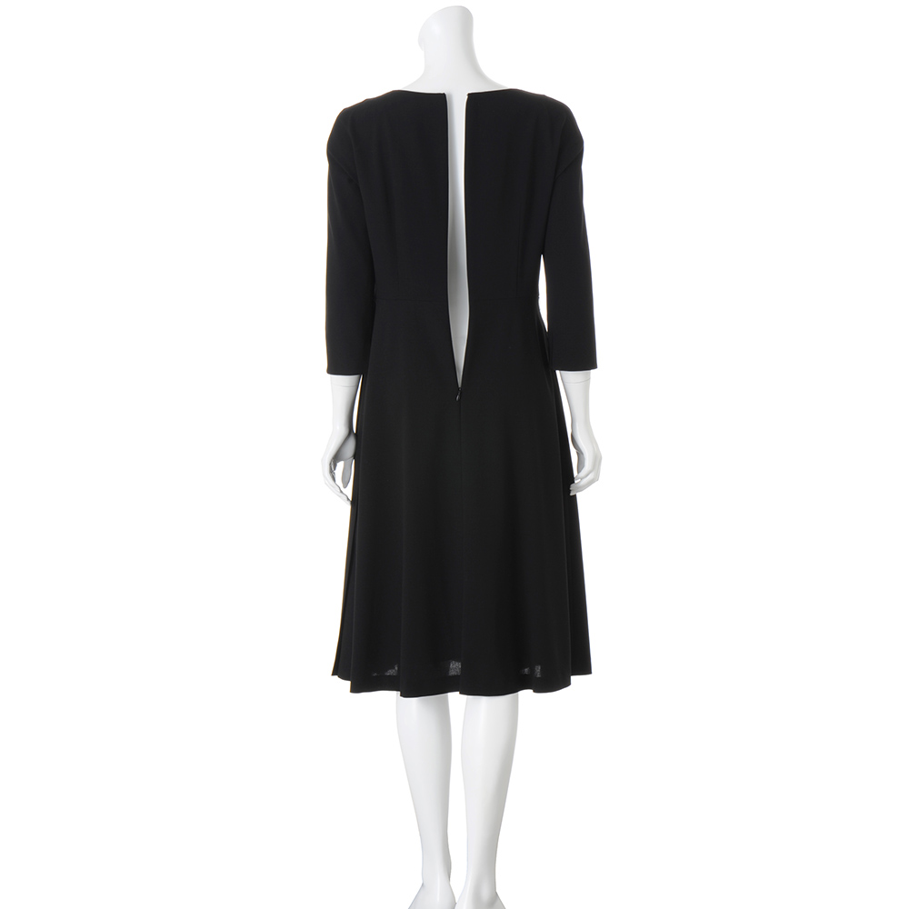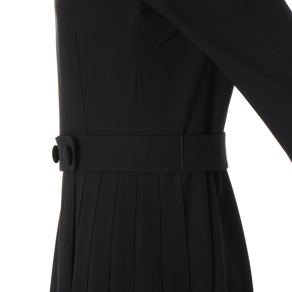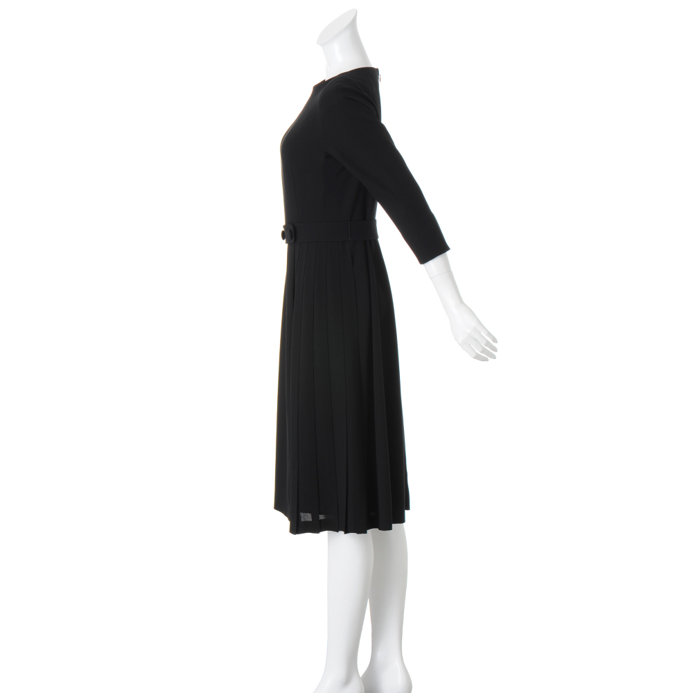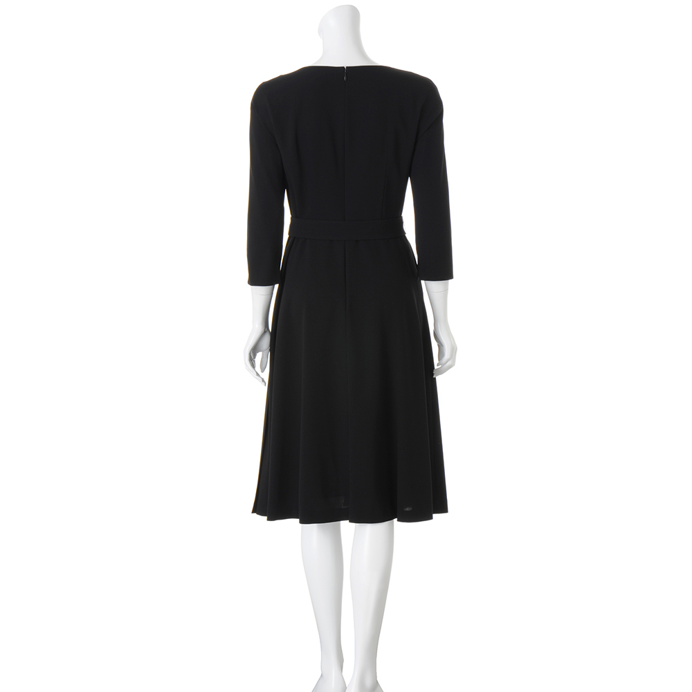 洗練と気品の気映えブラック強さと女性らしさ、気品とモード感。相反するエレメントを併せ持つブラックは、着こなす人の内面を映し出す色。おしゃれ歴を重ねた大人世代なら、魅力がいっそう際立ちます。そんな色の力を感じるためには、素材もデザインも拘り尽くしたアイテムを選ぶこと。洗練を極めるほどにセンシュアル。そんな黒の魔法を楽しんで。クラシカルな表情とモード感を併せ持つミモレ丈のワンピース。デザインポイントの一つは左前ウエストから裾にあしらったプリーツ。フィット&フレアシルエットのアクセントとして、柔らかに揺れるラインが動きを添えます。ウエストのシェイプは前後身頃の左右に各1本ずつ取ったダーツで表現しながら、着心地のよい適度なゆとりをキープ。襟ぐりはボートネック風の開きで、露出を抑えた上品な襟元を演出しつつ、袖は見返し幅を広く取ったスリット入りで、折り返して着ても美しいデザイン。付属のくるみボタンをあしらった共布ベルトの着け外しで、二つの表情が楽しめるのも魅力です。≫ POINT・シンプルであるほど、デザインの力が問われるもの。「NIKKE(日本毛織(株))」のMAF(マフ)シングルジョーゼットを多彩にデザインした厳選のアイテムなら、その妙味を堪能できます。・ニュージーランドの希少なメリノウール「マフ」の強撚糸を使ったクレープジョーゼット。柔らかくしなやかなので、身頃続きのドルマンスリーブも美しく。