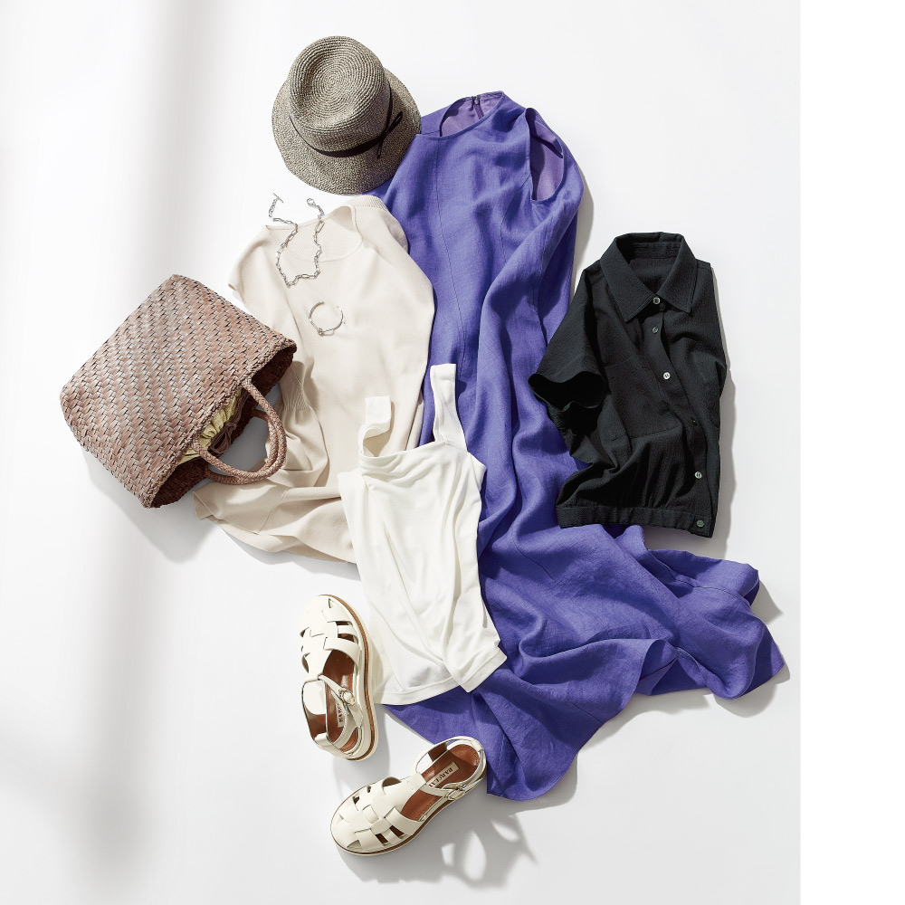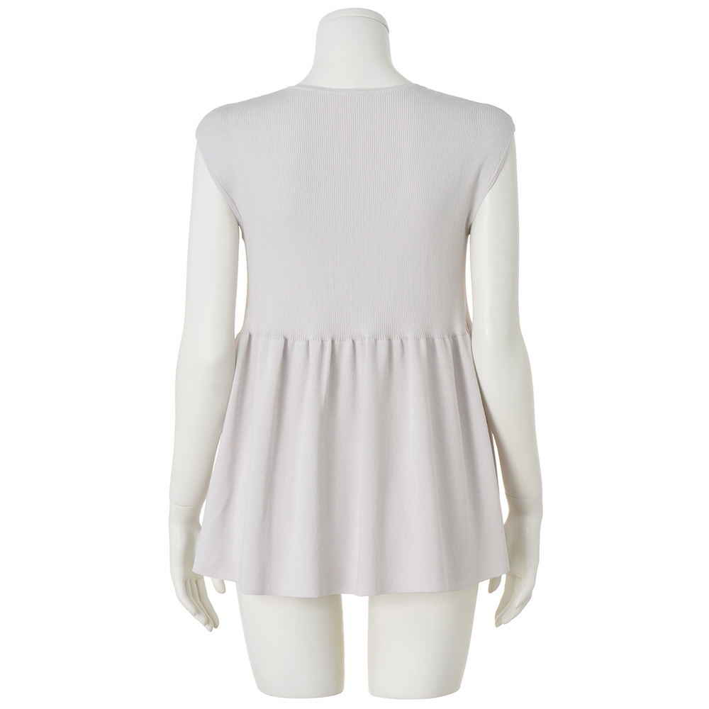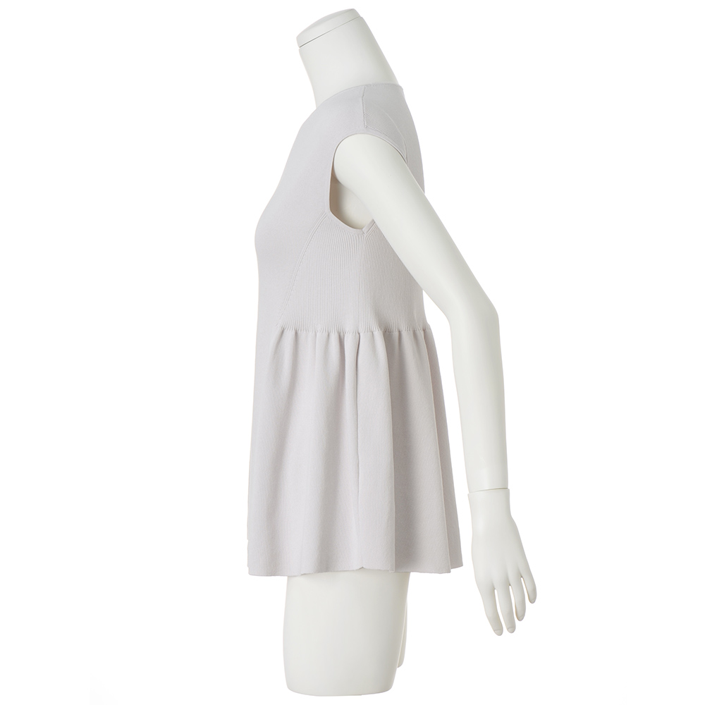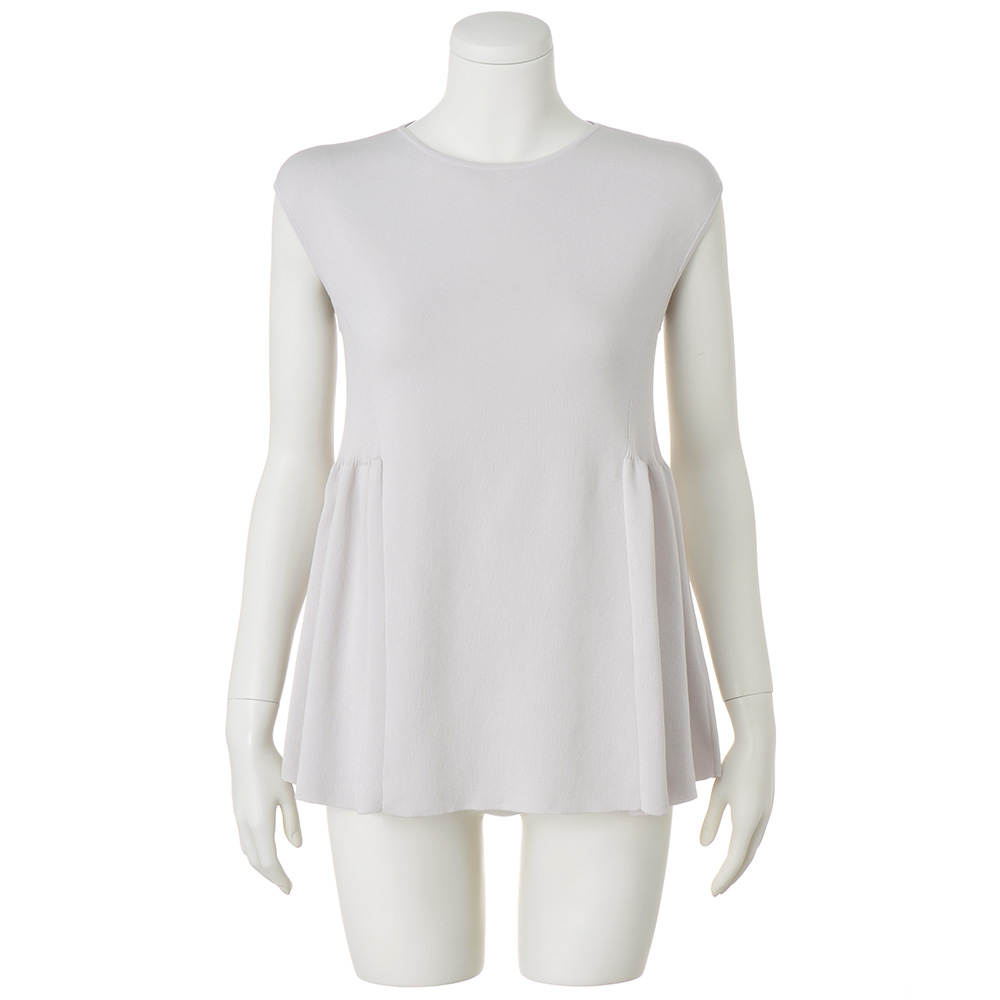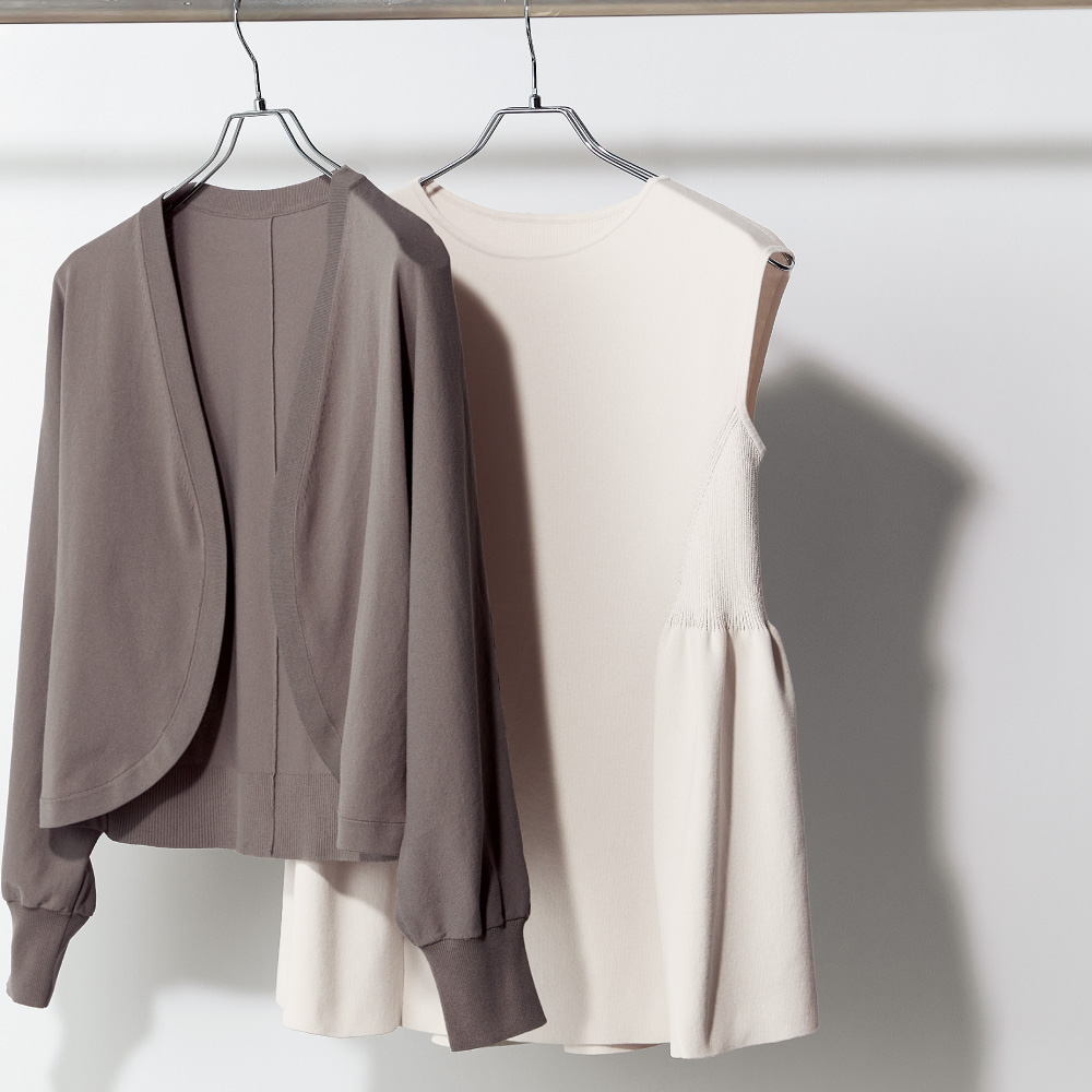 さりげない甘さが、大人にちょうどいい「強撚糸」。もっちりなめらか、軽い着心地は、強撚コットン糸と、ストレッチ性と形態安定に優れた機能繊維「SOLOTEX(R)(ソロテックス)」を撚り合わせたニットだから。プルオーバーはなんと言っても編み地切り替えで表現したペプラムがチャーミング!前身頃脇から後ろ身頃に向かって上側はリブ編み、下側は総針編みの仕様です。フロントのパネルライン風の編み地切り替えは細見えにも効果を発揮。