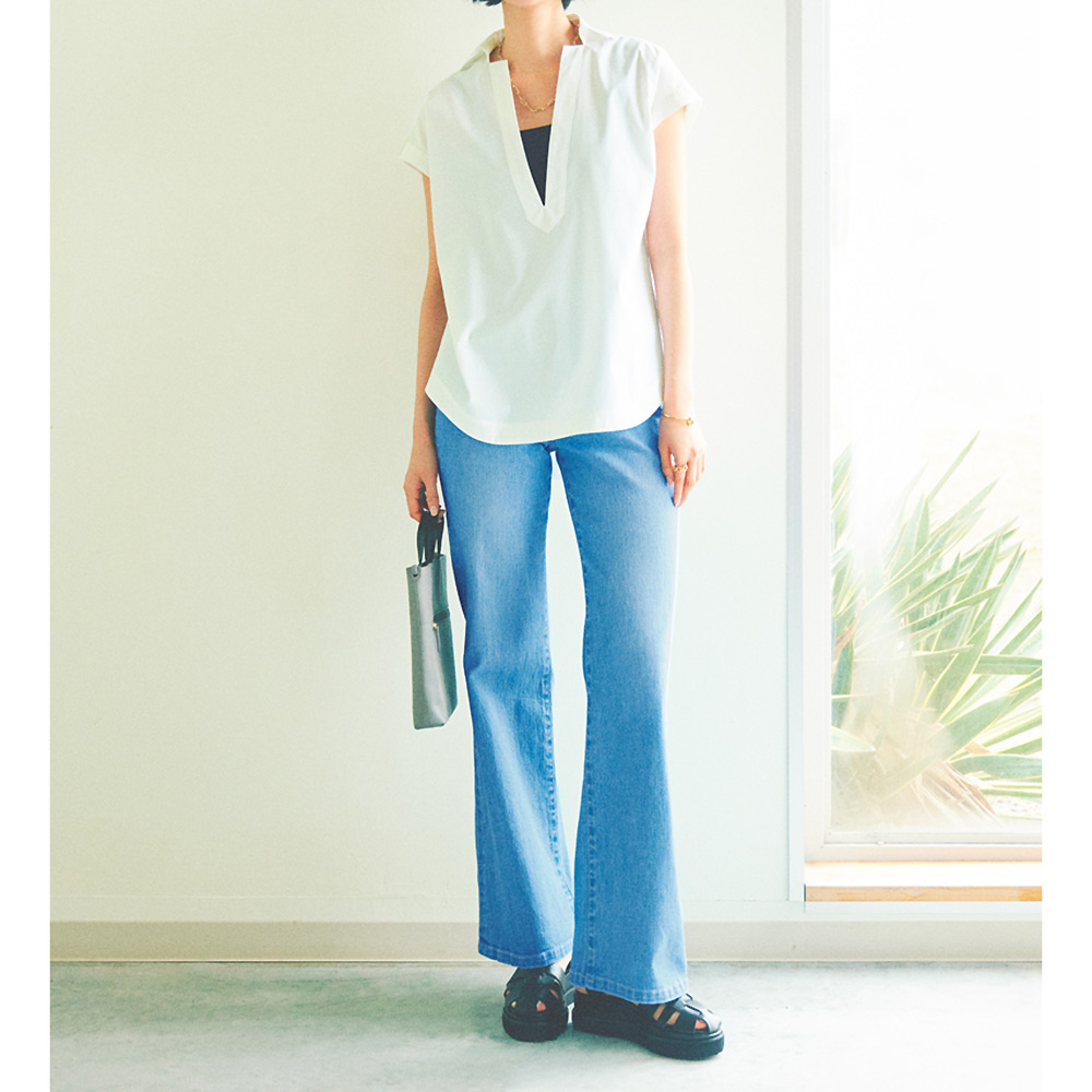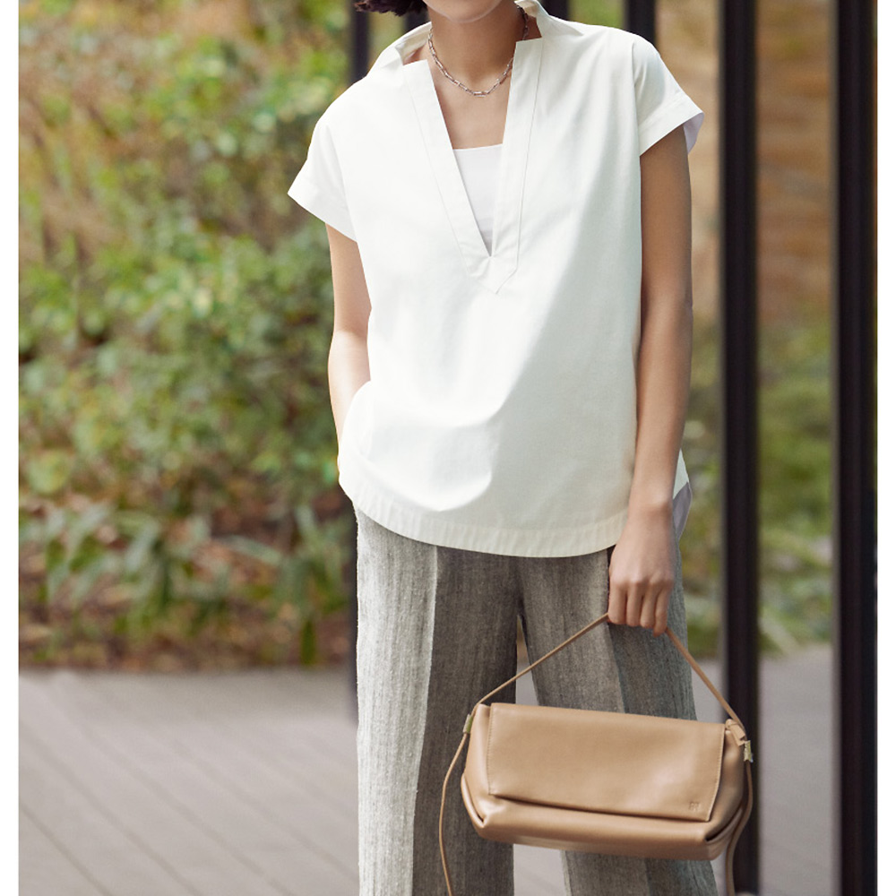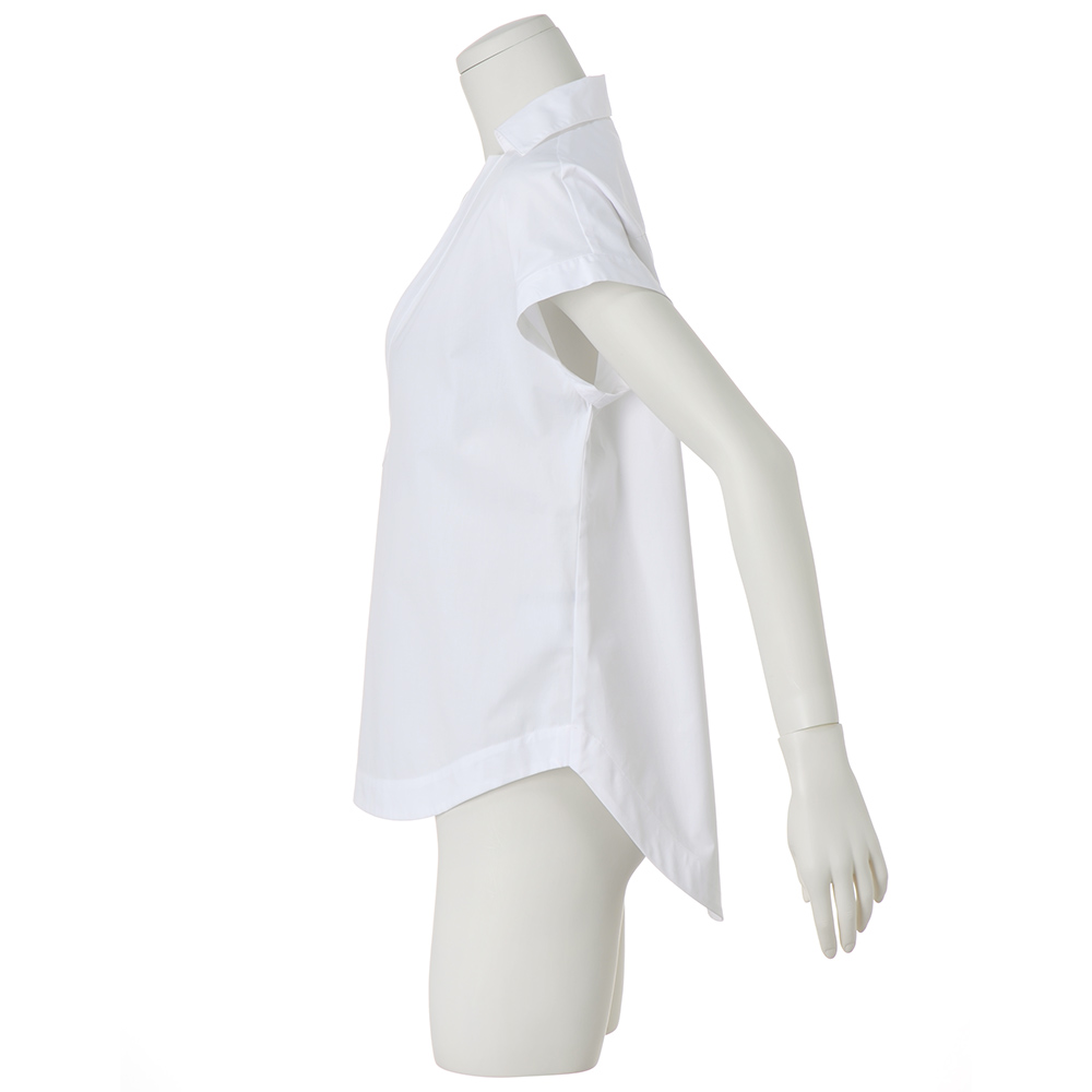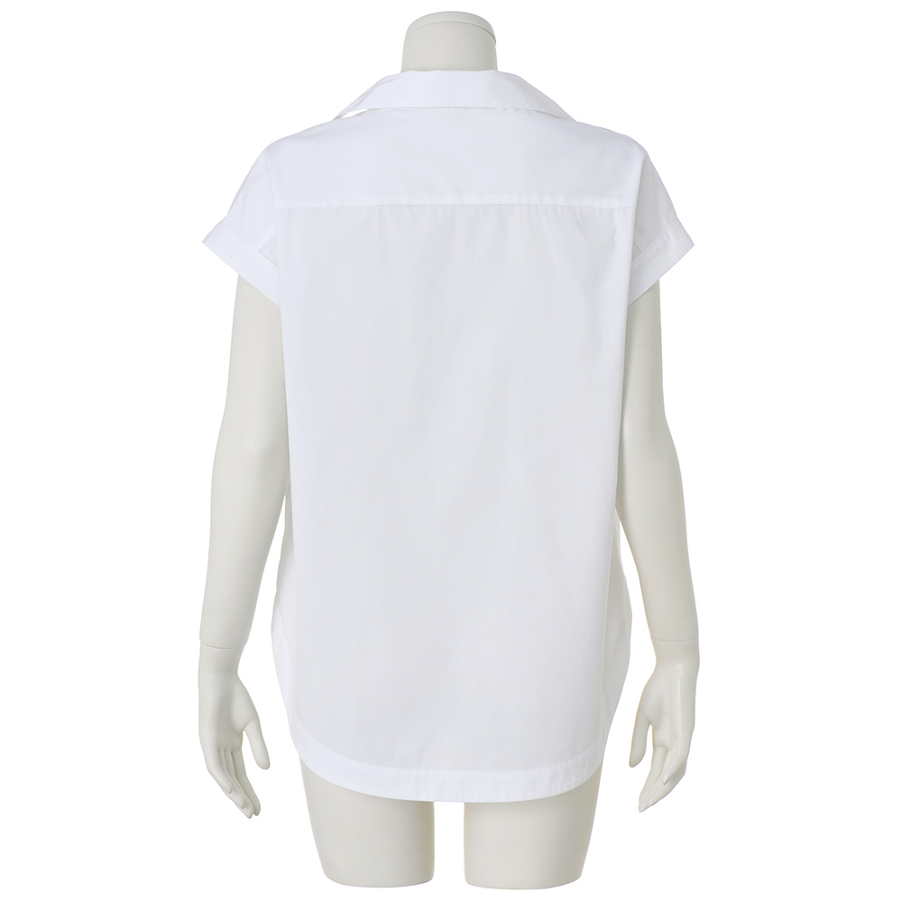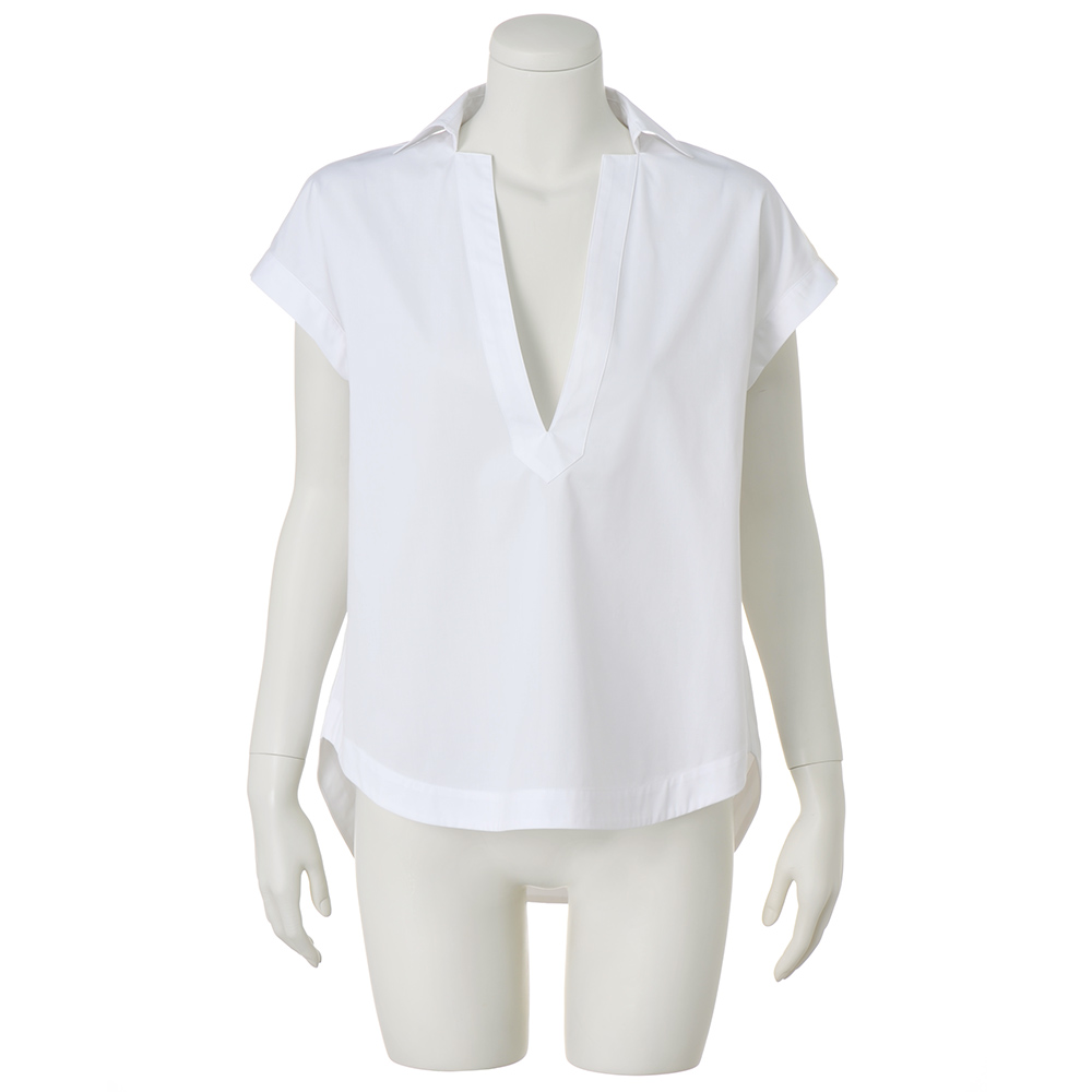 理知的な表情を明るく照らす「白シャツ」折り目正しい印象ながら、風通しのよい爽やかな着心地の襟付きシャツ。ゆとりあるシルエットを深いV開きがシャープに切り取ります。肌に優しいコットン混素材に接触冷感とUVカット機能をプラス。フレンチスリーブやカーブをつけた前後差のある裾などが、シャキッとした潔いフォルムをキープする秘訣。