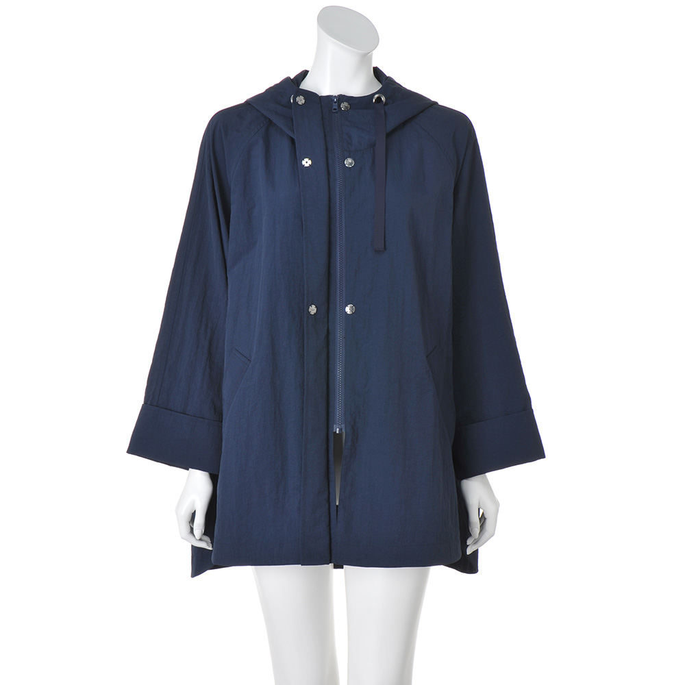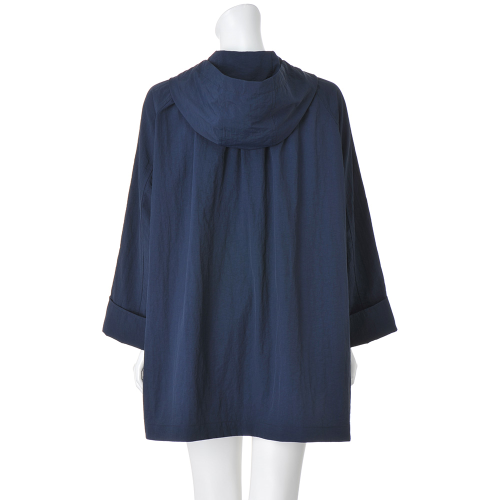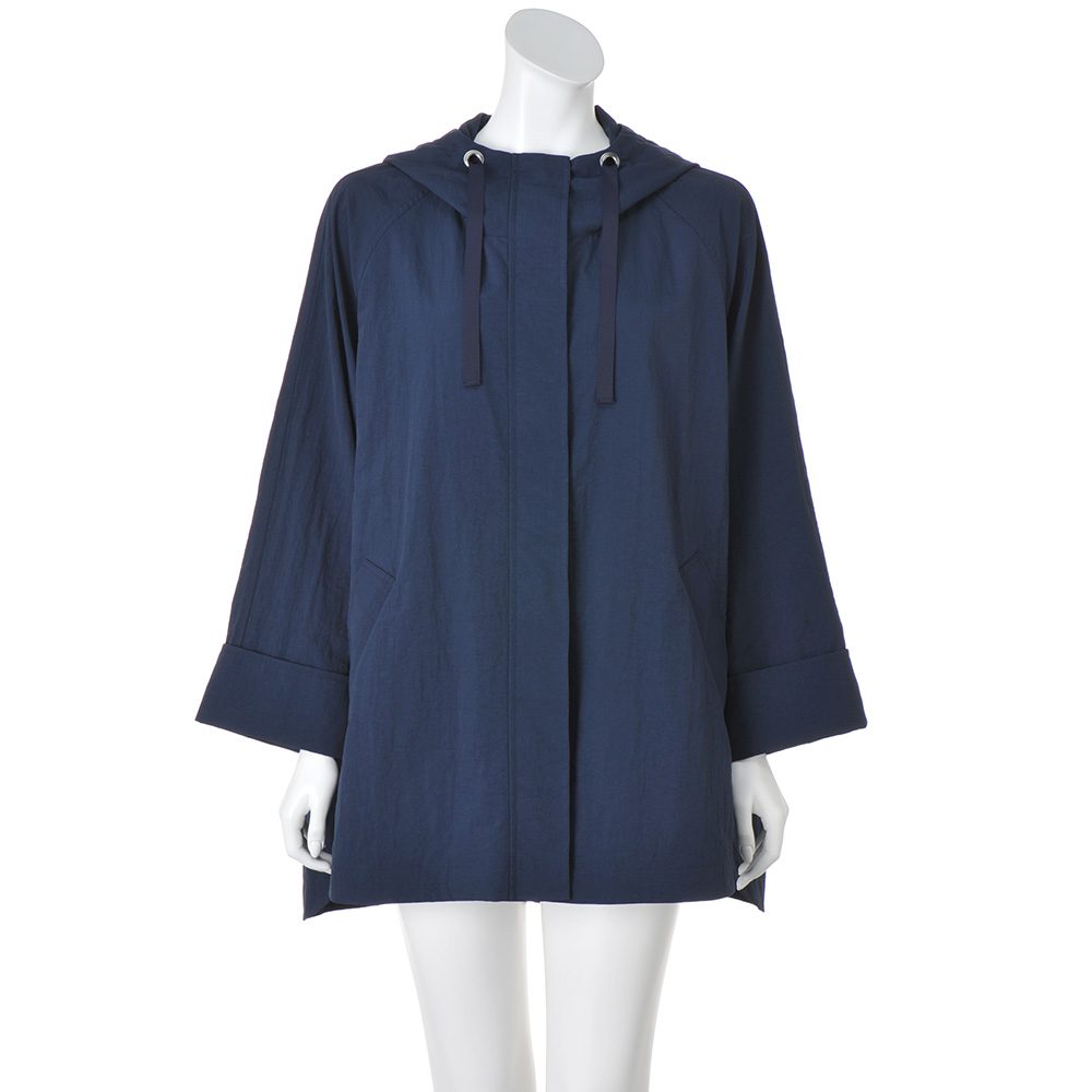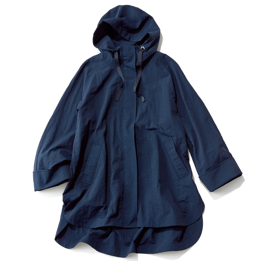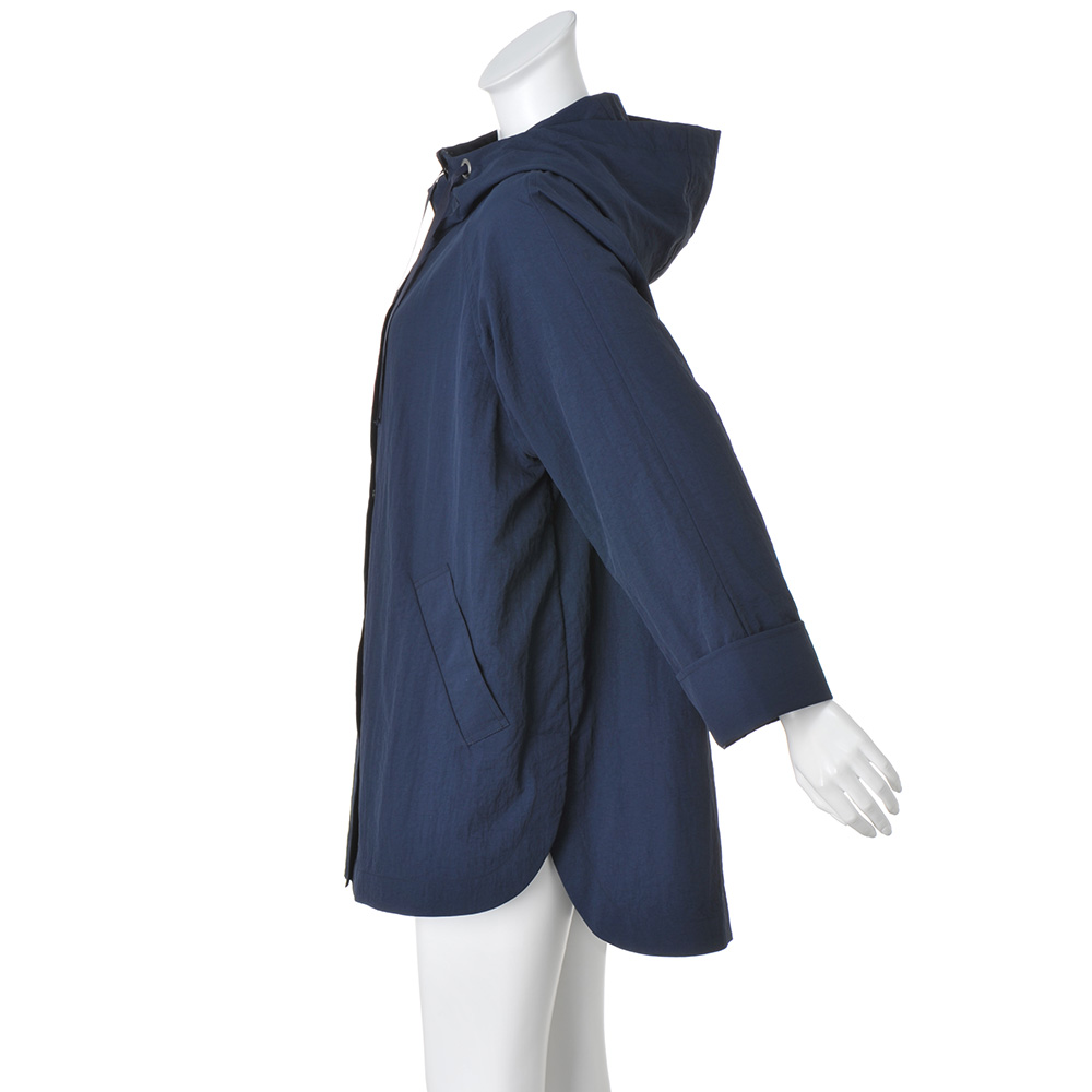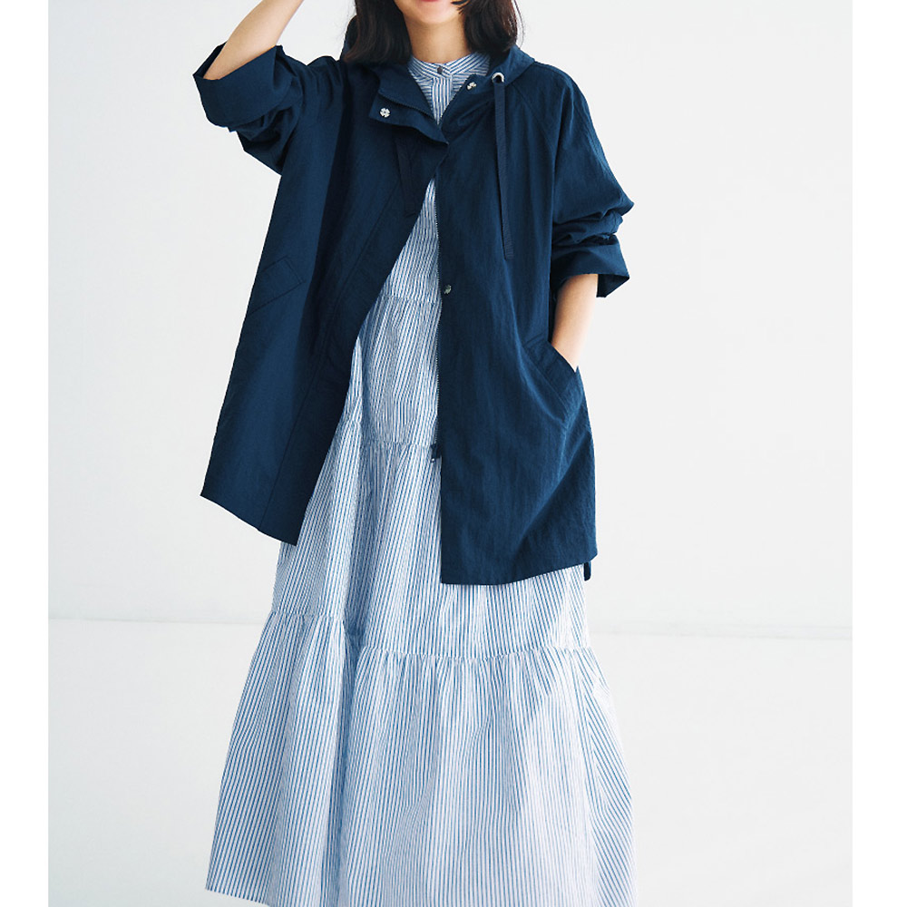 これさえあれば多少の雨風も笑顔で気軽にパサっと羽織れる、はっ水素材のライトブルゾン。UVカット性も備え、日差しからも素肌をガードしてくれます。ファスナーに添えたメタルスナップや、続きフードのドローストリングにはグログランテープを使って、脱スポーティなデザインに。ゆったりとしたラグラン袖は折り返しカフスで華やかに仕上げました。裾に向かって広がるテントラインと相まって、着る度に晴れやかな気持ちに包まれます。≫ POINT前後差のある裾はサイドのカーブで軽快に。立ち上がりを付けた続きフードが顔周りを華やかに演出。