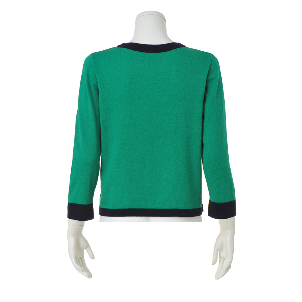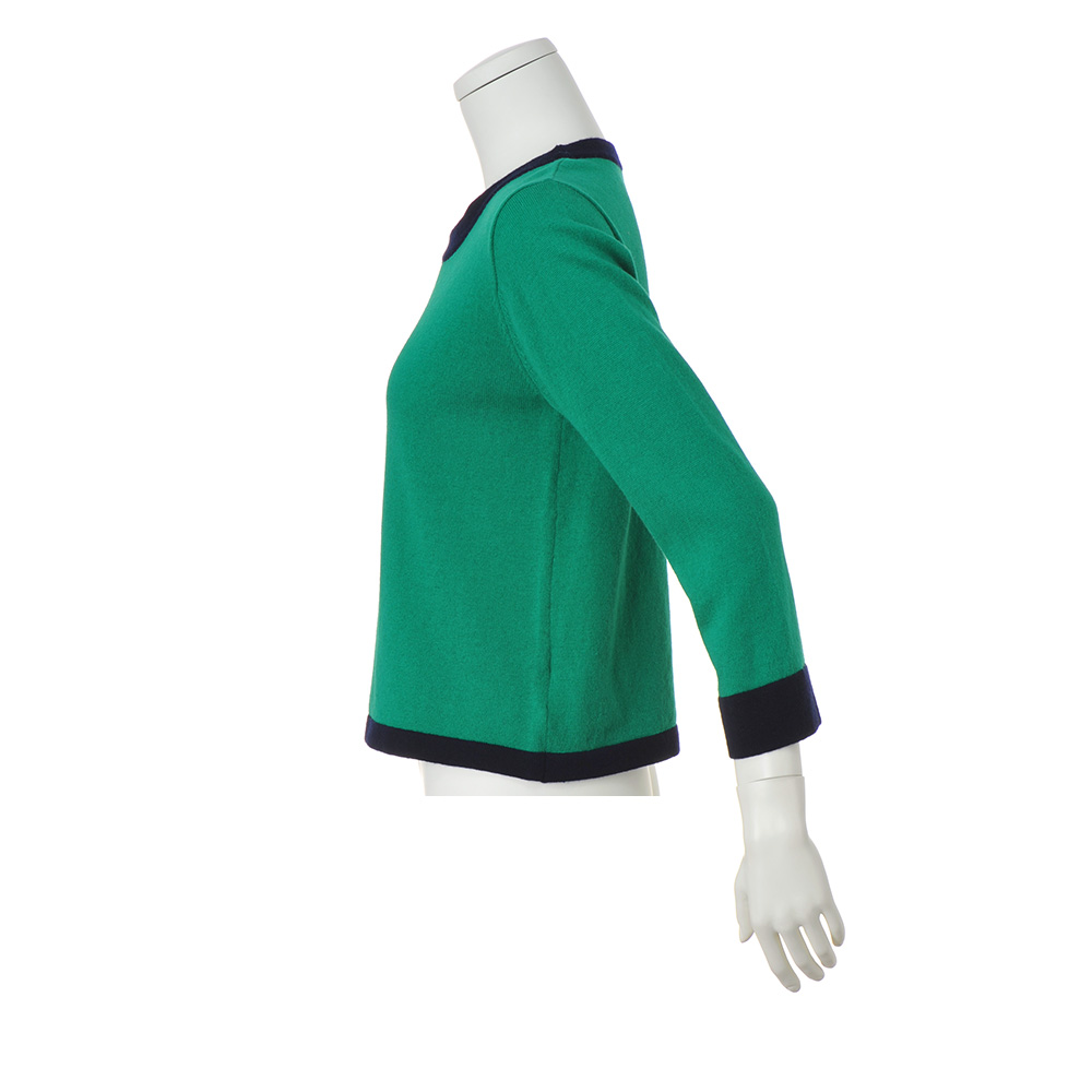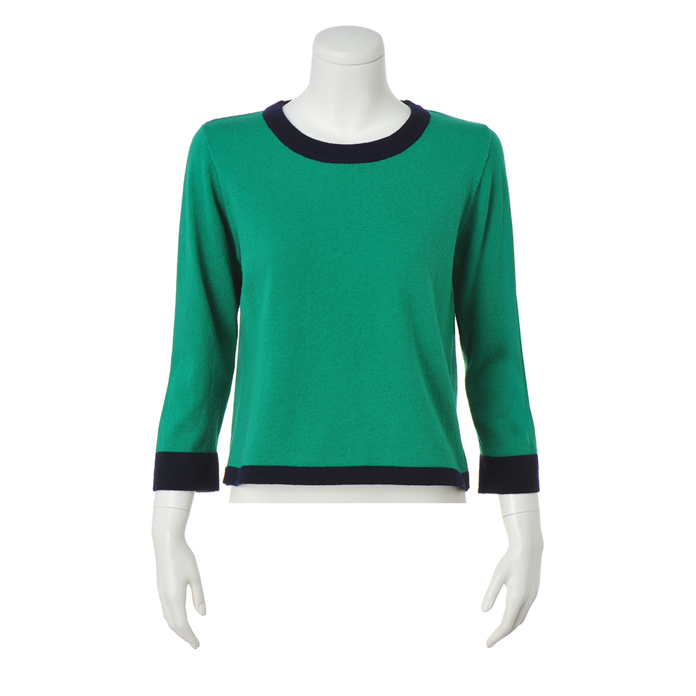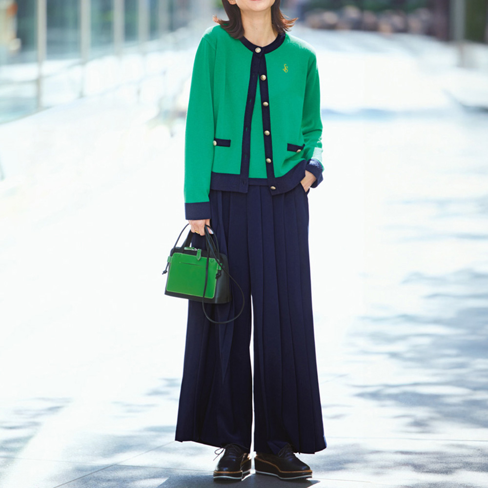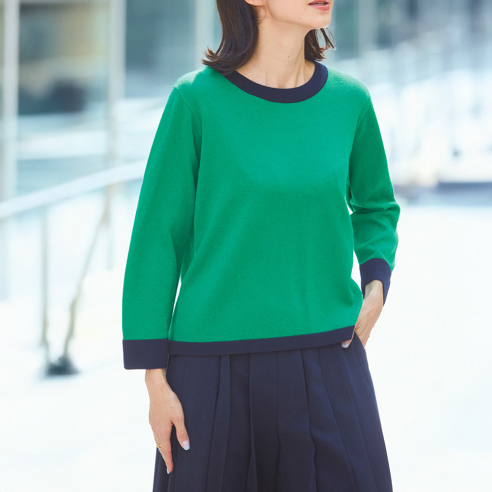 軸になるのは、きちんと感と華やかさ。好印象Styleグリーン×ネイビーの配色が女性らしい印象のアンサンブル。プルオーバーは8分袖で華奢見え効果も。ネイビーの配色ライン幅は部分ごとに変化をつけ、セットでも単品でもニュアンスのある着こなしを叶えます。