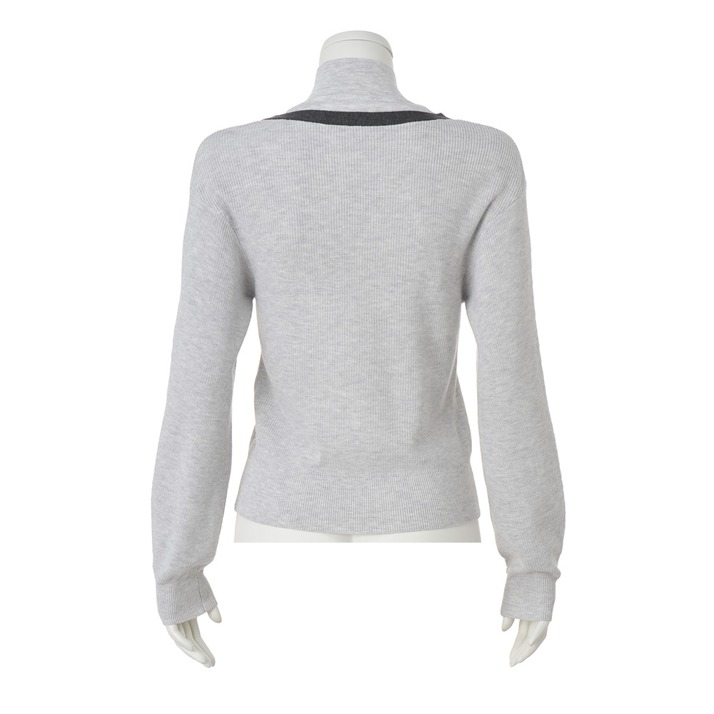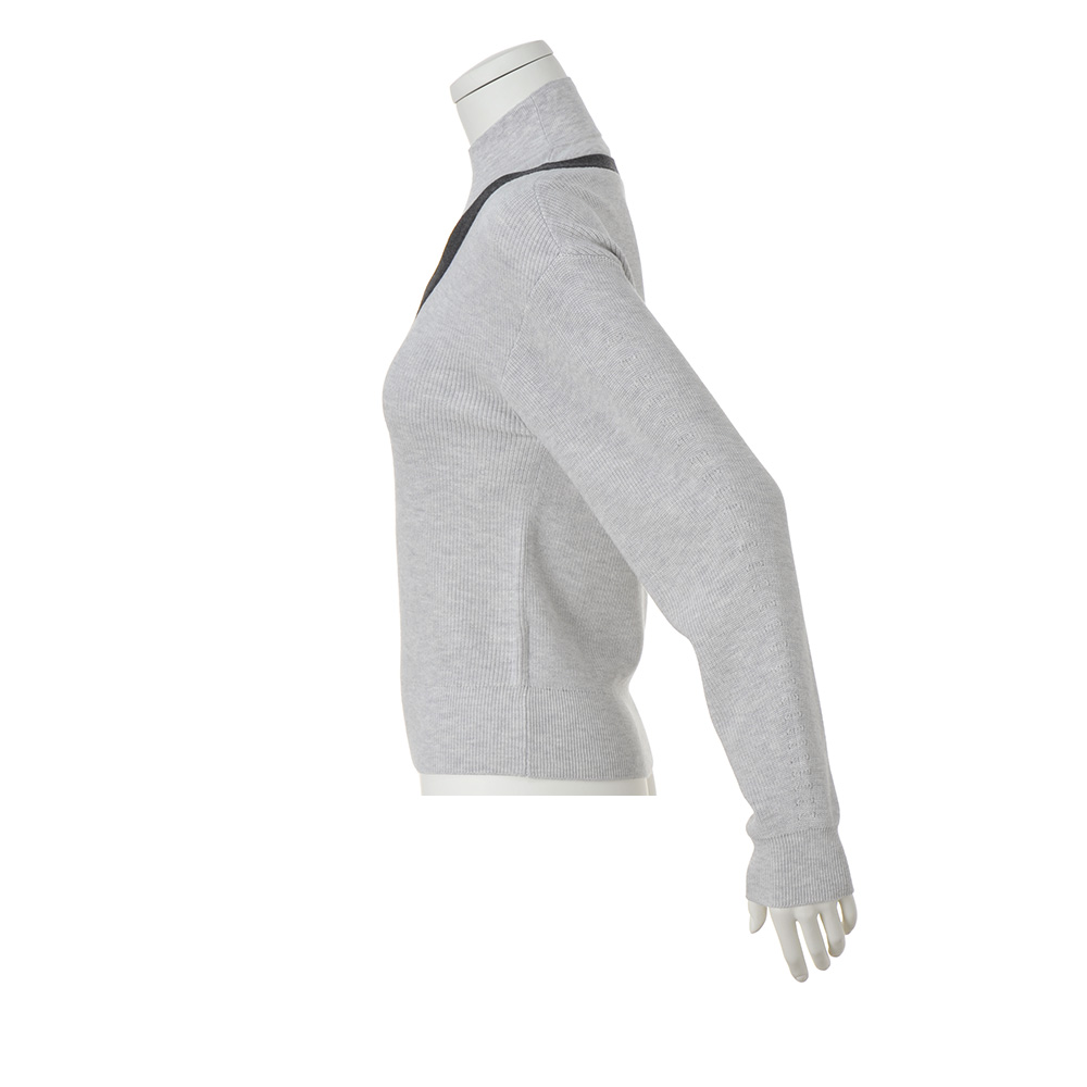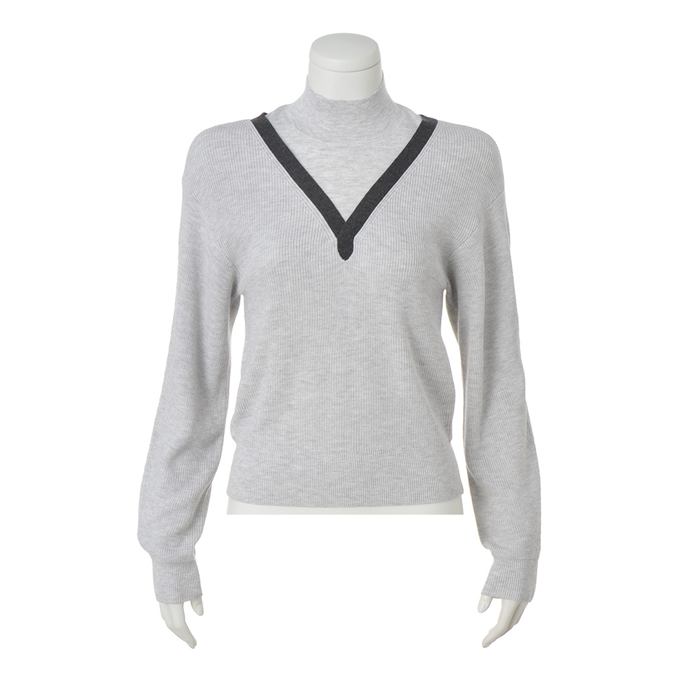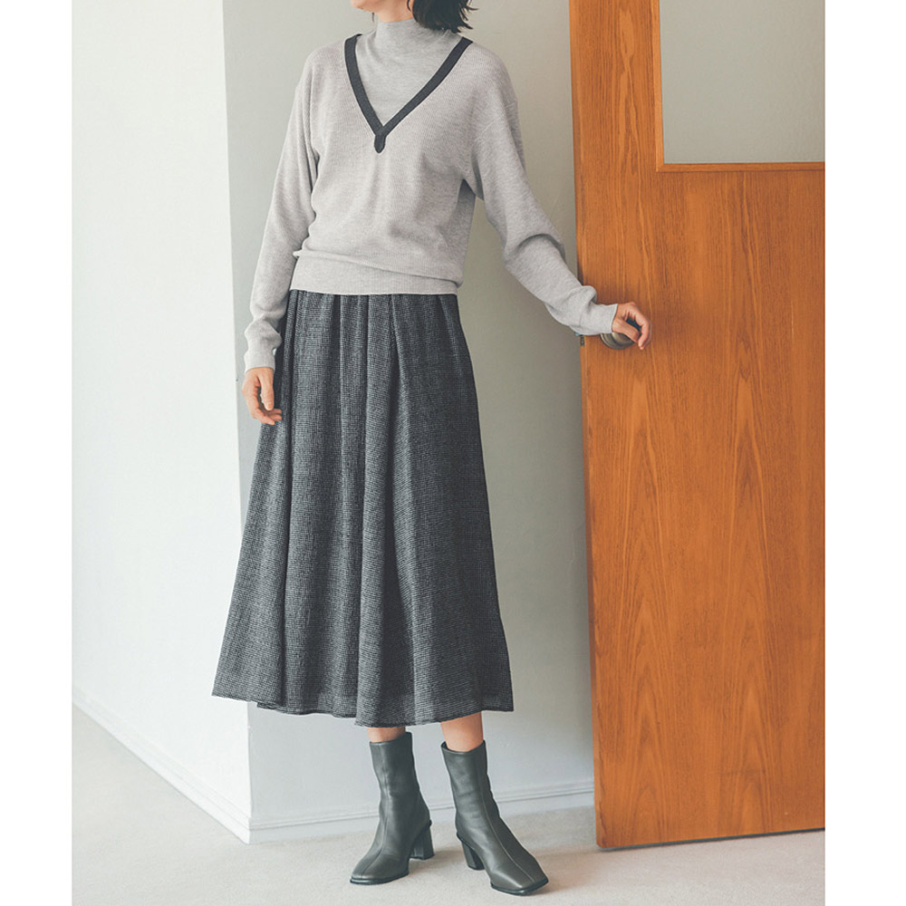 私を心地よくしてくれる服を着て、さあ、今日はどこに行こうハイネック部分は天竺、身頃は片畦と編み地に変化をもたせ、レイヤード感を演出したニットプルオーバー。Vネック部分にチャコールグレーの総針テープを配し、よりリアルな重ね着感と顔まわりをすっきり見せる工夫をプラス。