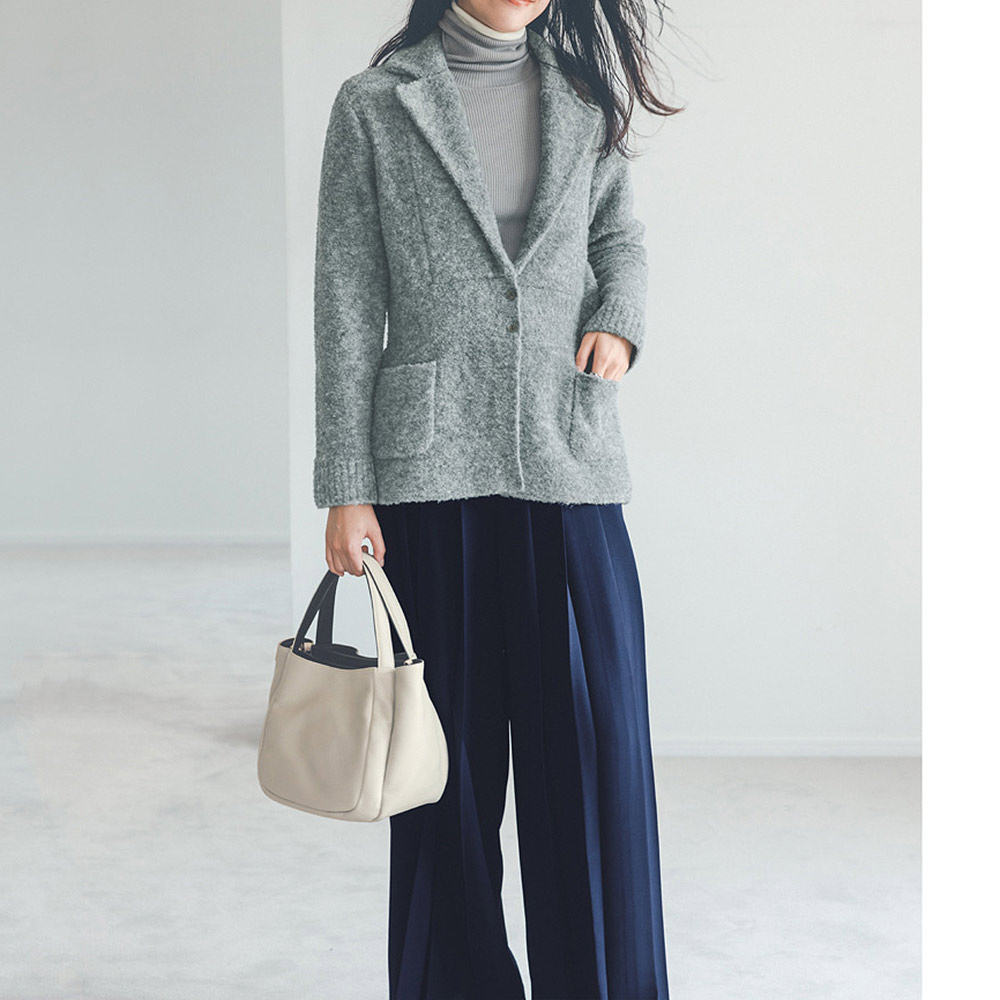 ふんわりやさしいブークレニットでエフォートレスなジャケットスタイルに表情のあるブークレ糸を使用したニットジャケット。ヒップが程よく隠れる丈感は、ウエストを切り替えることでほっそり見えのシルエットに。きちんと感をキープしつつ、ニットならではの柔らかな着心地を楽しめます。
