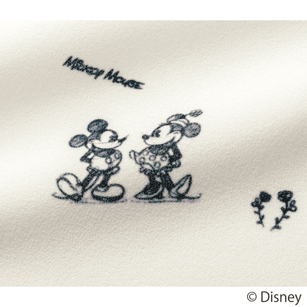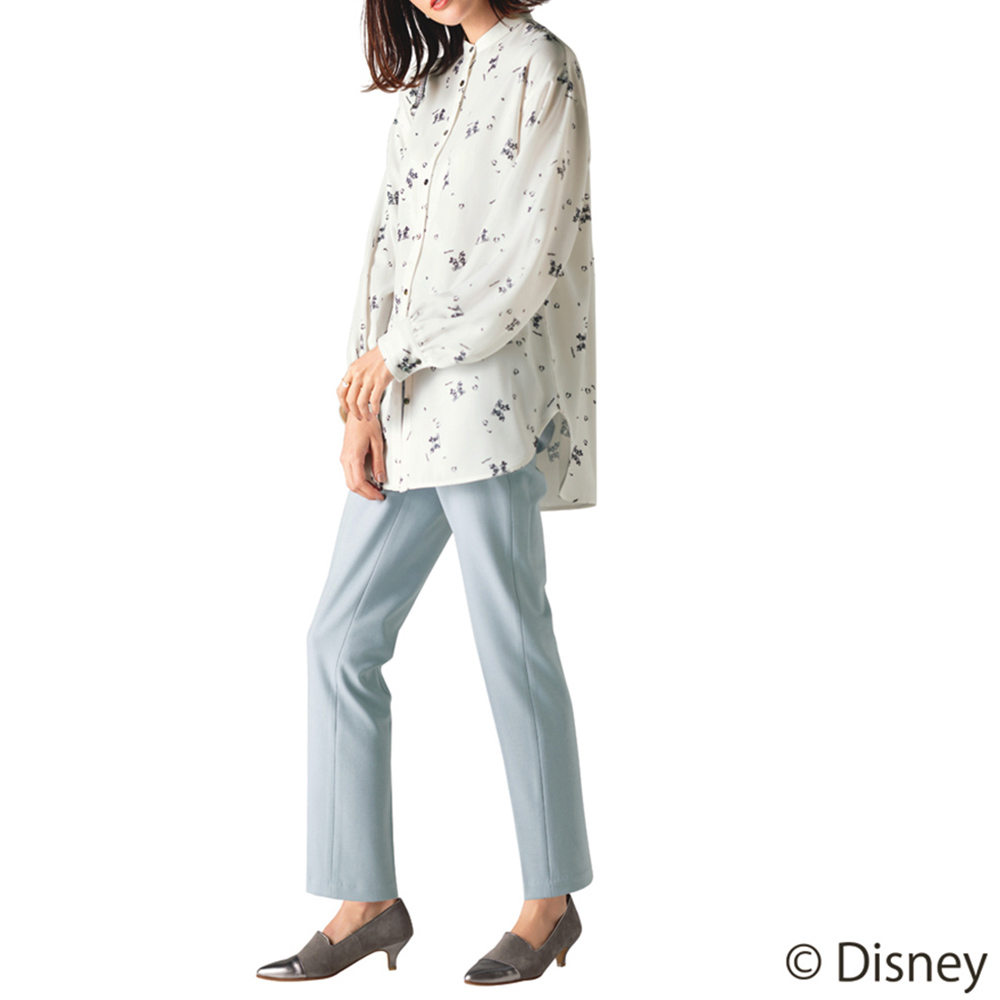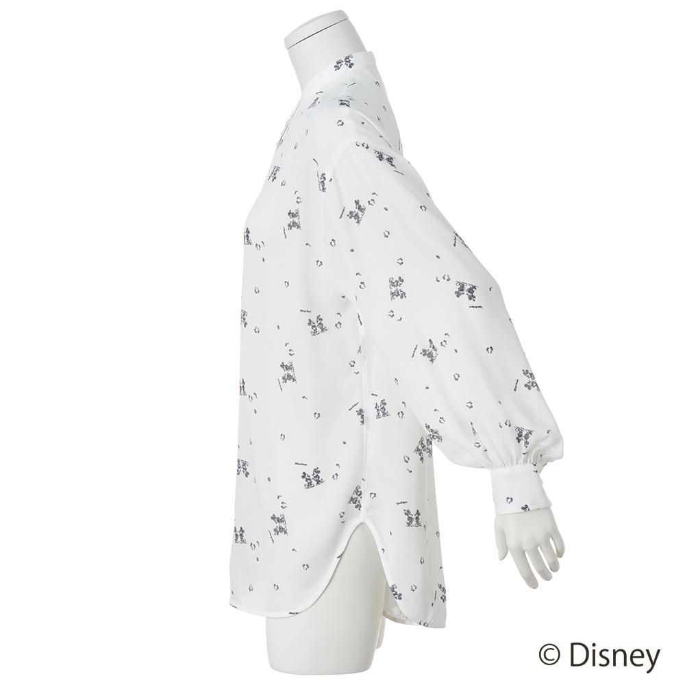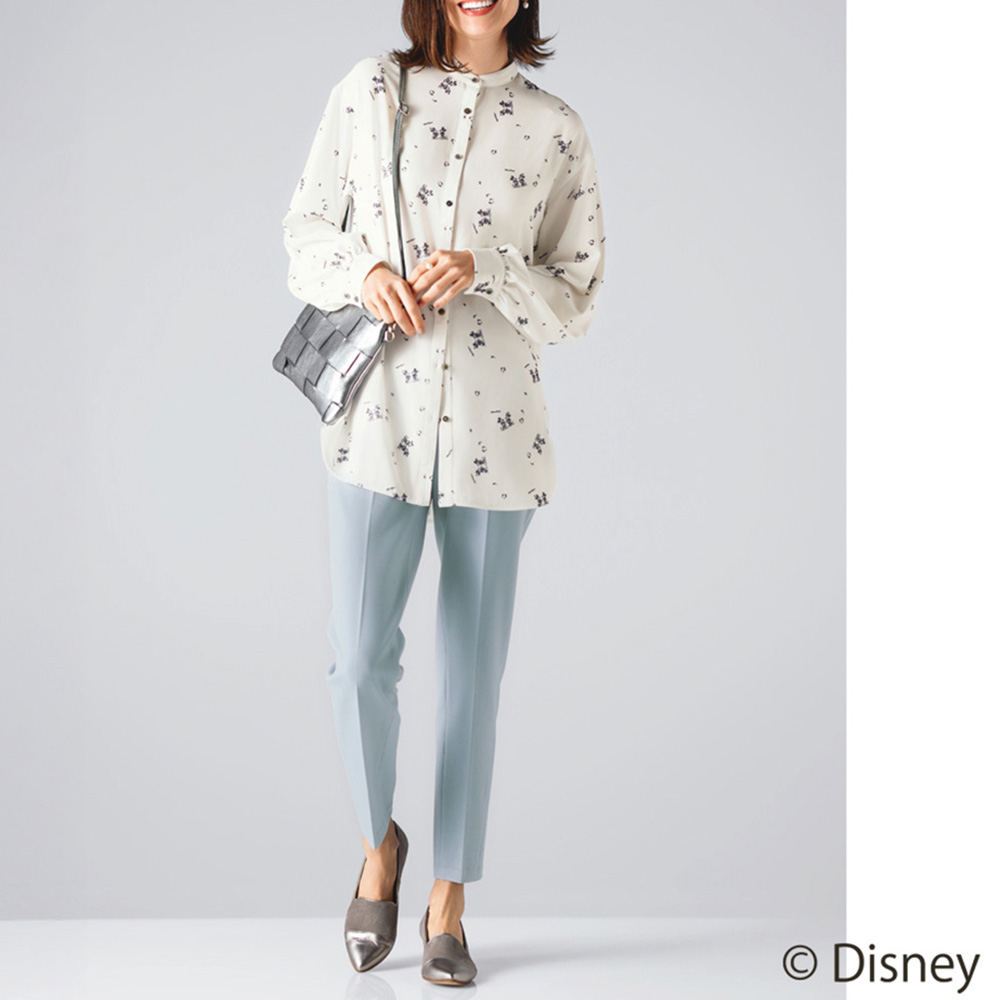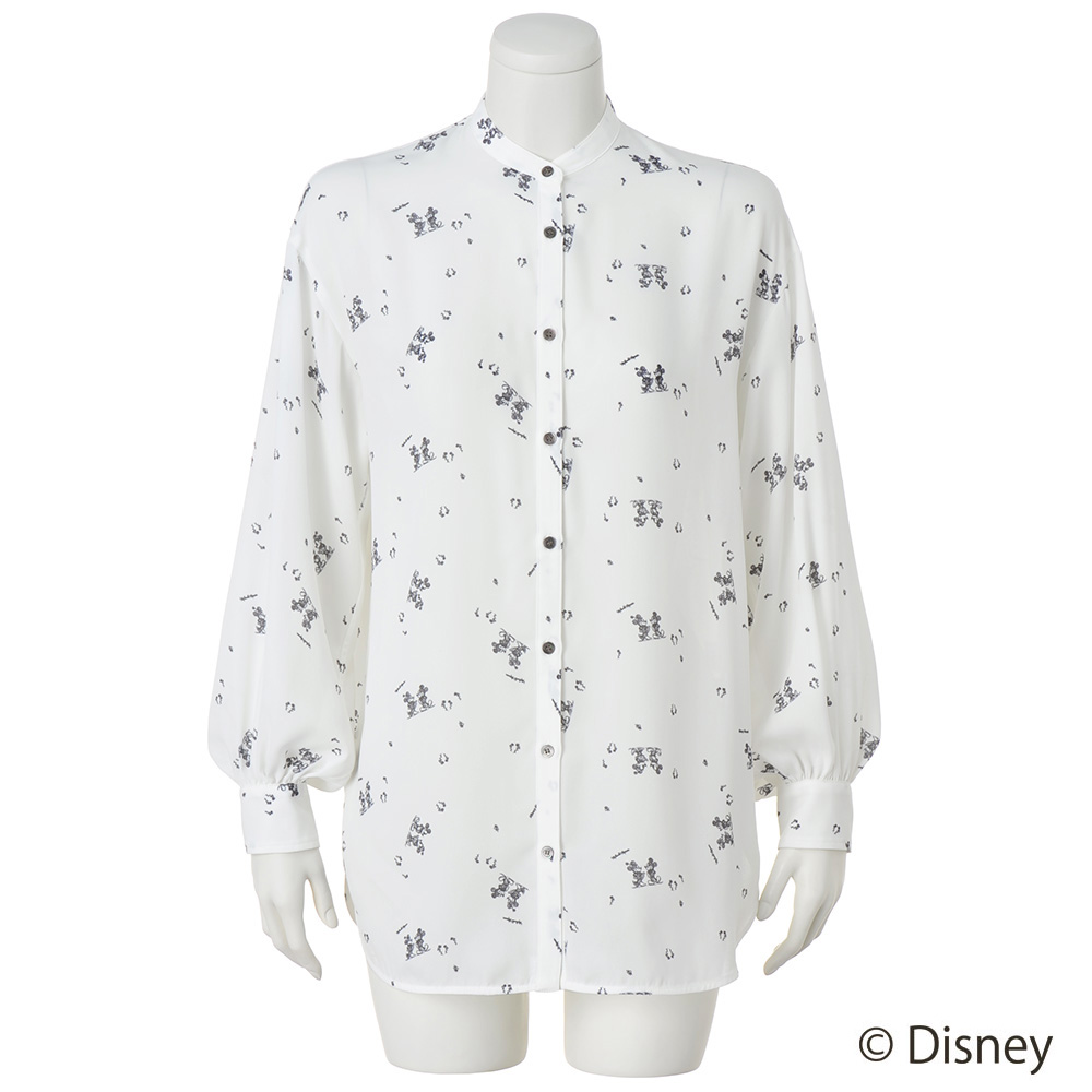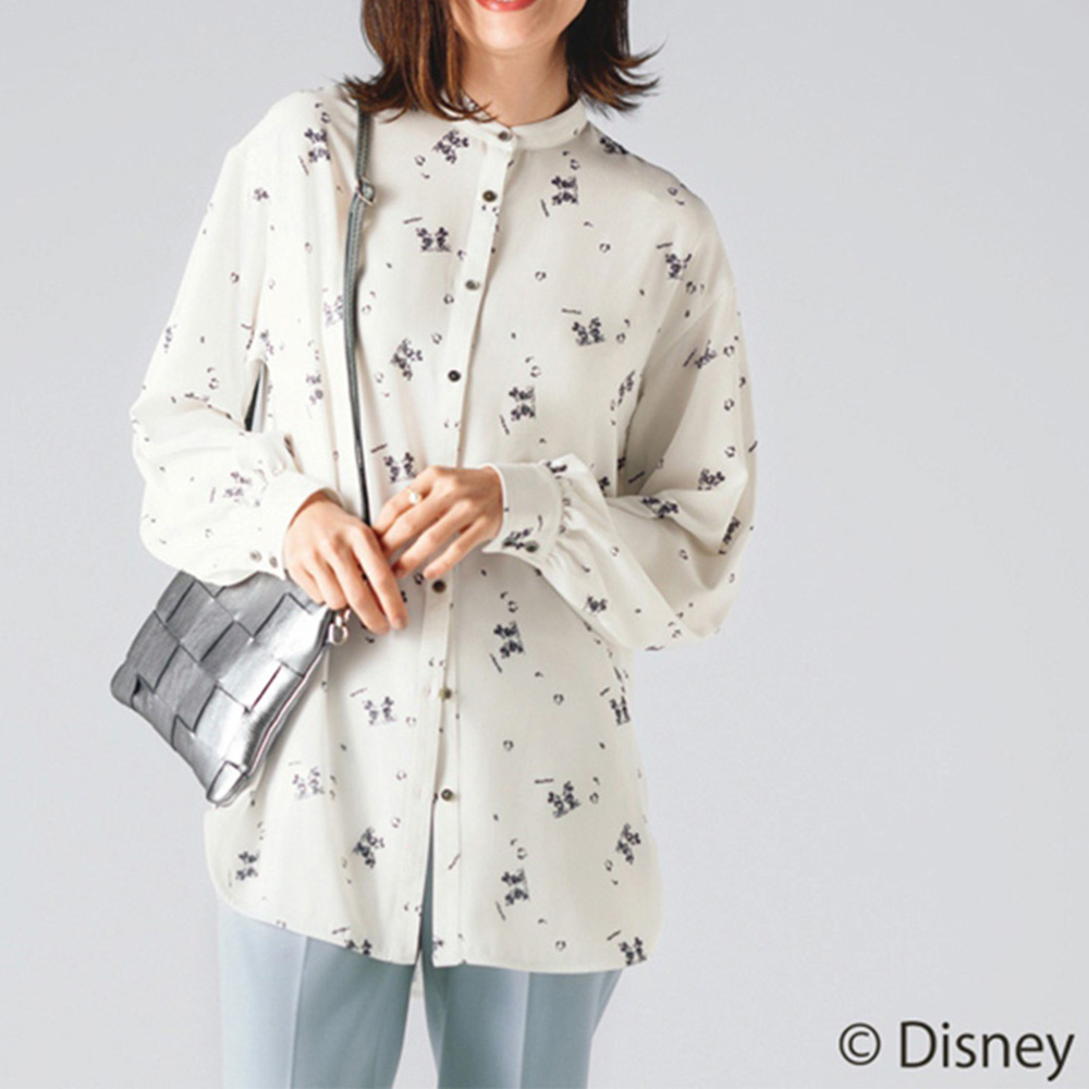 スタイリッシュな装いながら大人の遊び心をくすぐるミッキー&ミニープリントアンティーク調のオールドミッキーをモノトーンで表現。柄も配置も大人の装いになじむようにこだわったSo close,オリジナルのプリントです。とろみのある生地と、背中と袖にギャザーを入れたゆったりシルエットで、軽やかに羽織れるバンドカラーのブラウスです。