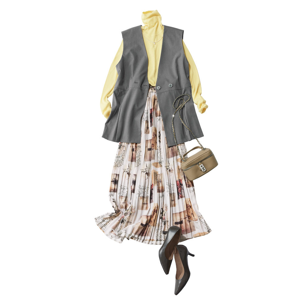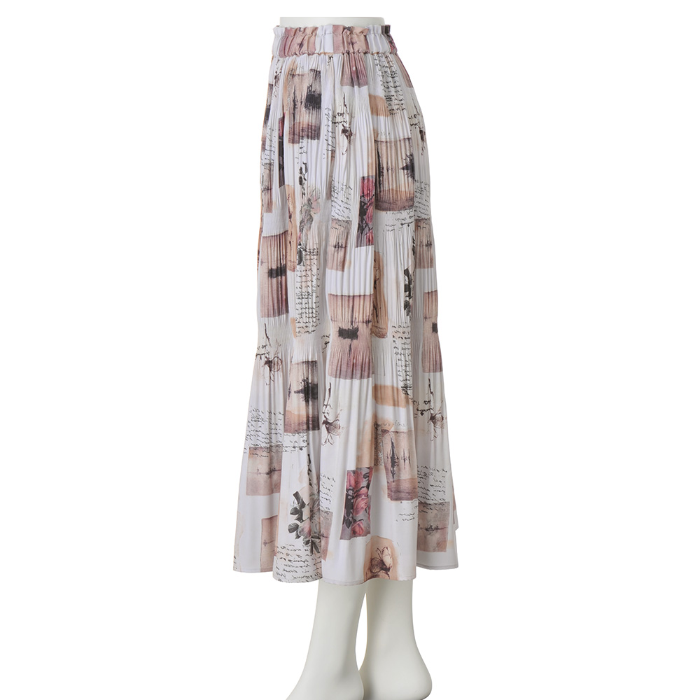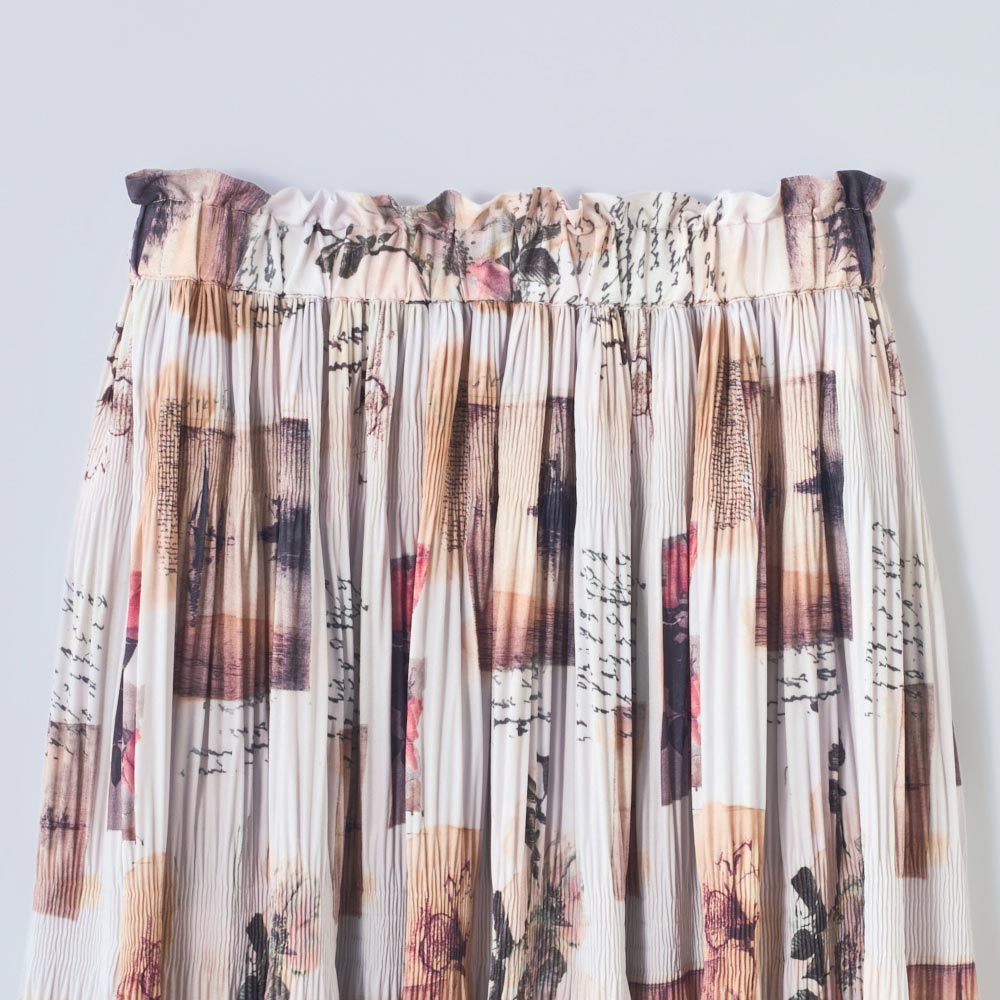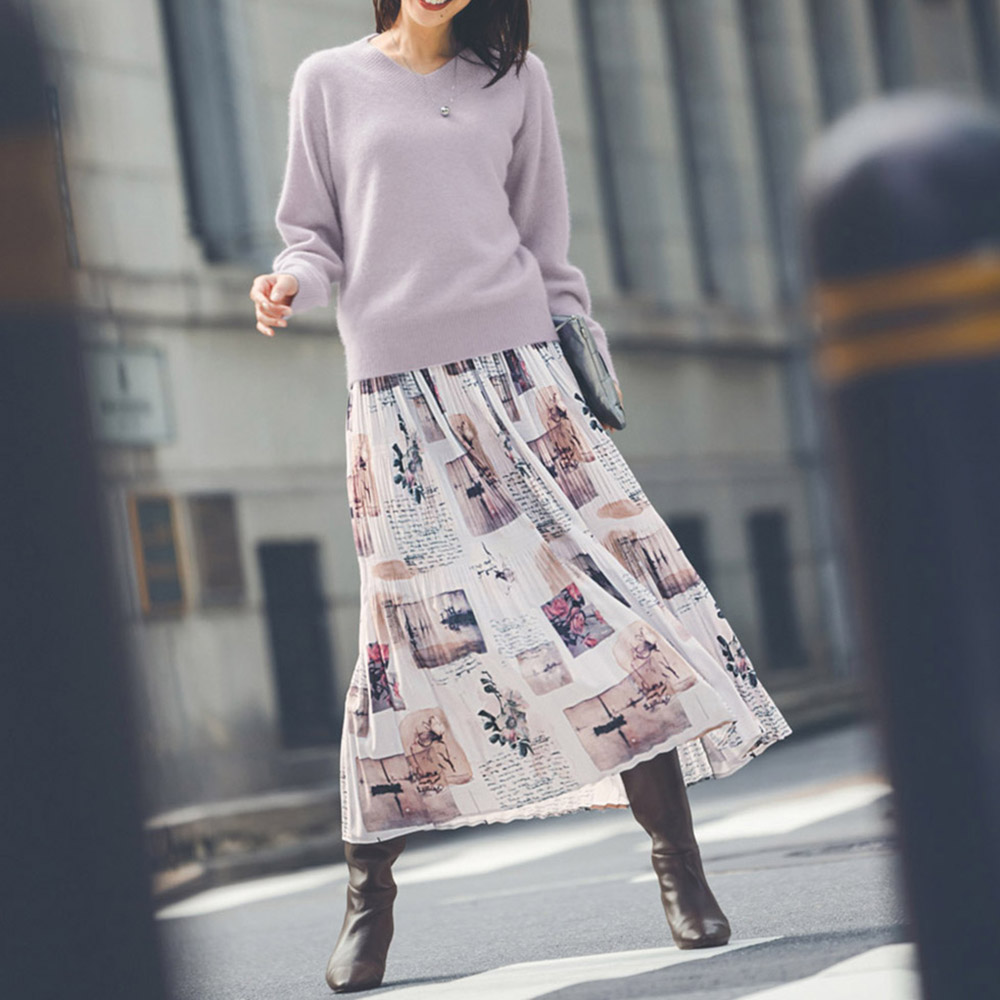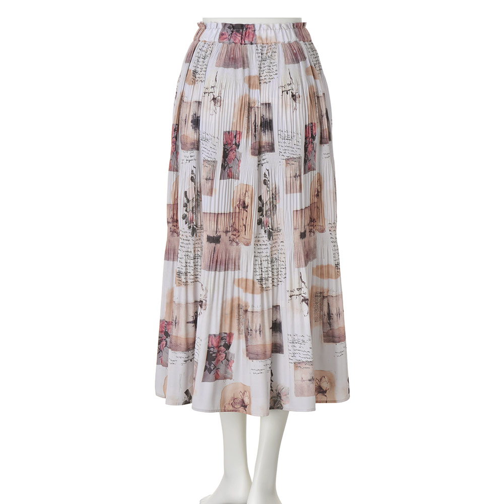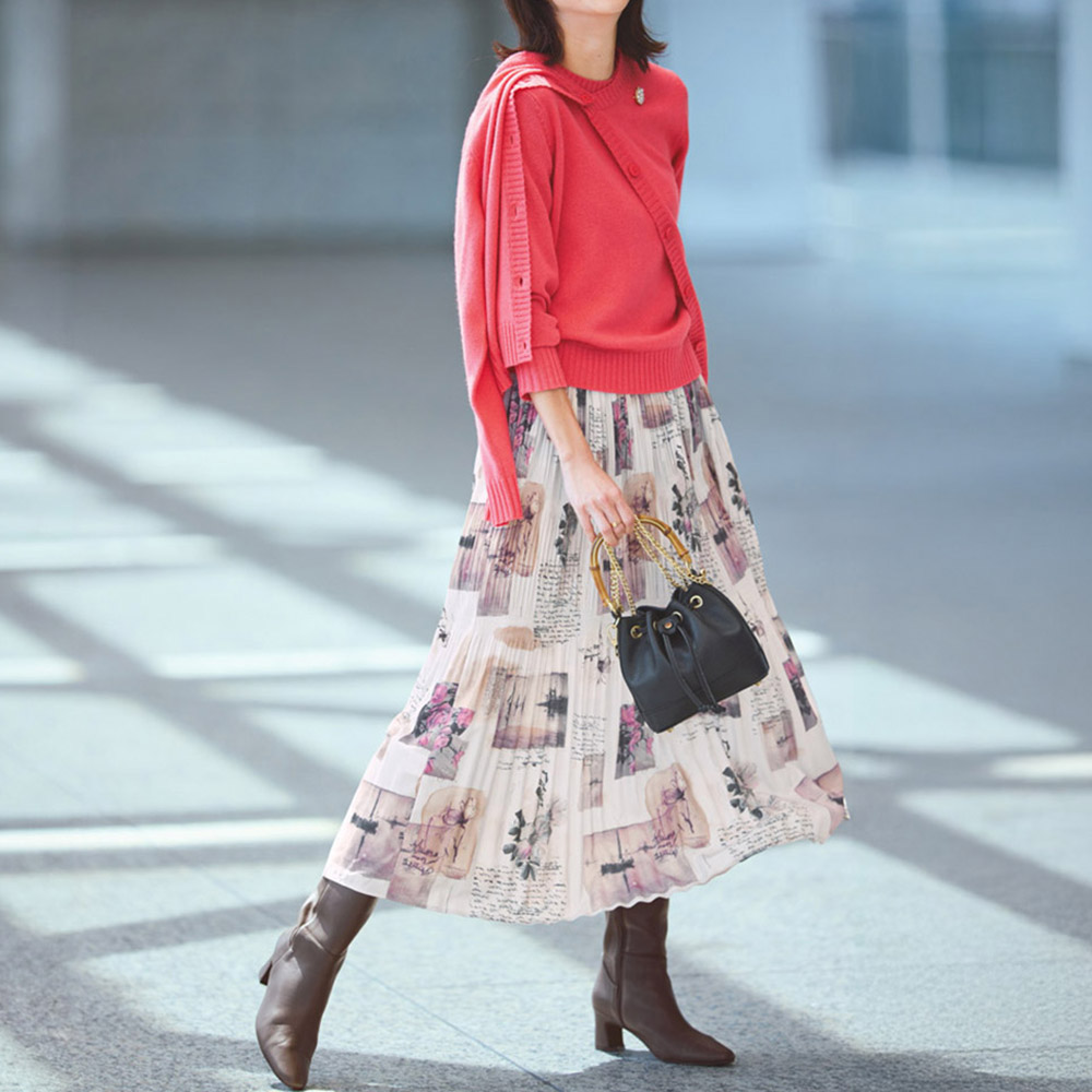 艶めきLady服一点投入で気分が上がる、“Lady”なアイテム。サテン地に水彩画風の風景プリントをのせた個性的なスカート。マジョリカプリーツというランダムにかける手法で、大人可愛い印象に。ベースがオフベージュなのでコーディネートしやすいのもポイントです。