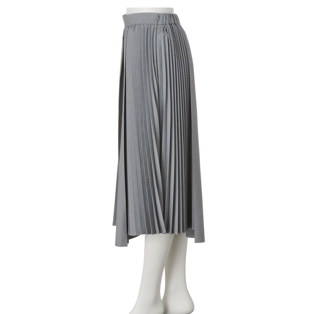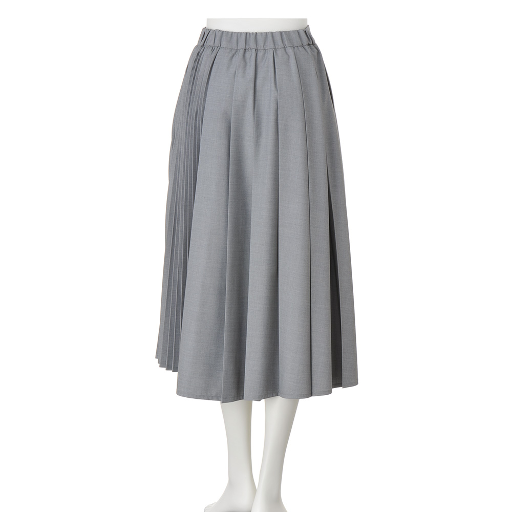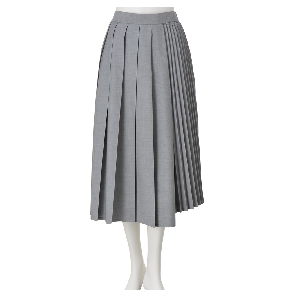 きちんと見えする生地感にレディなデザインが映える幅広のタック使いをベースに、左脇に細いプリーツを組み合わせデザイン性を高めた、アシンメトリーなスカート。タック部分とプリーツ部分で裾に段差をつけたイレギュラーヘムもポイント。動くたびに裾やプリーツが揺れ、華やかさを印象づけてくれます。
