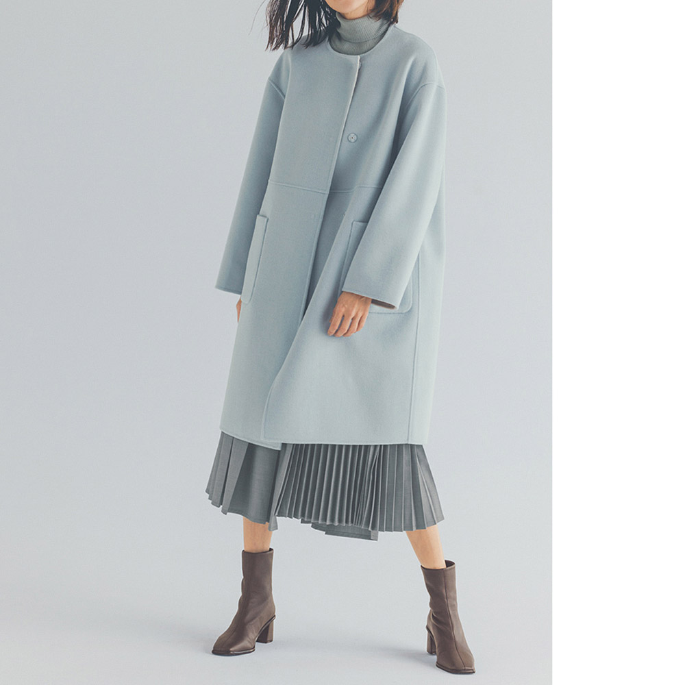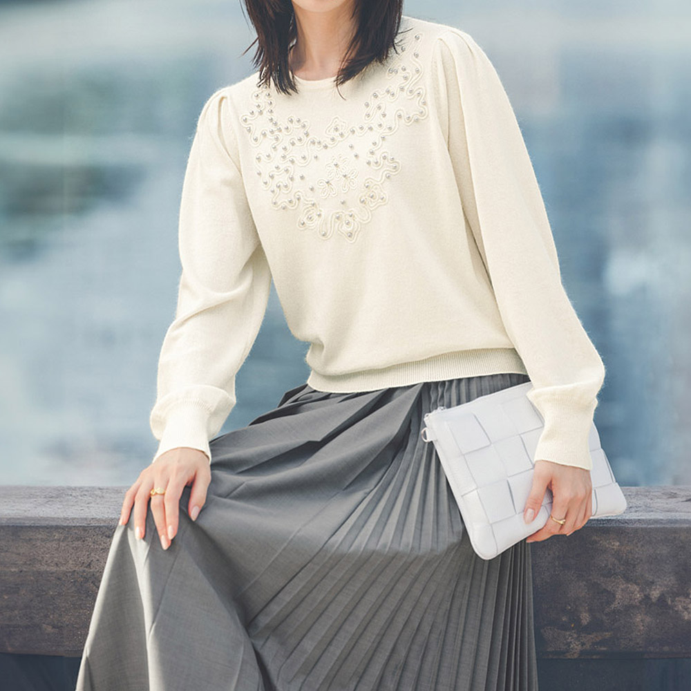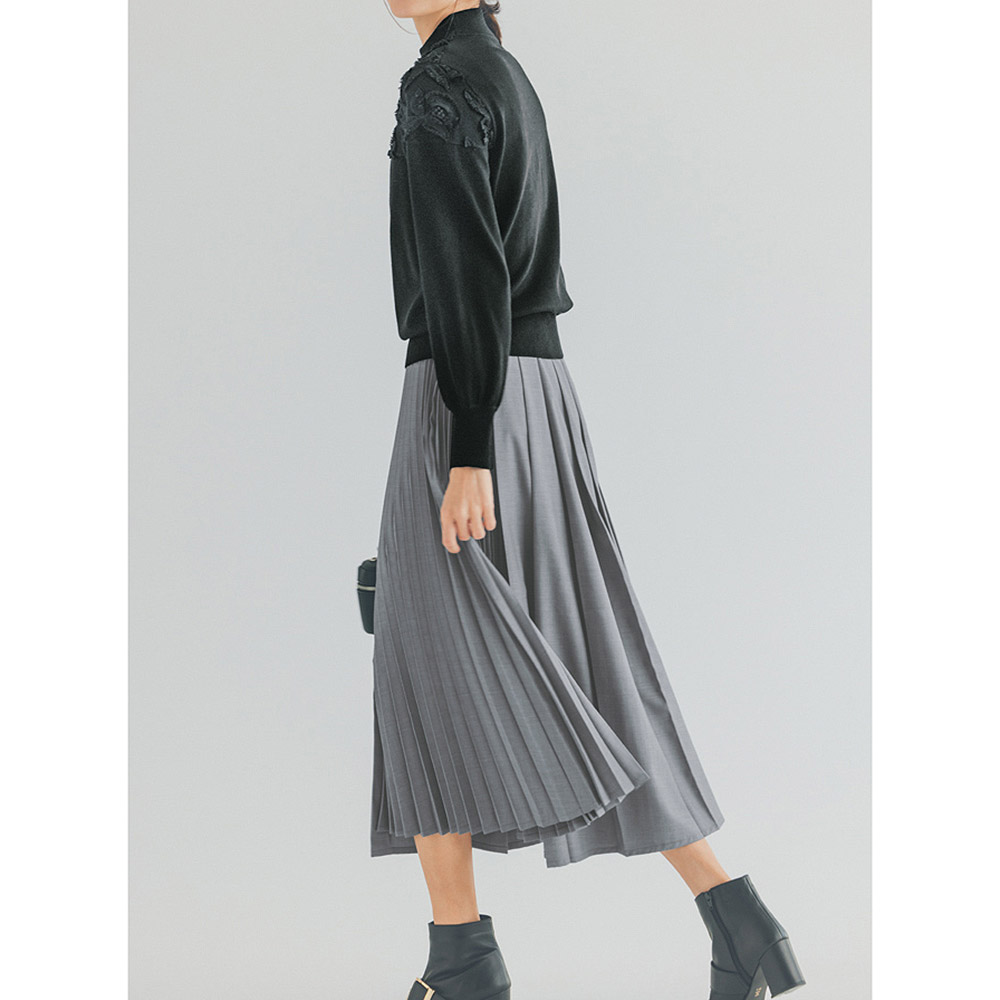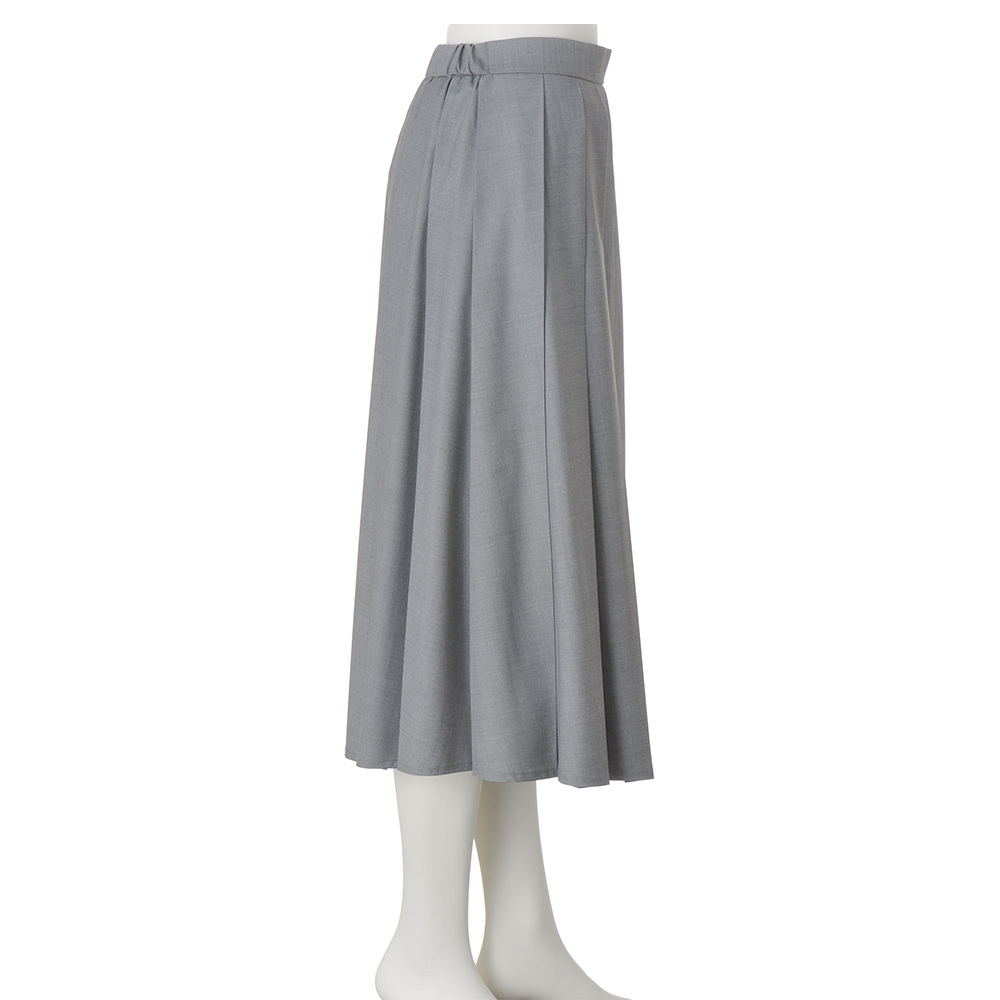きちんと見えする生地感にレディなデザインが映える幅広のタック使いをベースに、左脇に細いプリーツを組み合わせデザイン性を高めた、アシンメトリーなスカート。タック部分とプリーツ部分で裾に段差をつけたイレギュラーヘムもポイント。動くたびに裾やプリーツが揺れ、華やかさを印象づけてくれます。