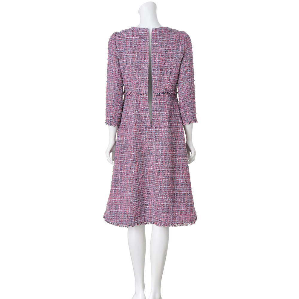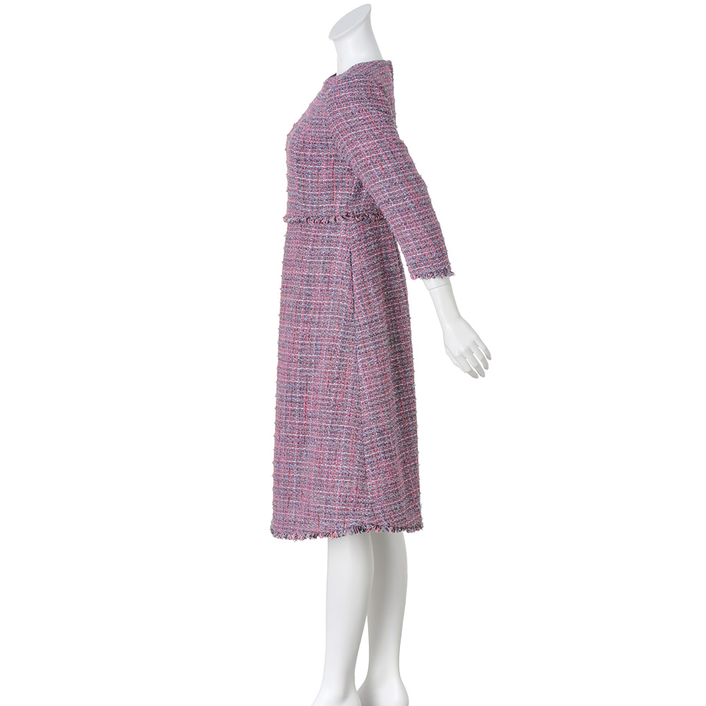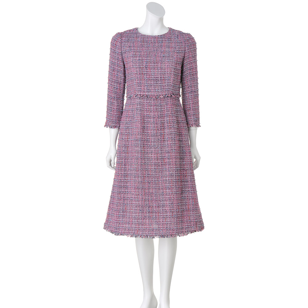 インポートならではの繊細な糸使いが魅力のツイードワンピースイタリア「GIOLICA」社製の複雑な色合いのファンシーツイードを使ったワンピース。立体的なパネル切り替えと仕立てで、フィット&フレアシルエットを表現し、女性らしさを演出します。裾、袖口、ウエスト切り替えをフリンジ仕様にし、遊び心もプラスしています。