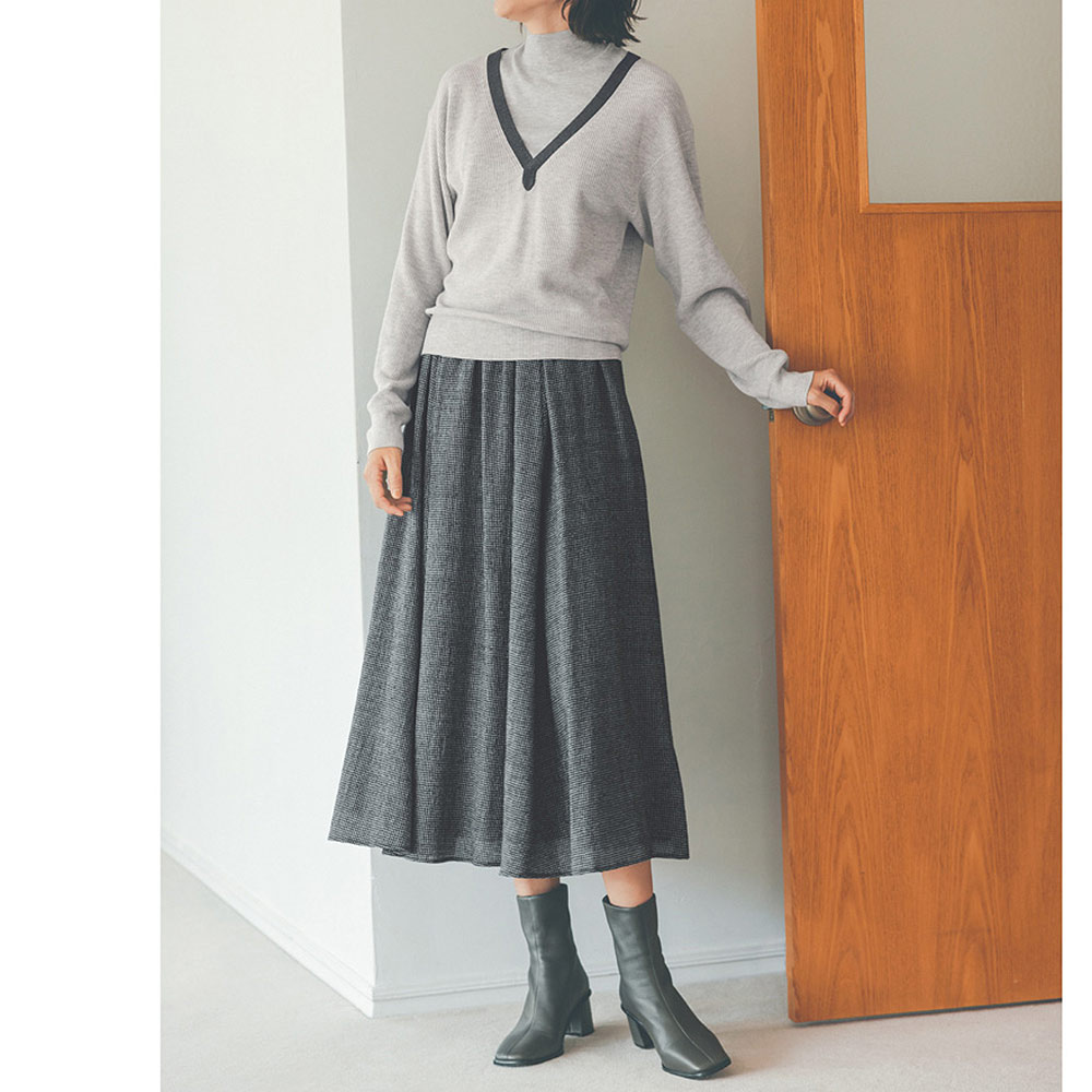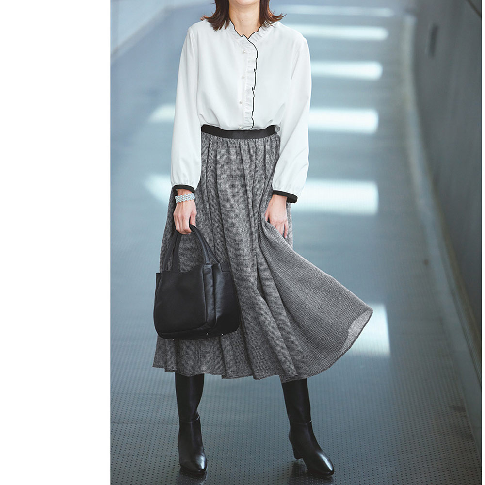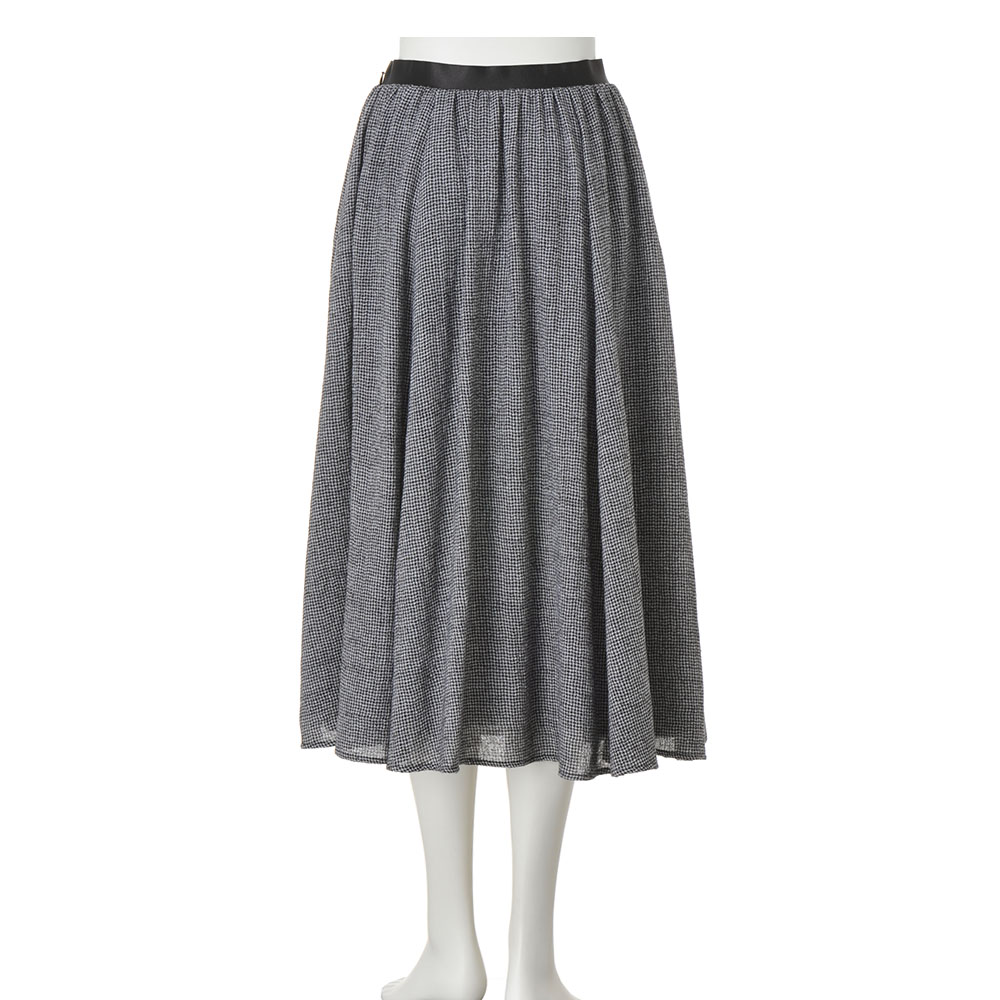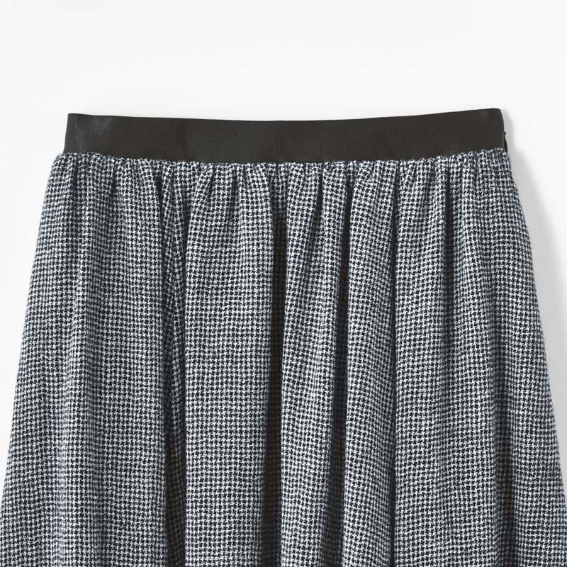 私を心地よくしてくれる服を着て、さあ、今日はどこに行こう6枚接ぎのボリューム感で動くたびドラマティックに揺れるギャザースカート。ウエストはブラックのサテンゴムを配し、トップスをインしたときにもさまになり、着脱の楽さも兼備。