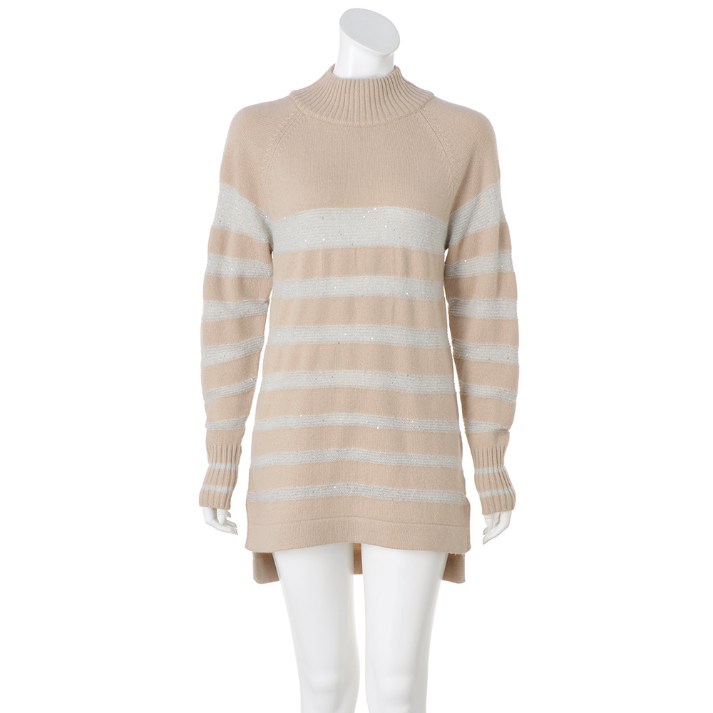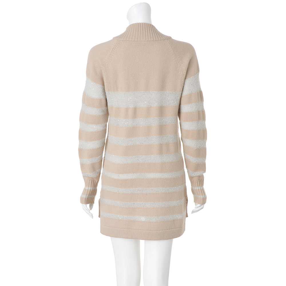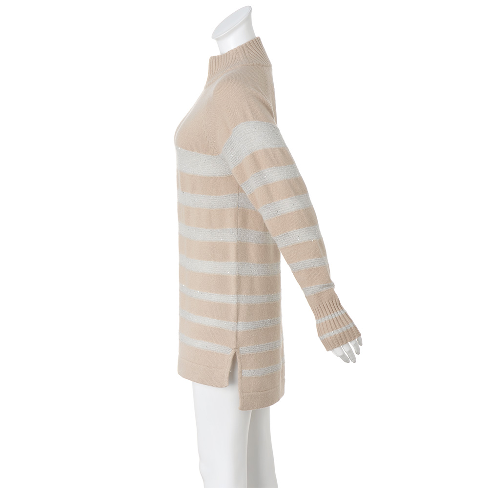 細部にこだわったボーダーはどことなく品のよさを感じる一着 カジュアルになりがちなボーダー柄を、ベージュ×ライトグレーの配色で洗練された印象に。さらに裾に向かうにつれてピッチ幅を狭くし、変化を持たせました。ハイネックで首元はあたたかく、お尻が隠れる丈感で前後差のあるデザインが◎。