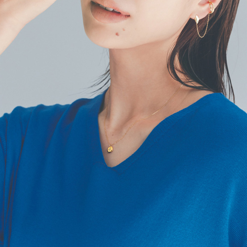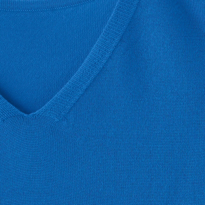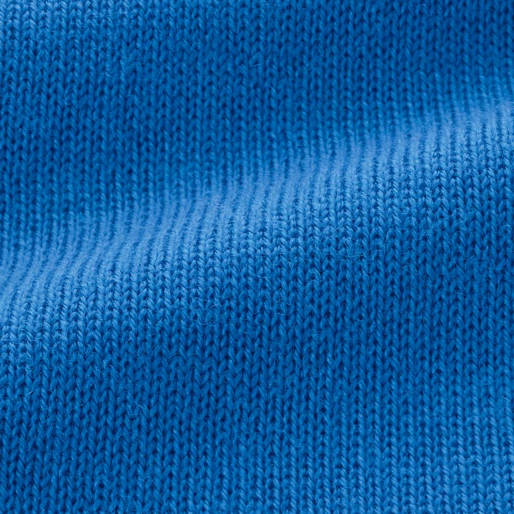 • (イ)ブルー 首まわりの襟端は続きの総針編みですっきり。控えめなVネックが上品。
