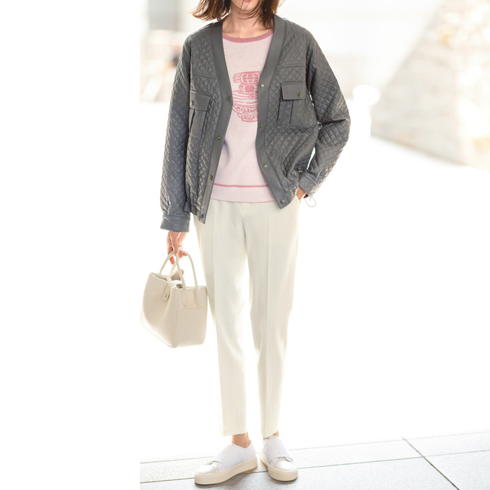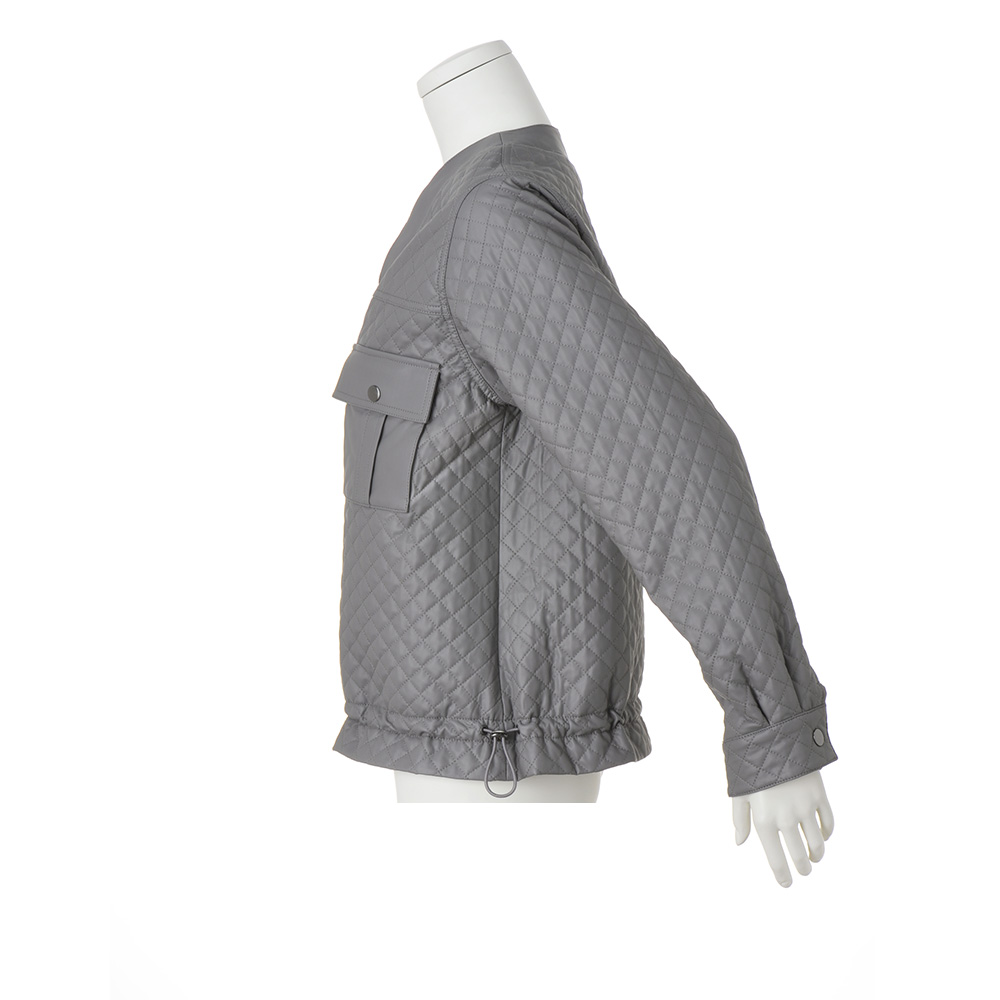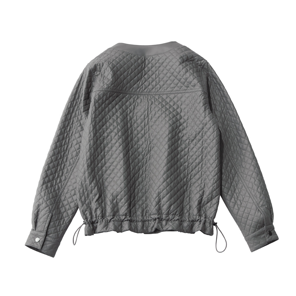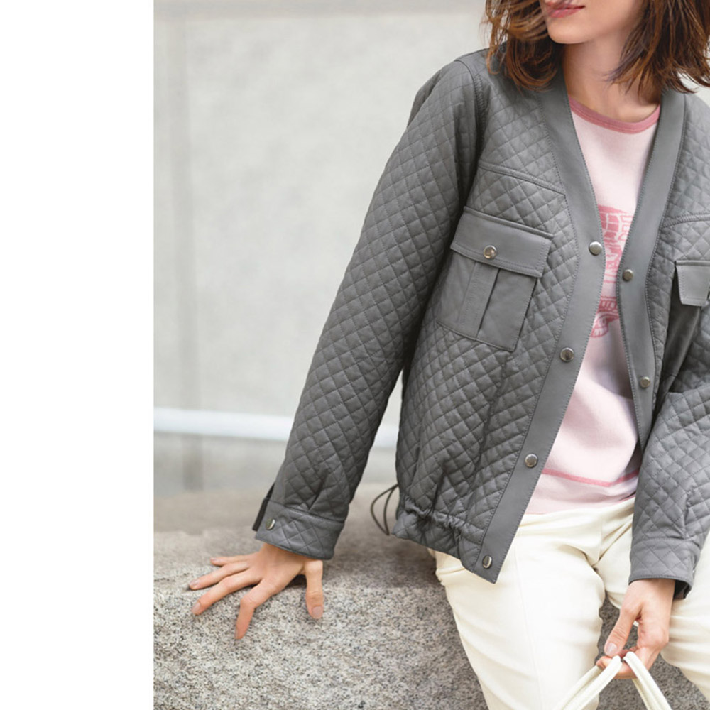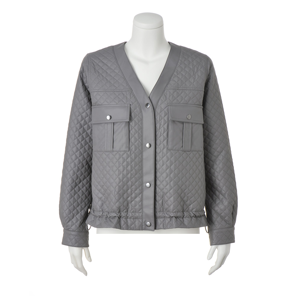 ―感度の高い配色で見せる微糖カジュアル―どんな装いもセンスが高まる表情豊かなレザー調ブルゾン「THINDOWN(シンダウン)」素材を、レザー調の軽やかな生地に重ねてキルトステッチをほどこして。ゆるっと羽織れるシルエットながら着ぶくれ感がなくすっきり着られ、裾のドロストを調整して変化を楽しむこともできます。やさしいグレーでフェミニンな仕上がりに。 「THINDOWN(シンダウン)」とは…世界初のシート状に加工されたダウン。ダウンを布帛でサンドし、一枚にしたもの。薄くてもあたたかさはキープ!ダウン特有の羽毛の吹き出しもなく、軽いのが魅力。