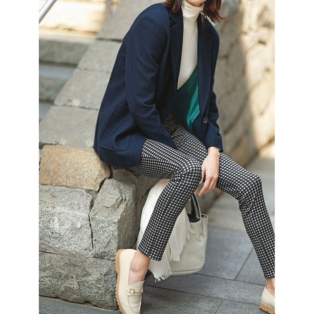 はき心地のよさでも人気!伸縮性が高い横ストレッチの生地を使い、ウエストはプルオンタイプ、トップスをインしても着られるベルトループデザインと、はき心地ときれいめのデザインにこだわった人気のレギンスパンツです。ギンガムチェックは繊細な柄ゆきで、無地感覚で着られるのもポイント。
