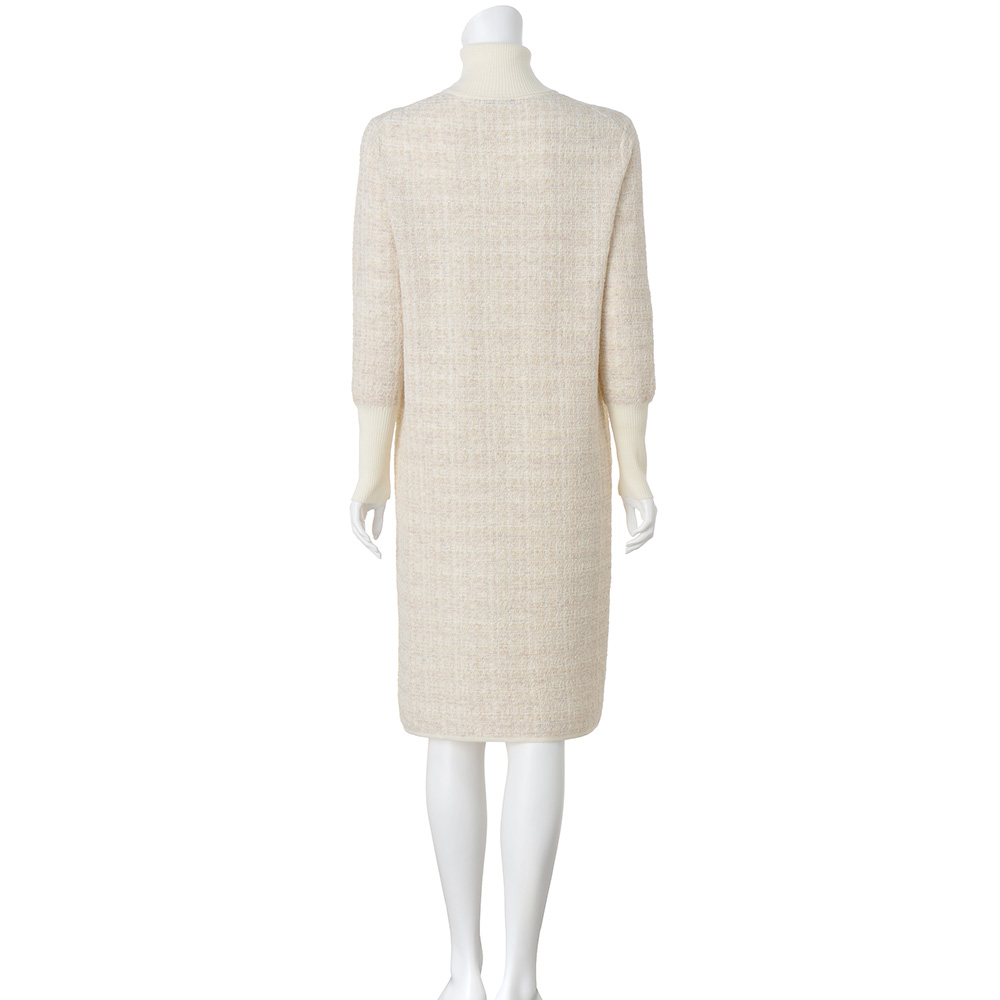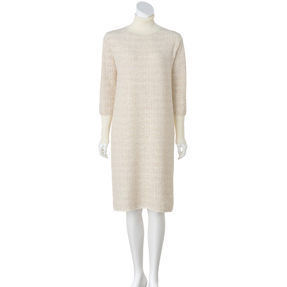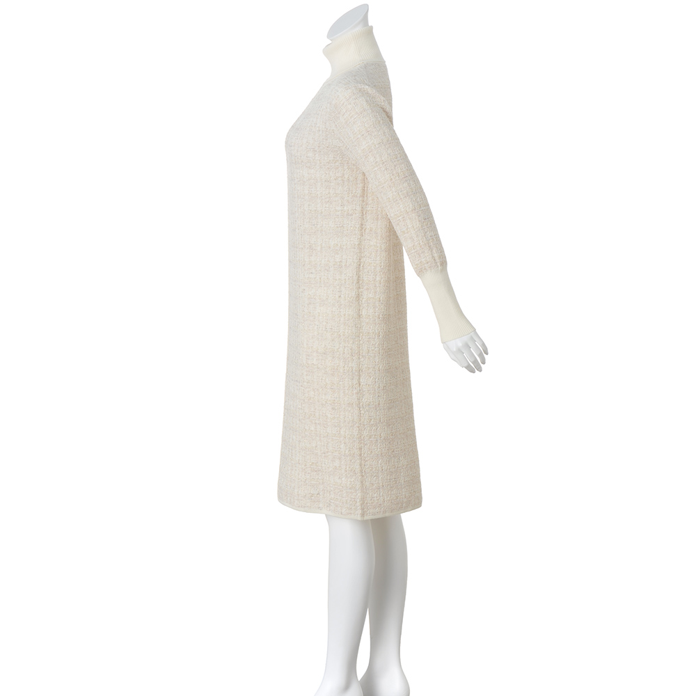 ―やさしさが香る―表現力のある糸やプリントが装いを柔らかに魅せて凹凸感のあるブークレ糸、光沢を持つラメ糸、ふくらみのあるウールブレンド糸を使って表現したファンシーツイード調の編み地がフェミニン。ゆとりのある楽なワンピースながら、編み地のインパクトで可憐なおでかけ服に。襟、袖口はオフホワイトのリブ編みで印象を引き締めています。