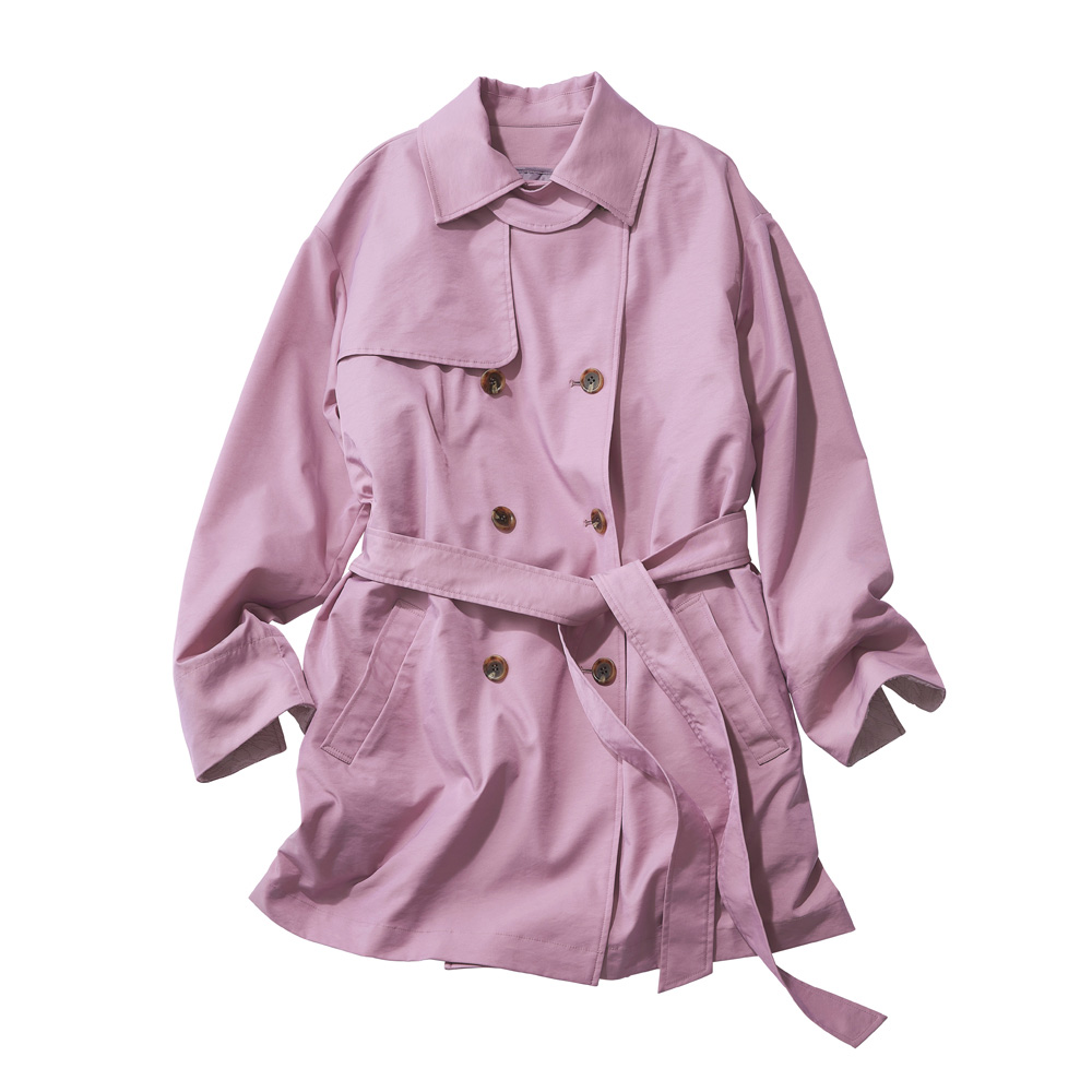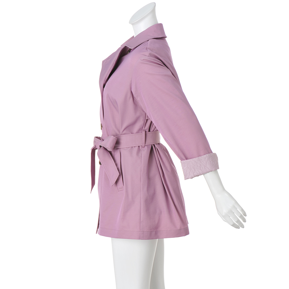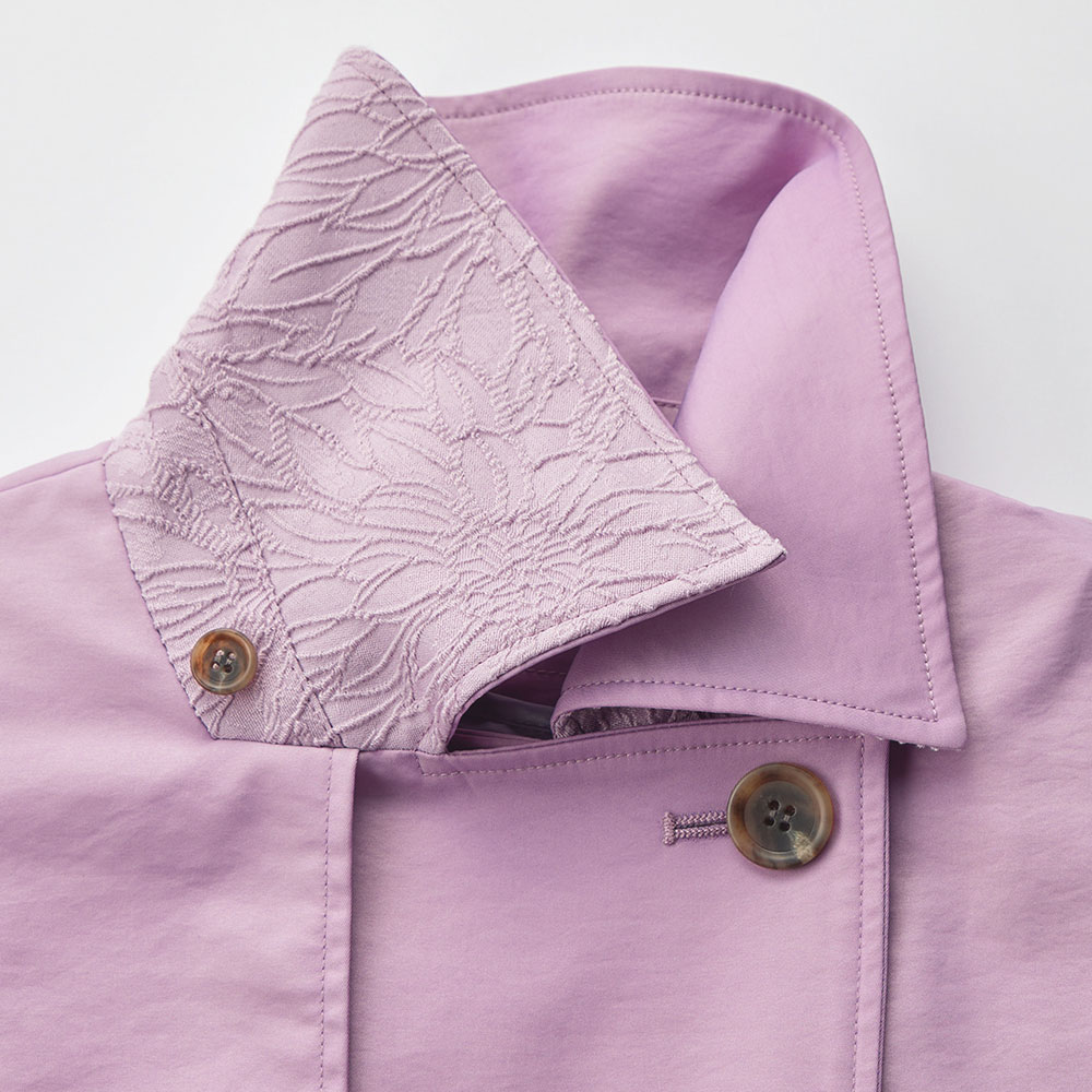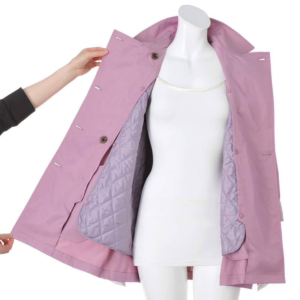 ぱっと華やぐカラーを纏っていきいきとした印象に導く上品な微光沢素材がエレガントなトレンチコート。襟裏と袖口見返しに配したジャカードがさり気ないアクセントに。ウエストを共布のベルトで締めるとドレッシーに、外すとボックスシルエットでカジュアルにも着られ幅広く楽しめます。取り外し可能な中わた入りのライナーつきで、ロングシーズン活躍。