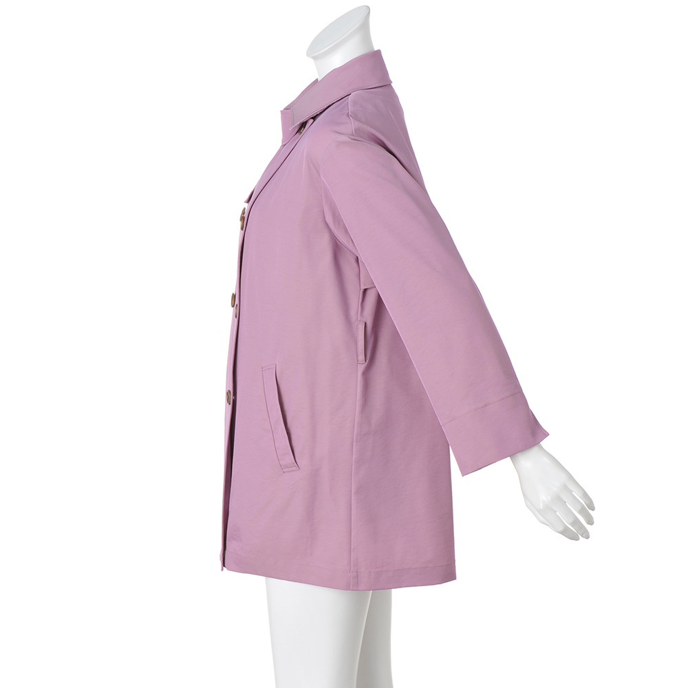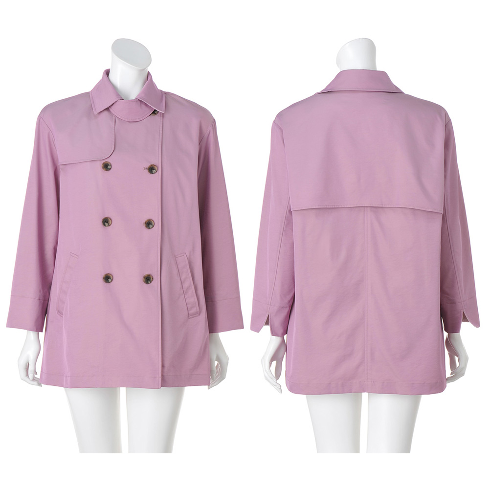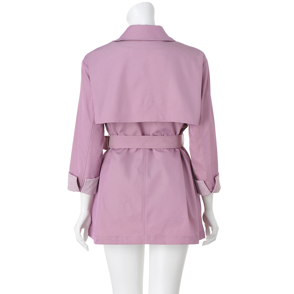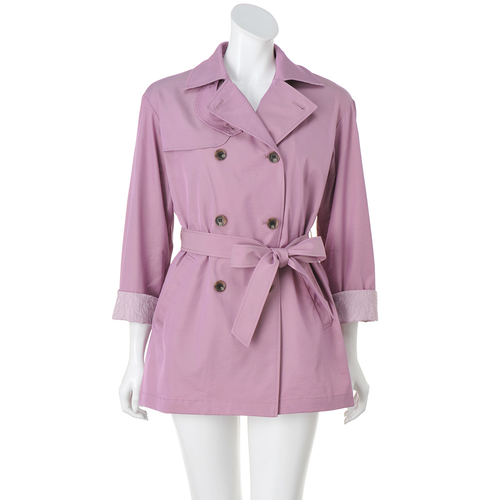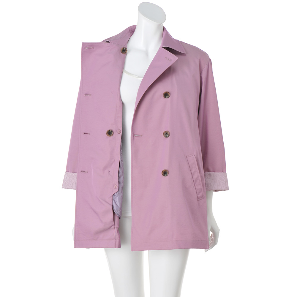 ぱっと華やぐカラーを纏っていきいきとした印象に導く上品な微光沢素材がエレガントなトレンチコート。襟裏と袖口見返しに配したジャカードがさり気ないアクセントに。ウエストを共布のベルトで締めるとドレッシーに、外すとボックスシルエットでカジュアルにも着られ幅広く楽しめます。取り外し可能な中わた入りのライナーつきで、ロングシーズン活躍。