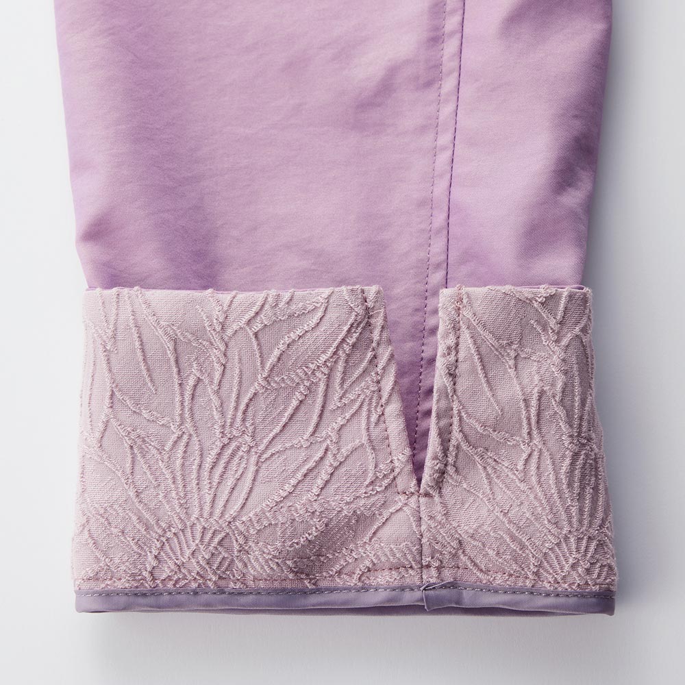 • 襟裏と袖口見返しには花柄のジャカード生地を使用し、華やかさを演出。
