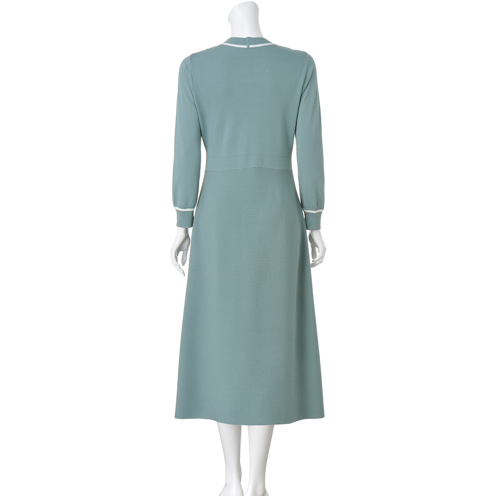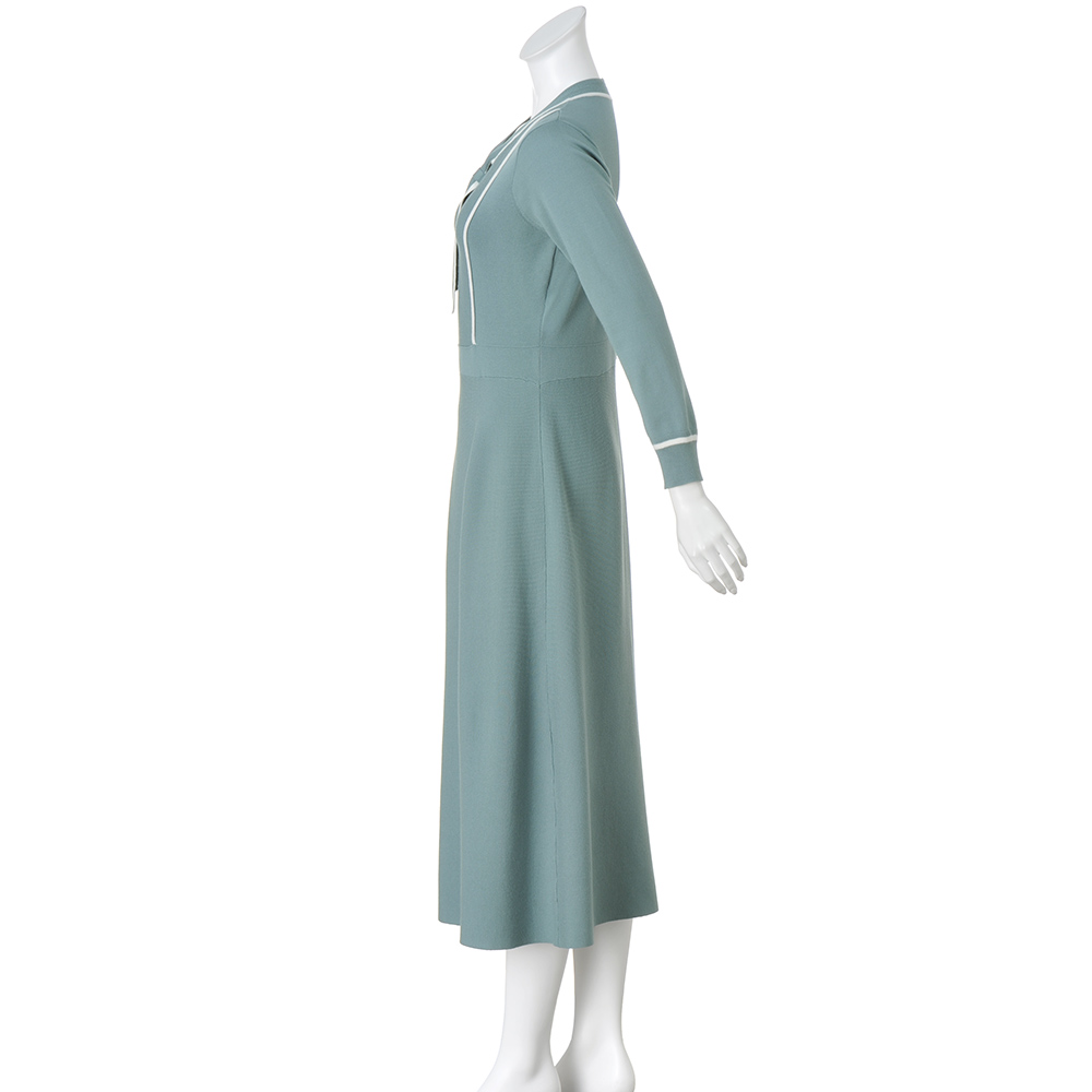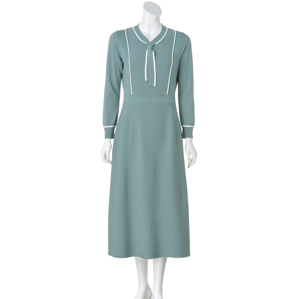 ミントブルーにクリーンなホワイトの配色が、爽やかな空気を連れてきてくれるワンピース。ウエスト位置を高めで切り替えたフィット&フレアシルエットが美しい。ボウタイデザインは左右で長さを変え動きを出しています。